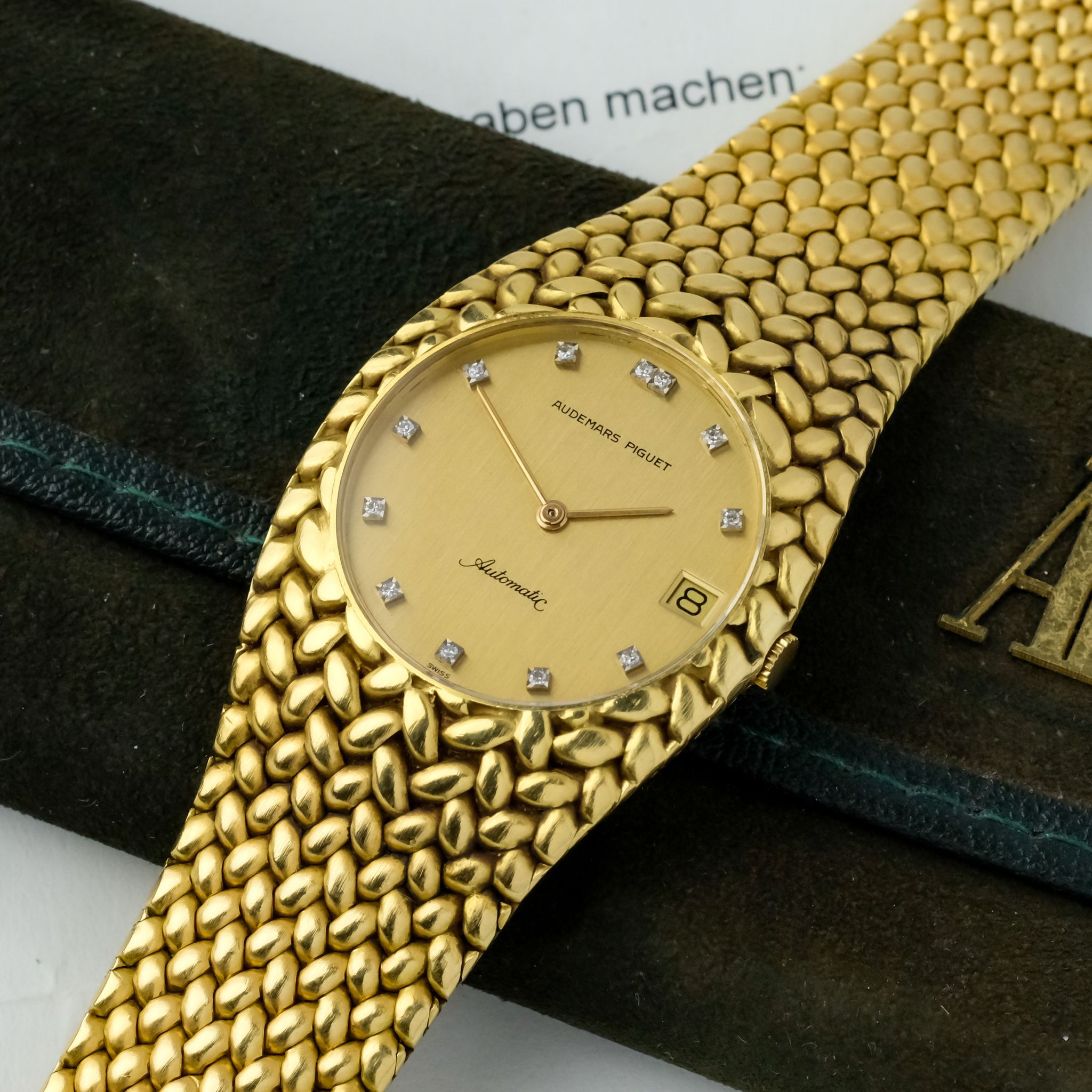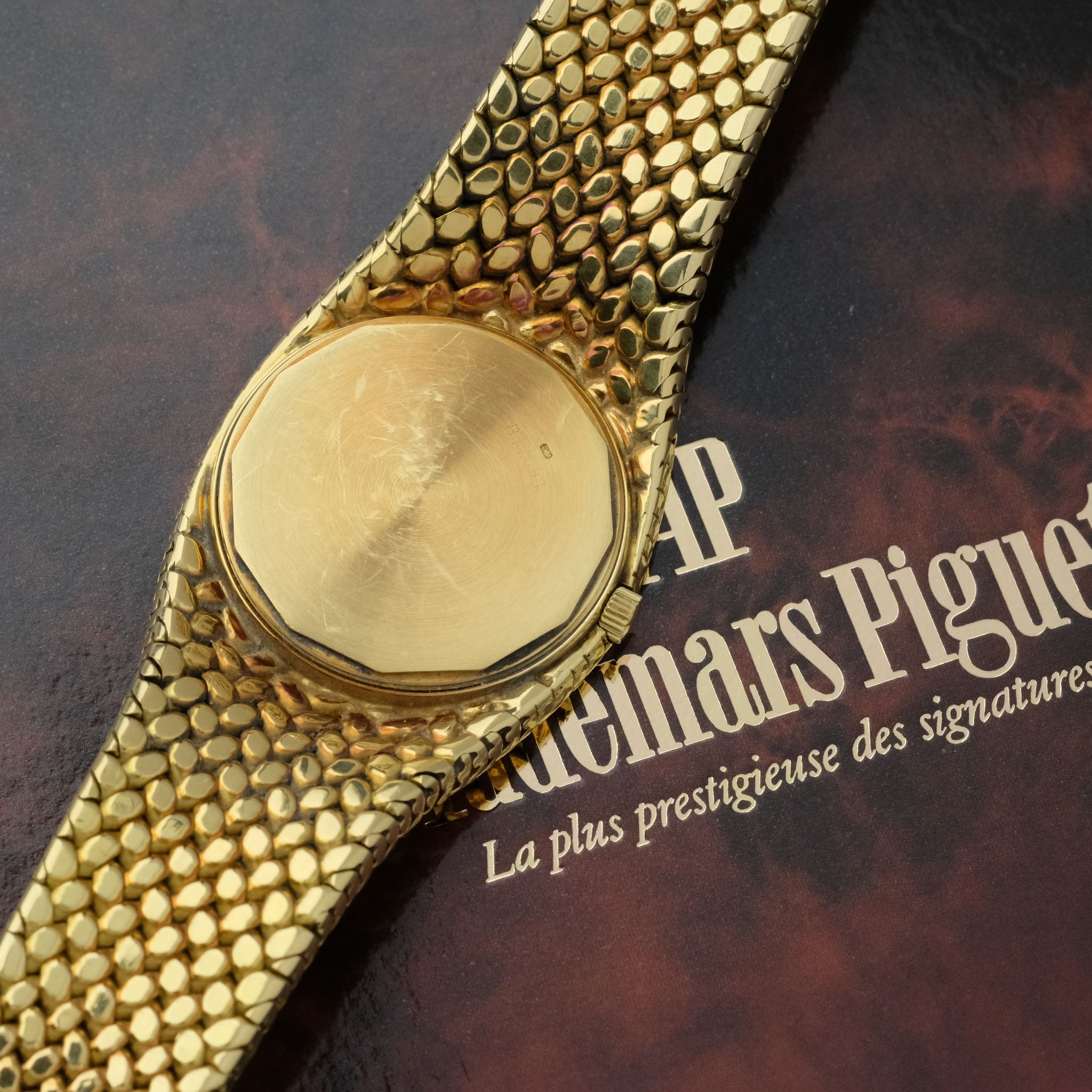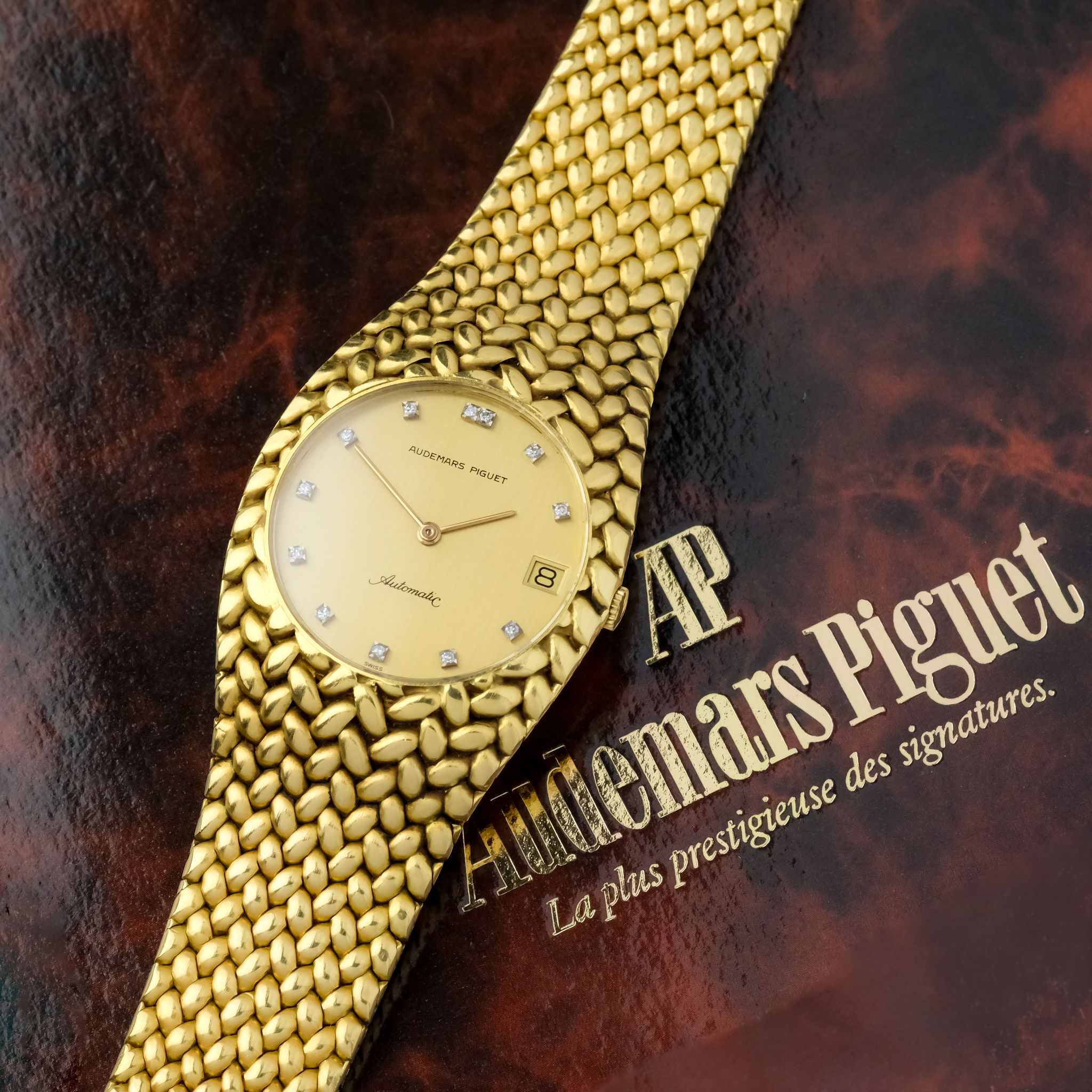 An exceptional and highly collectible piece from Audemars Piguet’s archives, the Cobra Ref. 5403 stands out as one of the maison’s most daring and innovative designs from the golden era of integrated bracelet watches. Crafted entirely in solid 18k yellow gold, the Cobra embodies avant-garde luxury with its unique flowing case and bracelet architecture, earning its name from the serpent-like aesthetic. This ultra-rare reference is elevated further by its sunburst golden dial, beautifully adorned with diamond-set indices, offering a touch of refined opulence while retaining AP’s hallmark elegance. Powered by a high-precision automatic movement, the watch blends technical excellence with striking aesthetics. Accompanied by Audemars Piguet service papers, an official extract from the archives, and its original AP leather pouch, this example represents a true grail piece for vintage AP collectors, rarely seen on the market and celebrated as a masterpiece of 1970s high horology design.