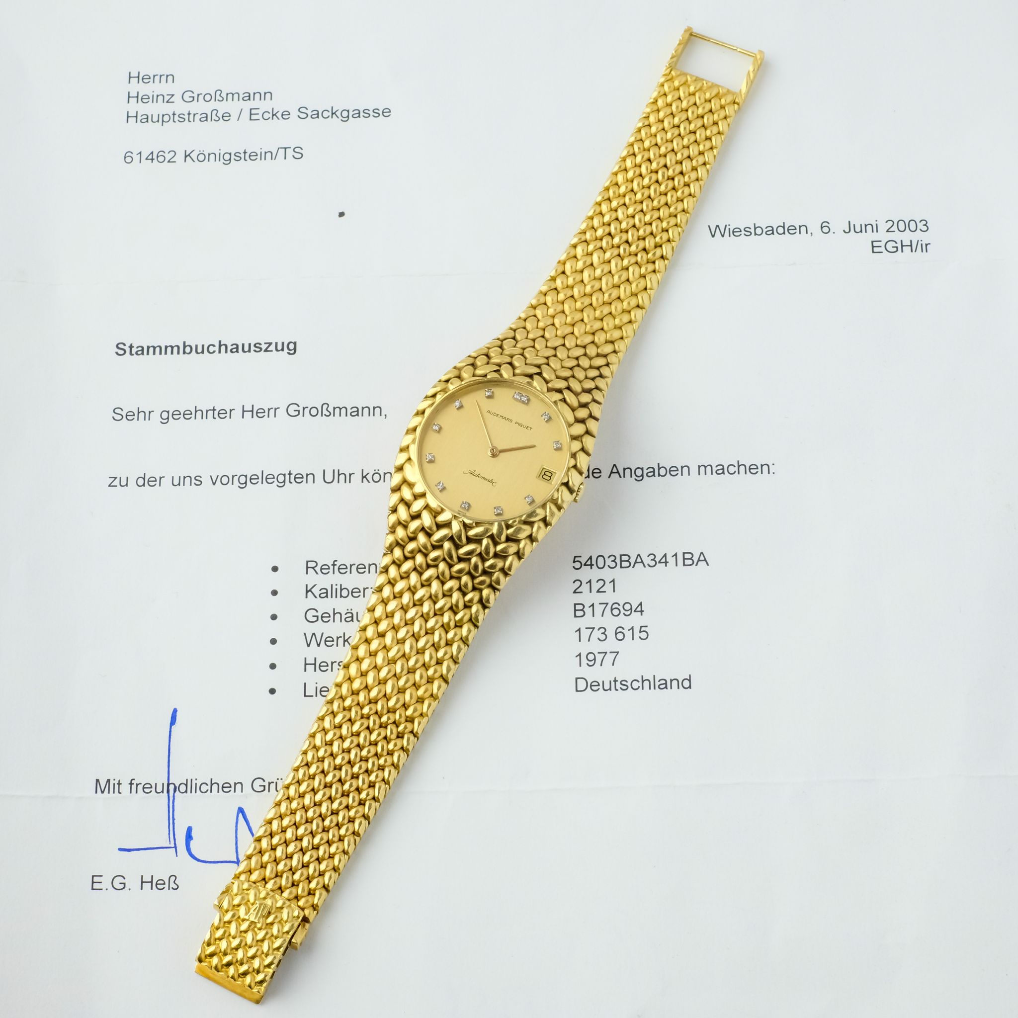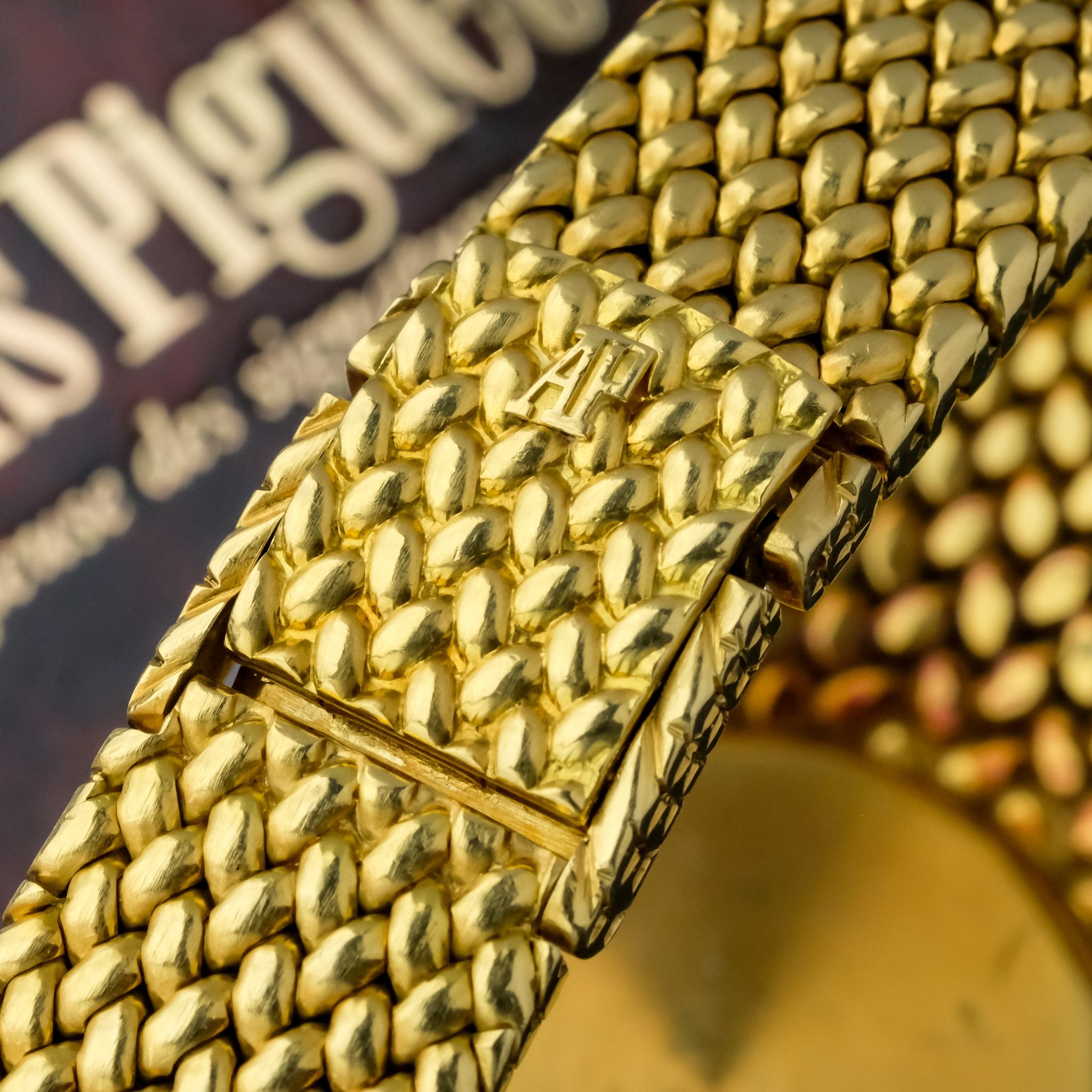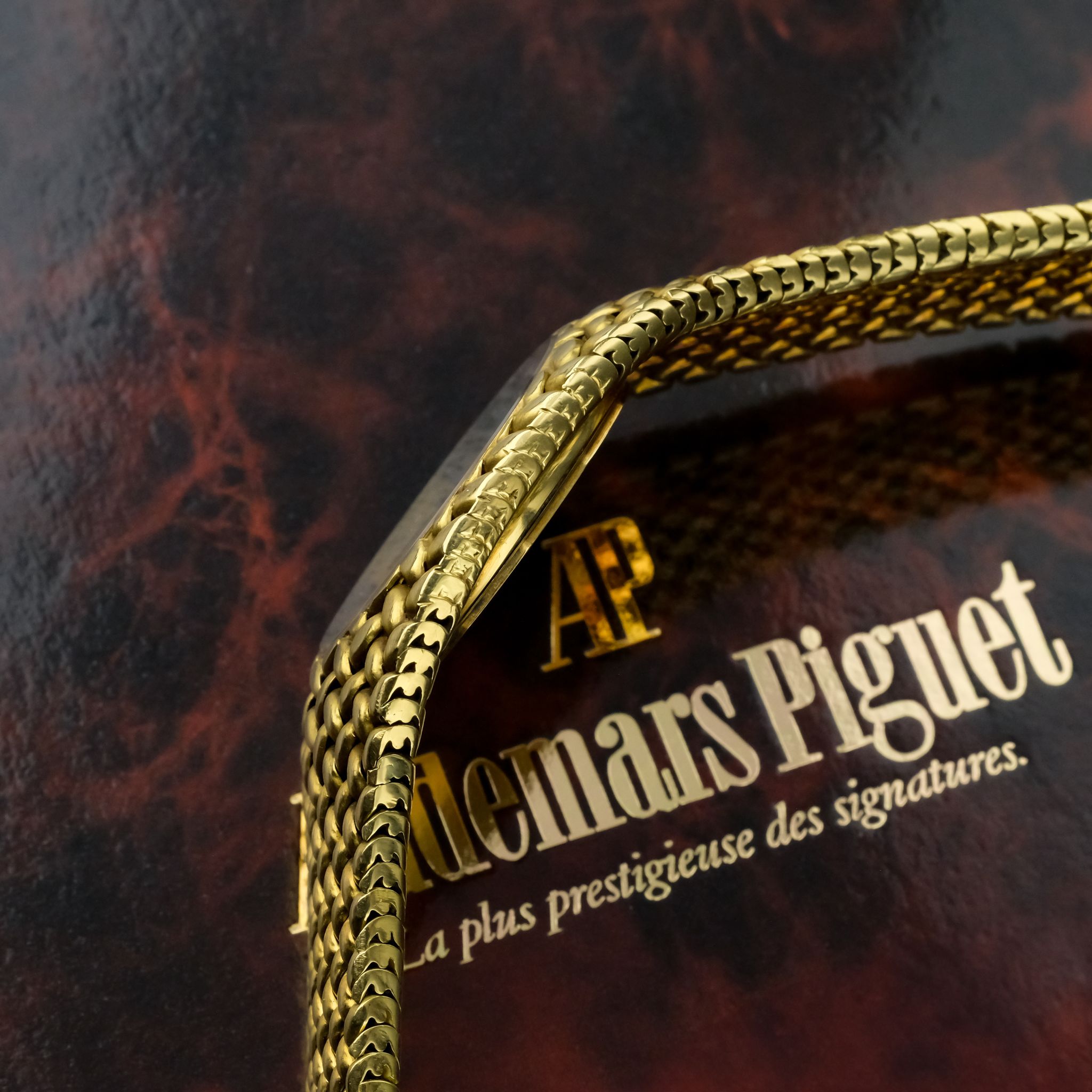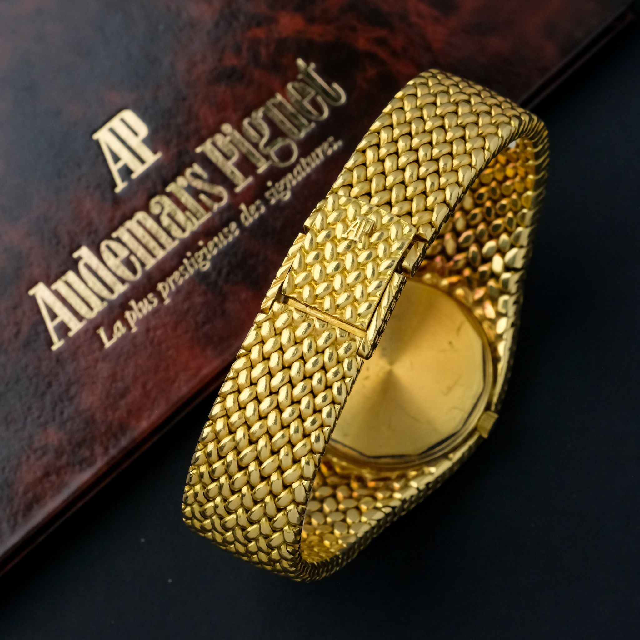 An exceptional and highly collectible piece from Audemars Piguet’s archives, the Cobra Ref. 5403 stands out as one of the maison’s most daring and innovative designs from the golden era of integrated bracelet watches. Crafted entirely in solid 18k yellow gold, the Cobra embodies avant-garde luxury with its unique flowing case and bracelet architecture, earning its name from the serpent-like aesthetic. This ultra-rare reference is elevated further by its sunburst golden dial, beautifully adorned with diamond-set indices, offering a touch of refined opulence while retaining AP’s hallmark elegance. Powered by a high-precision automatic movement, the watch blends technical excellence with striking aesthetics. Accompanied by Audemars Piguet service papers, an official extract from the archives, and its original AP leather pouch, this example represents a true grail piece for vintage AP collectors, rarely seen on the market and celebrated as a masterpiece of 1970s high horology design.