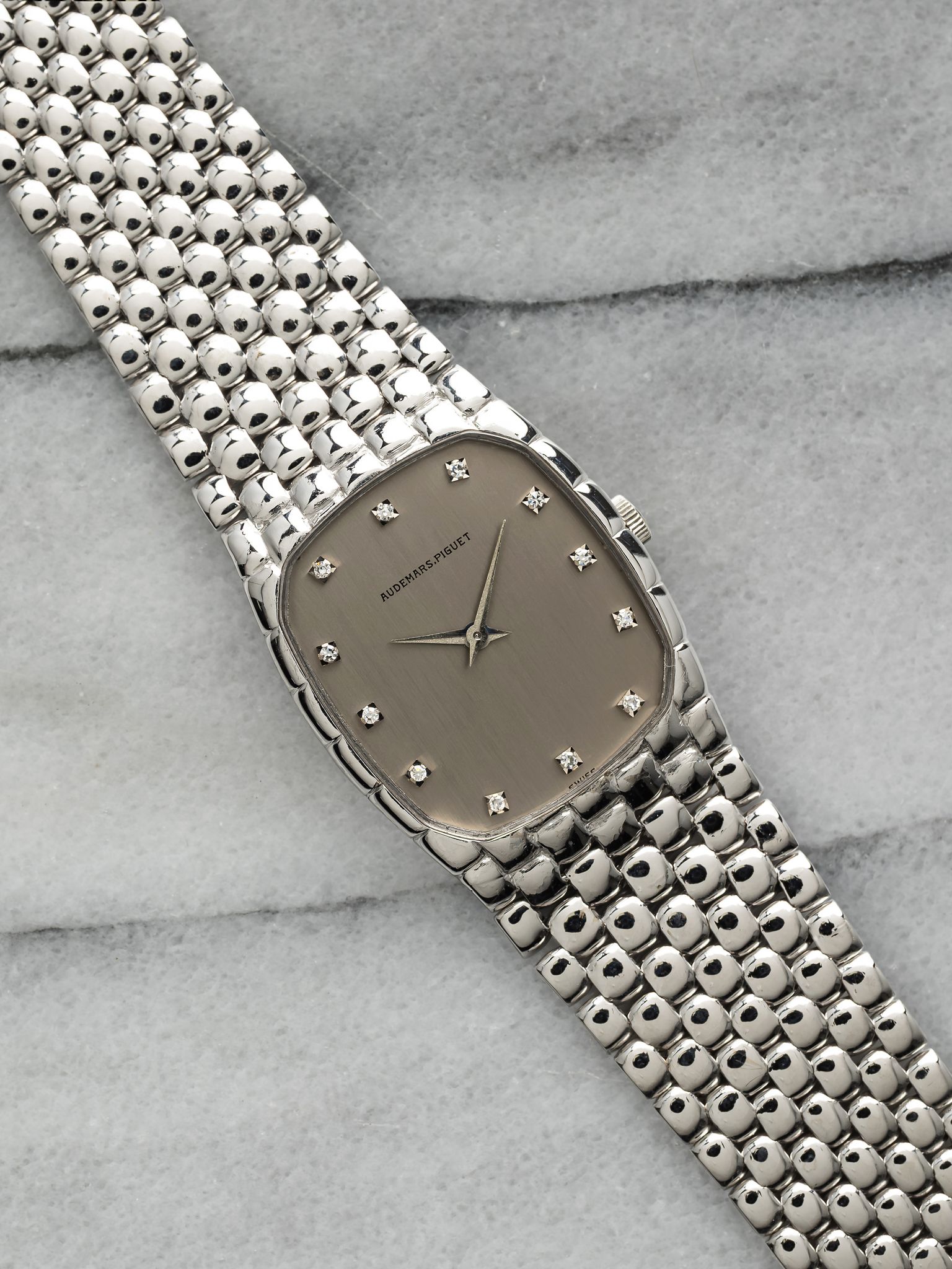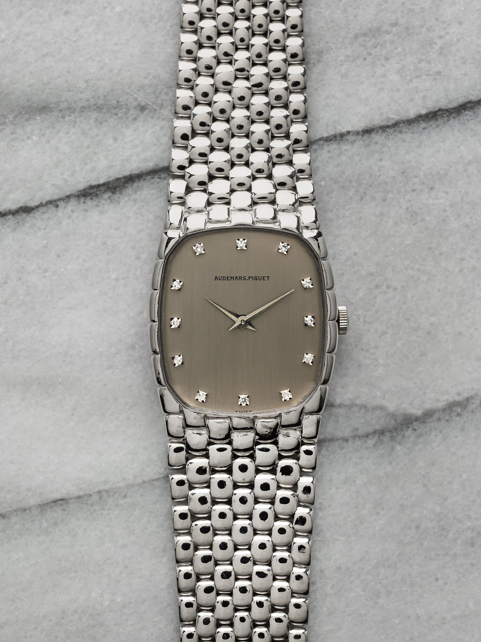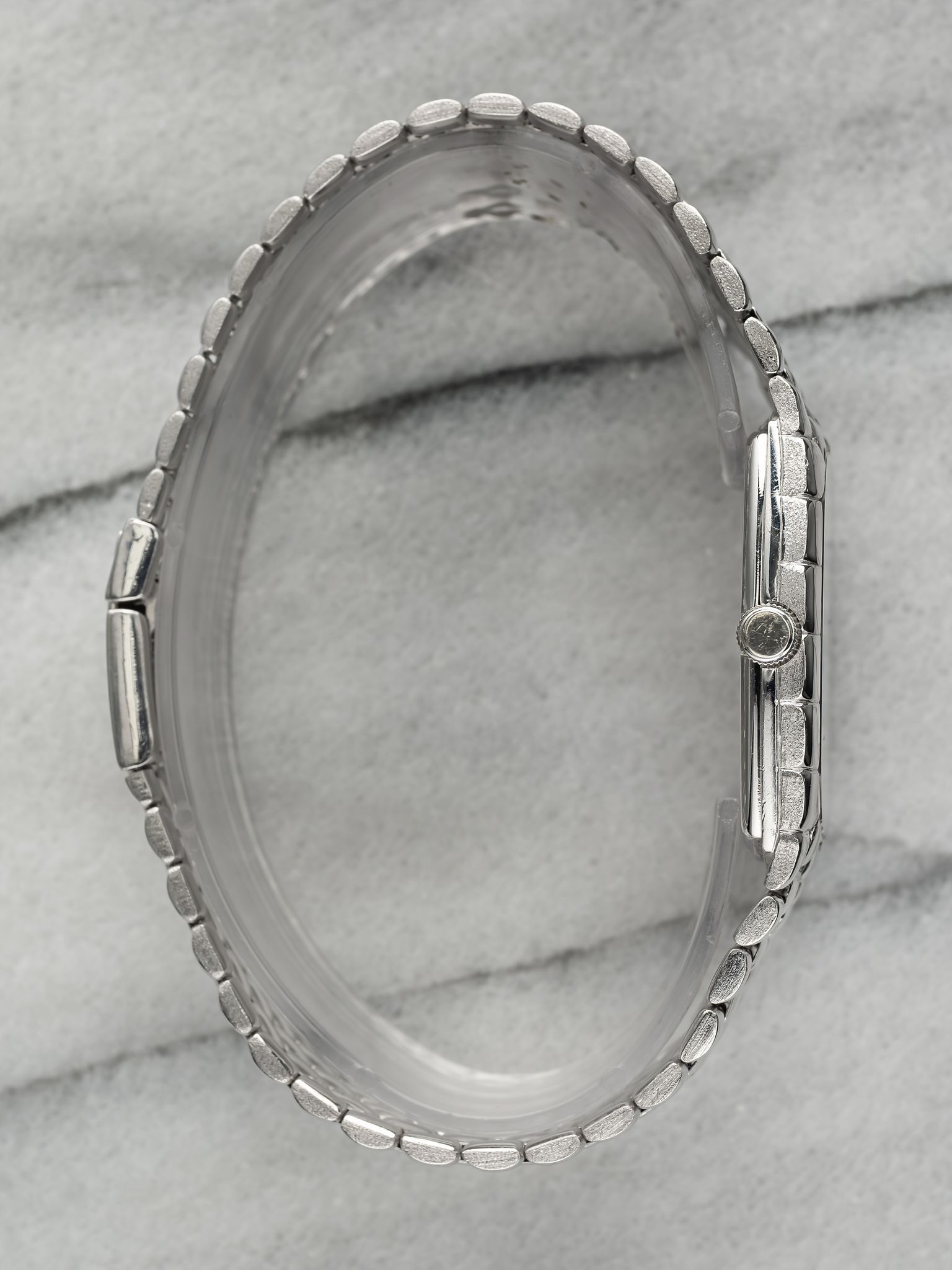 Here's a vintage Audemars Piguet Cobra manual wind in 18K white gold with a matte silver diamond dial from the 1980s. Keeps great time and is fully functional. Measurements include a 28mm case and fits up to a 6.75 inch wrist. It's a different design from a brand that is a one trick pony with the royal oak. There is a knot/ rope braid finishing and texture on both the bezel and bracelet. Yellow gold case and bracelet. The piece is unisex, it can be worn by both men and women. The piece is great alternative and value from other pieces offered by AP. All parts are original including the dial, case, and movement. the dial and case are in great cosmetic, untouched condition.