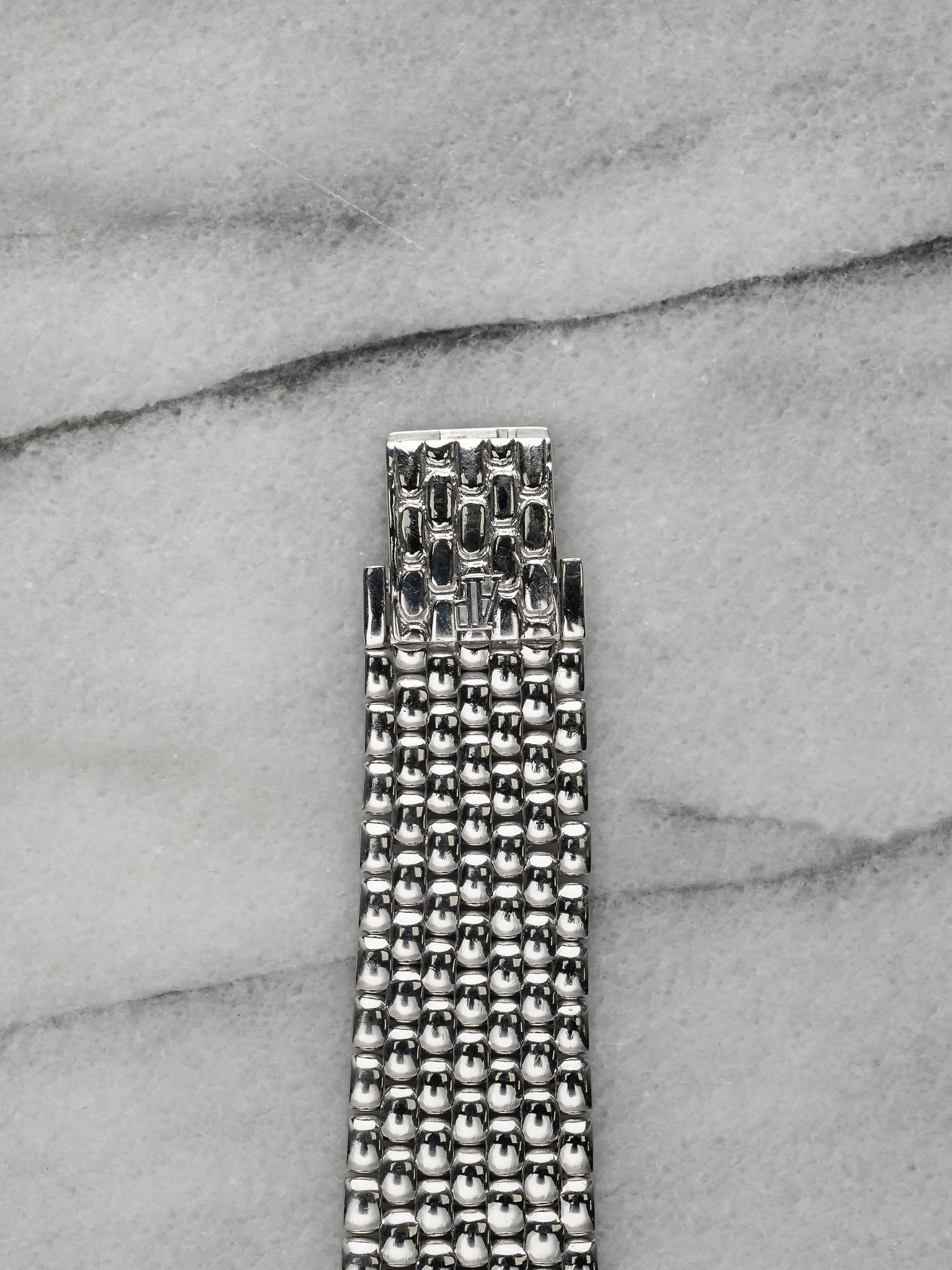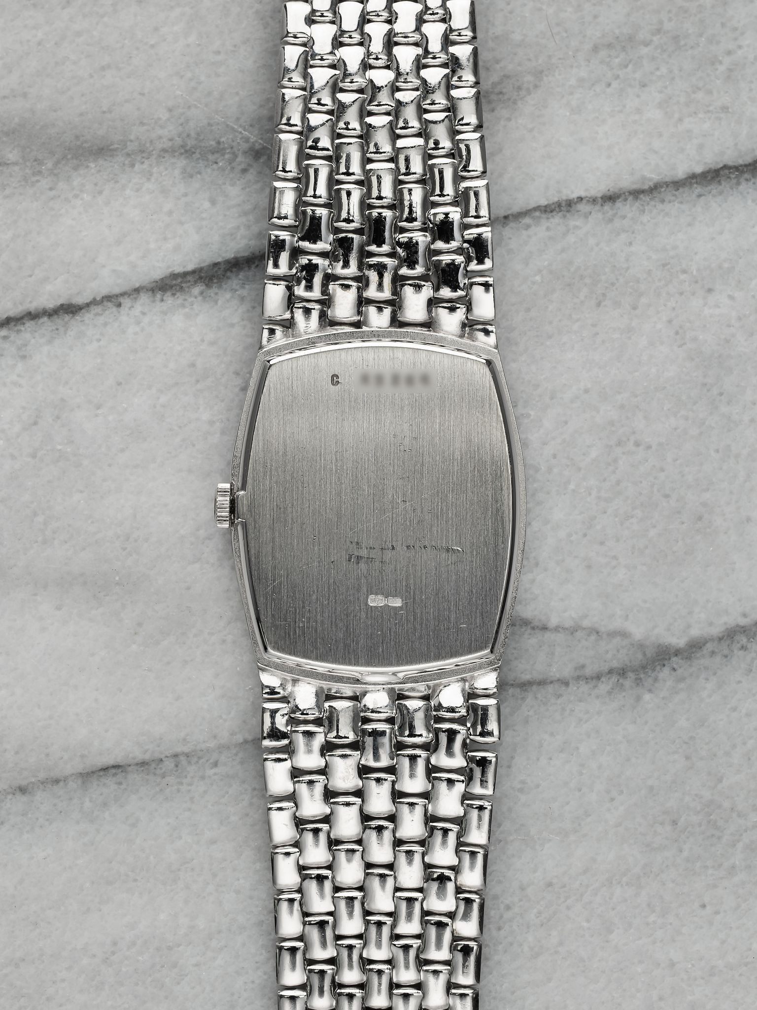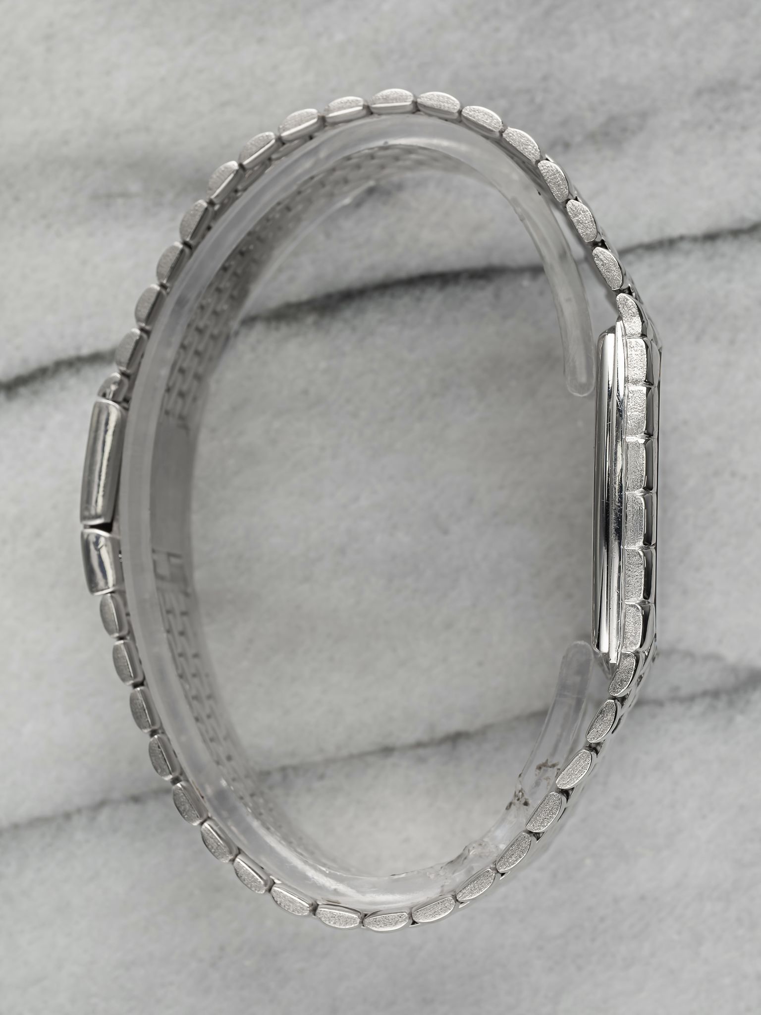 Here's a vintage Audemars Piguet Cobra manual wind in 18K white gold with a matte silver diamond dial from the 1980s. Keeps great time and is fully functional. Measurements include a 28mm case and fits up to a 6.75 inch wrist. It's a different design from a brand that is a one trick pony with the royal oak. There is a knot/ rope braid finishing and texture on both the bezel and bracelet. Yellow gold case and bracelet. The piece is unisex, it can be worn by both men and women. The piece is great alternative and value from other pieces offered by AP. All parts are original including the dial, case, and movement. the dial and case are in great cosmetic, untouched condition.