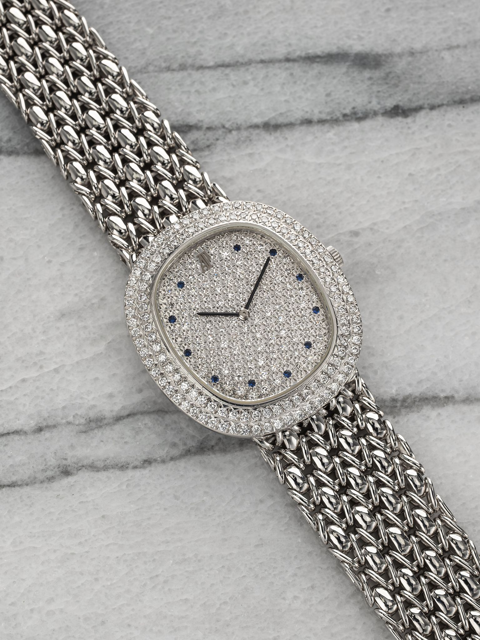 Here's a vintage Audemars Piguet in 18k white gold manual wind with a silver diamond pave dial and bezel from the 1980s. Measurements include a 28mm case size across and the bracelet fits up to a 6.75 inch wrist. Sapphire hour markers. All parts including the crown, dial, movement, and caseback are original.
