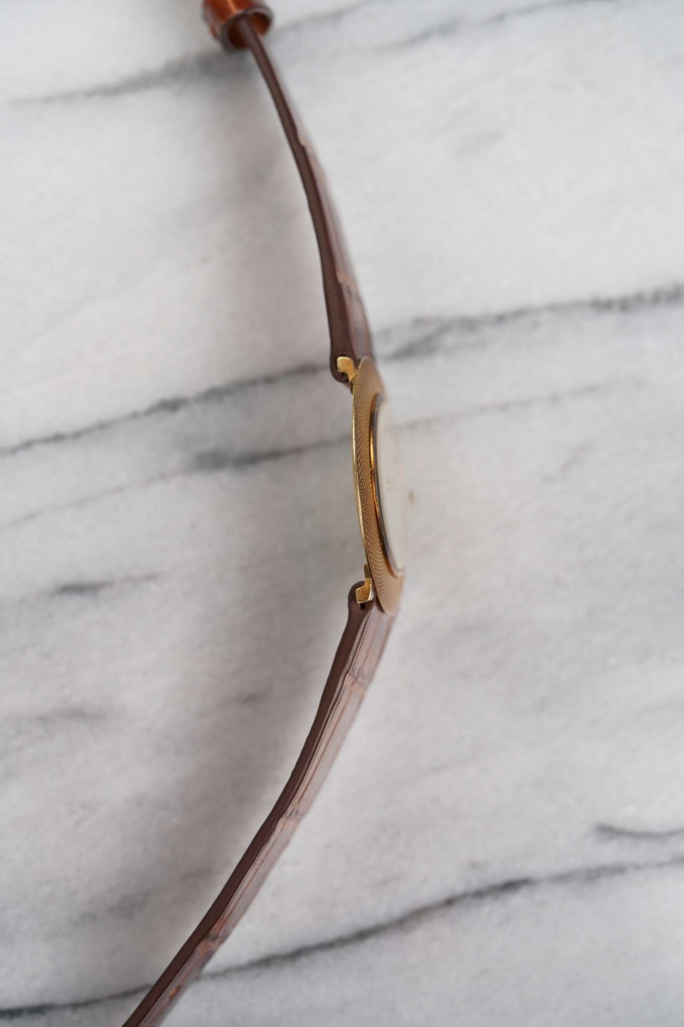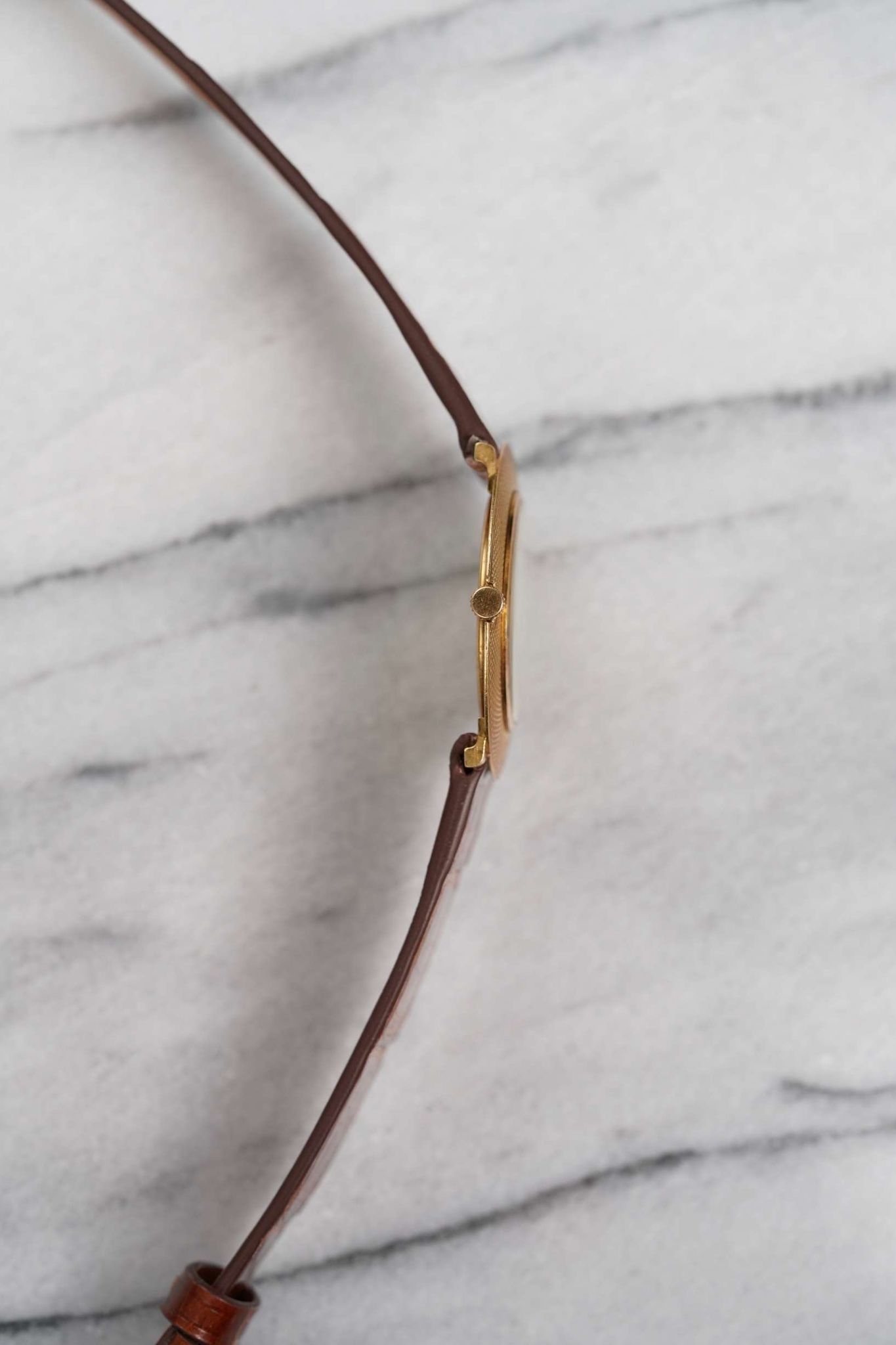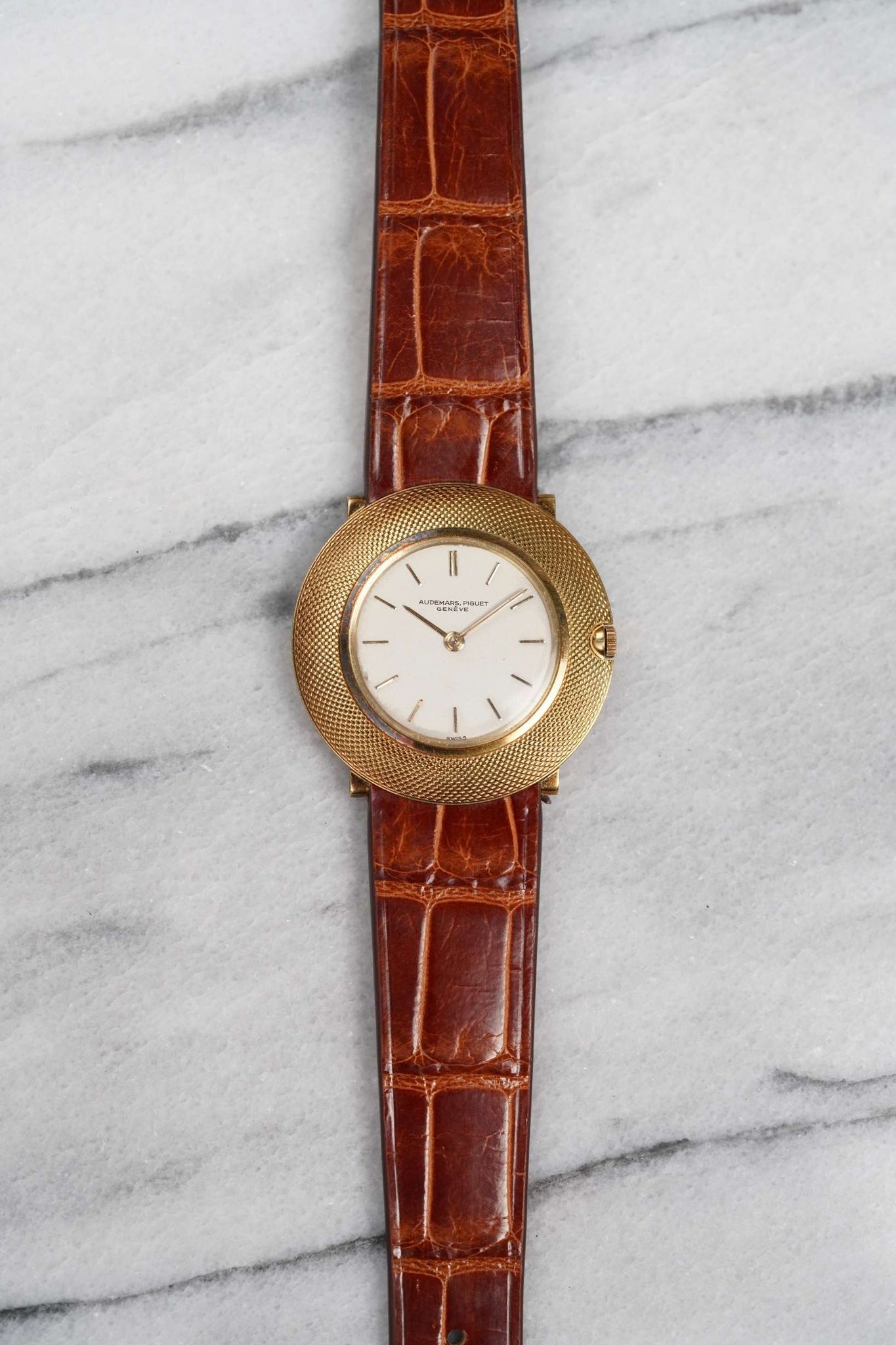 Here's a vintage Audemars Piguet Disco Volante manual wind in 18K yellow gold with a white dial the 1960s. Keeps great time and is fully functional. Recently serviced! Caliber 2003. Measurements include a 34mm and 18 mm lug width. It's on an aftermarket brown alligator gloss finish leather strap. The watch wears larger than its actual dimensions because of the larger hobnail finished bezel. Two hands only. Matching gold hands and stick markers. 18k yellow gold case and caseback. C series. All parts are original including the crown, dial, and caseback.