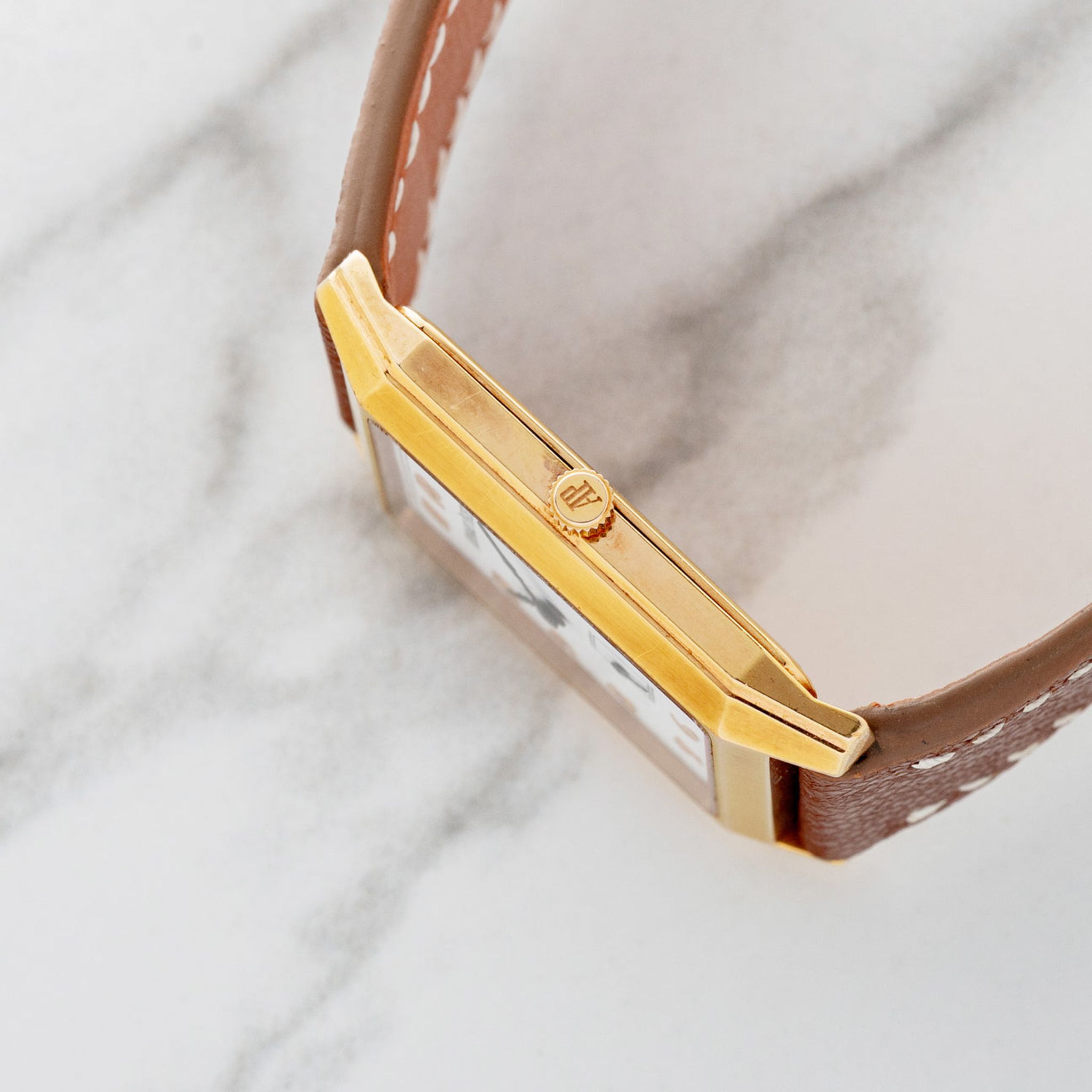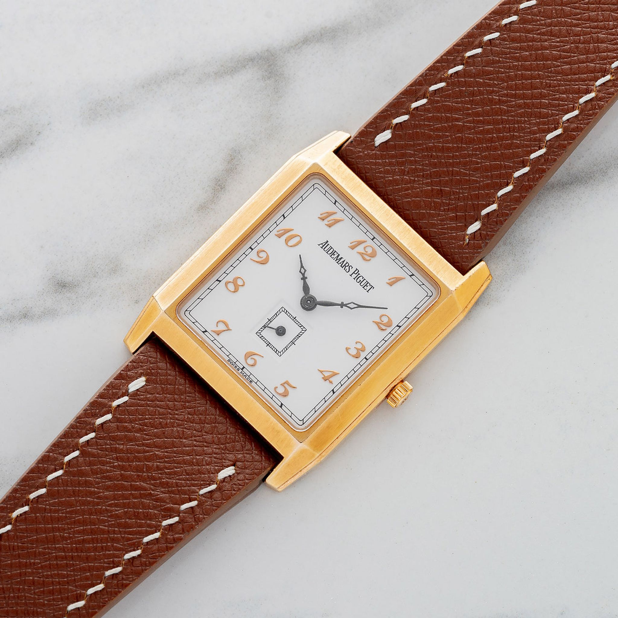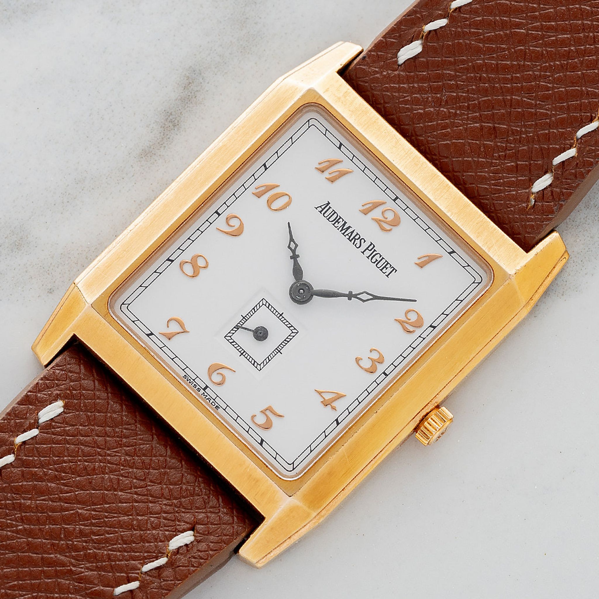 This particular ref. 14835OR features a "tank" style 18k rose gold case and houses a crisp white dial with applied Breguet style indices. At 29 x 37.5mm this piece is better suited to a medium to larger sized wrist and befits from a thin height of just 5mm making it feel slim as a dress watch should. The dial and case have remained in excellent neo-vintage condition with no notable wear and we believe this case to be unpolished. For anyone who is a fan of Breguet numerals and looking for more wrist presence in a dress watch, this AP represents great value in today's market.