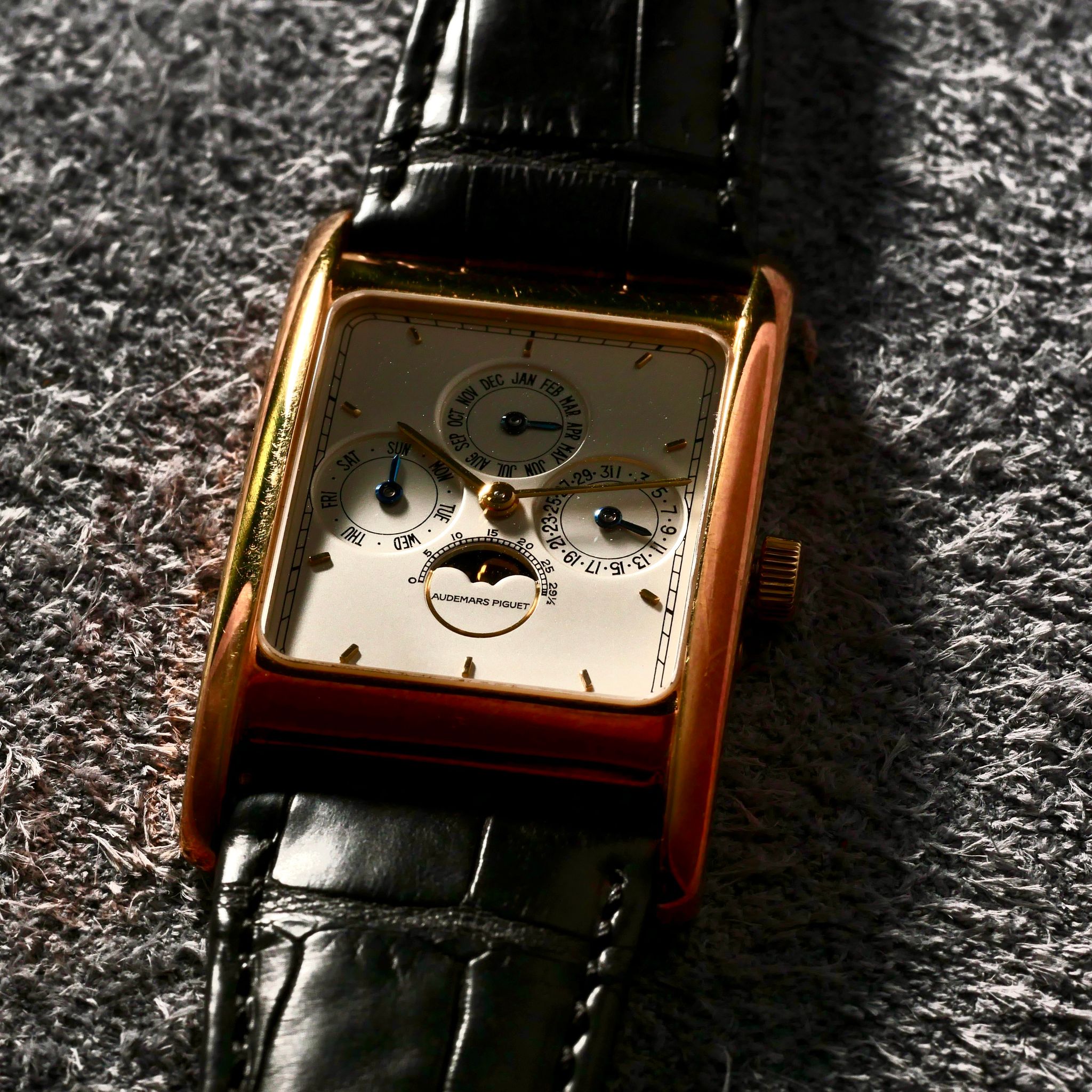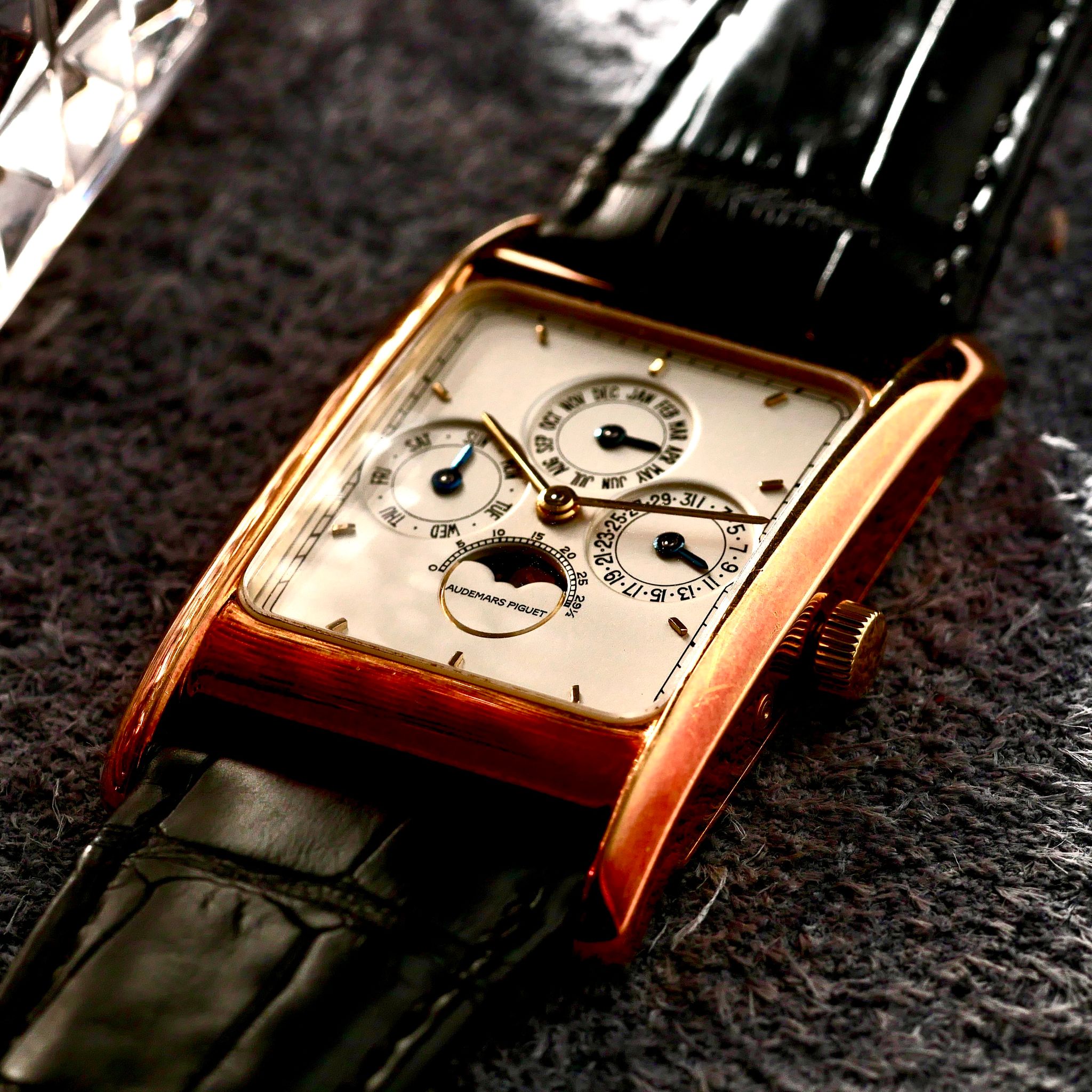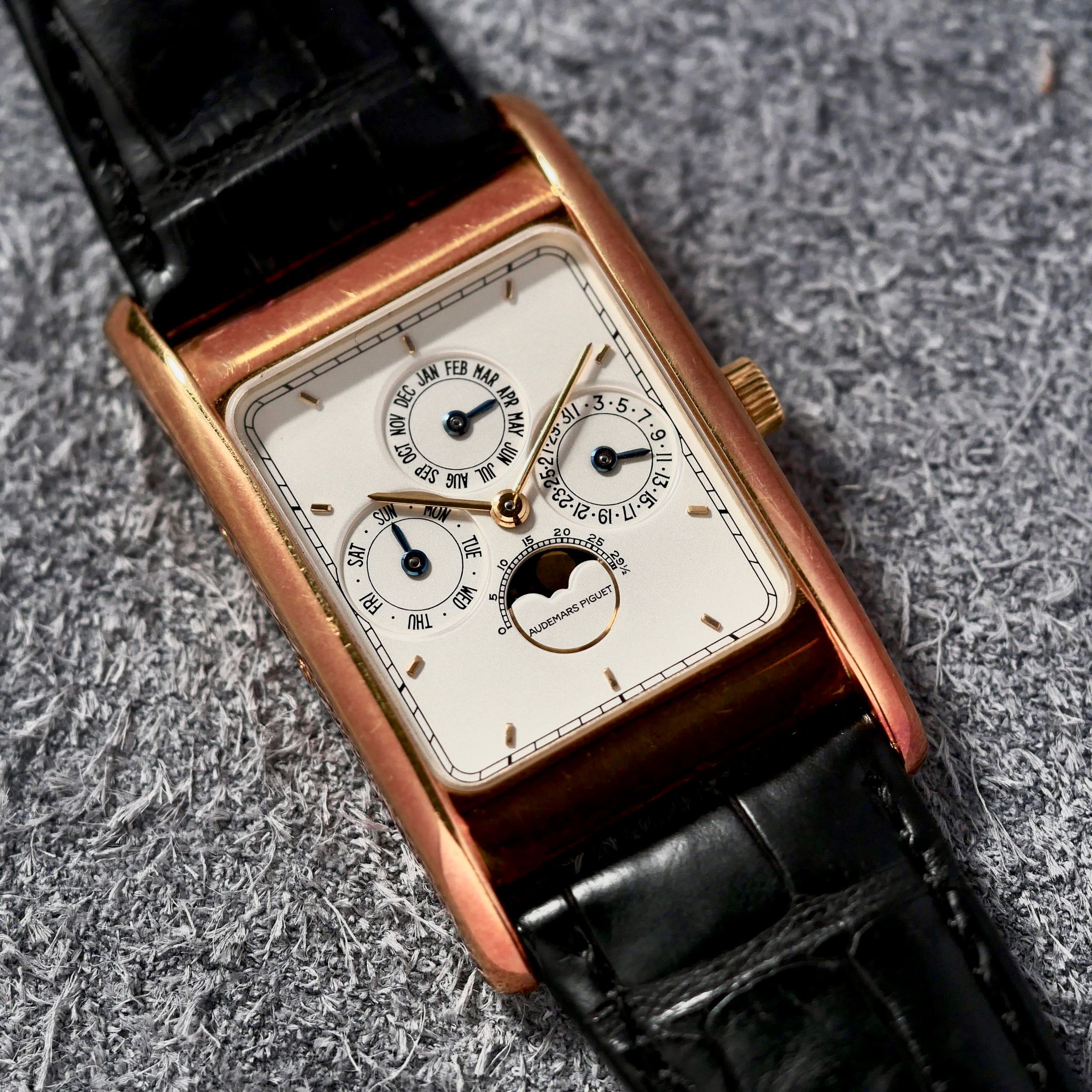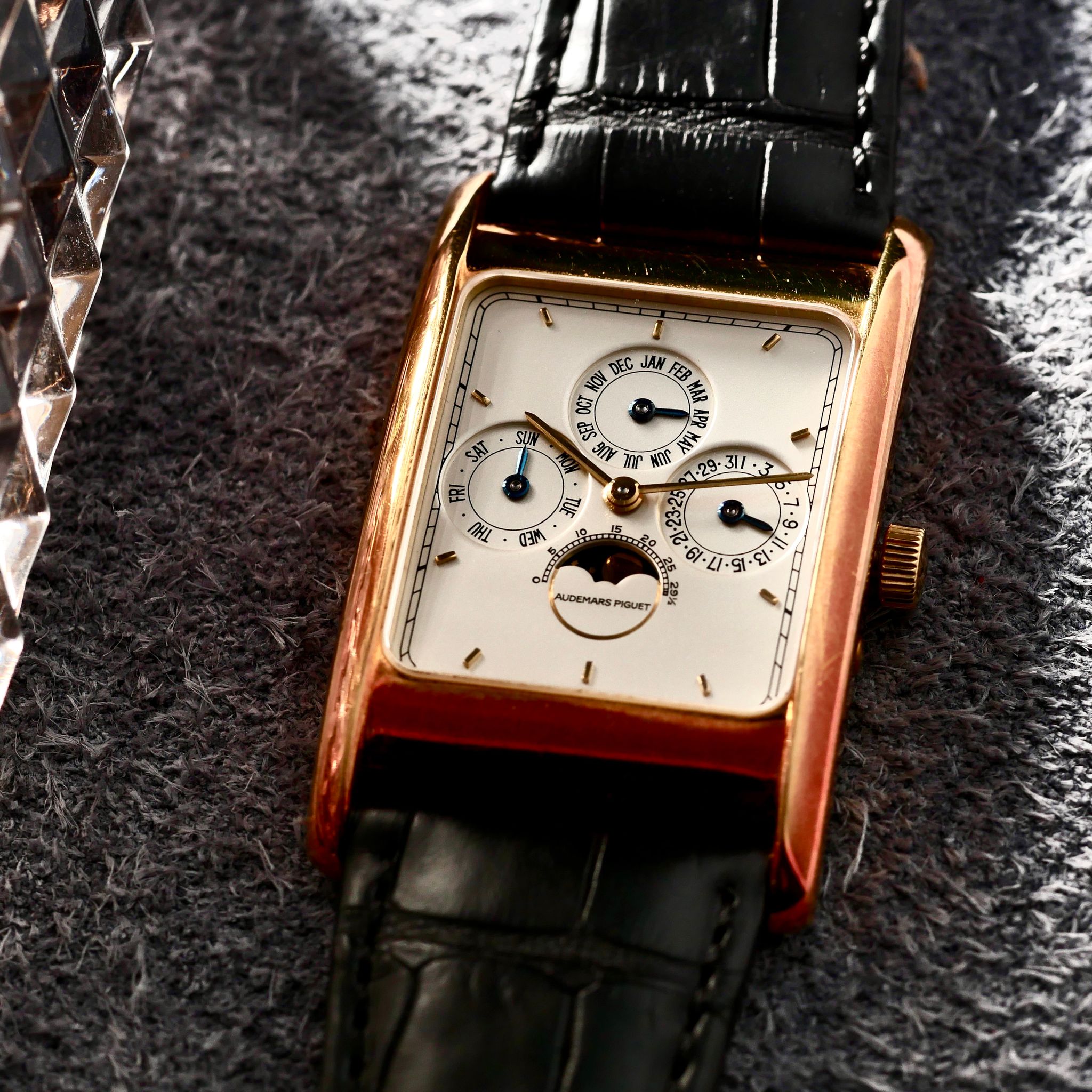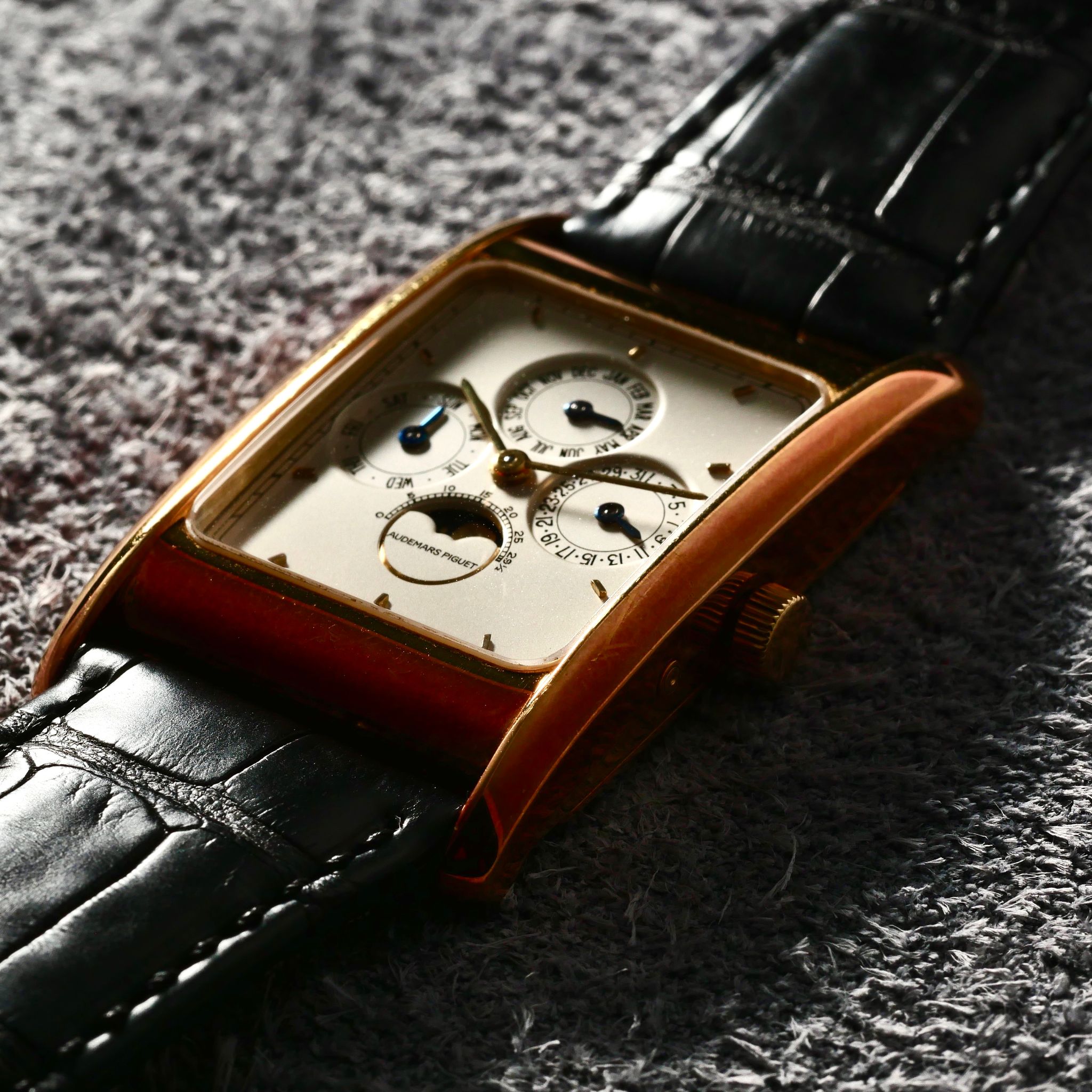 Inspired by the Renault tanks being used on the Western Front, Louis Cartier first launched the Tank wristwatch in 1918. Not to be outdone and with its own distinguished history, Audemars Piguet introduced a similar model in the 1920s, equipped with a triple calendar and a moon phase.