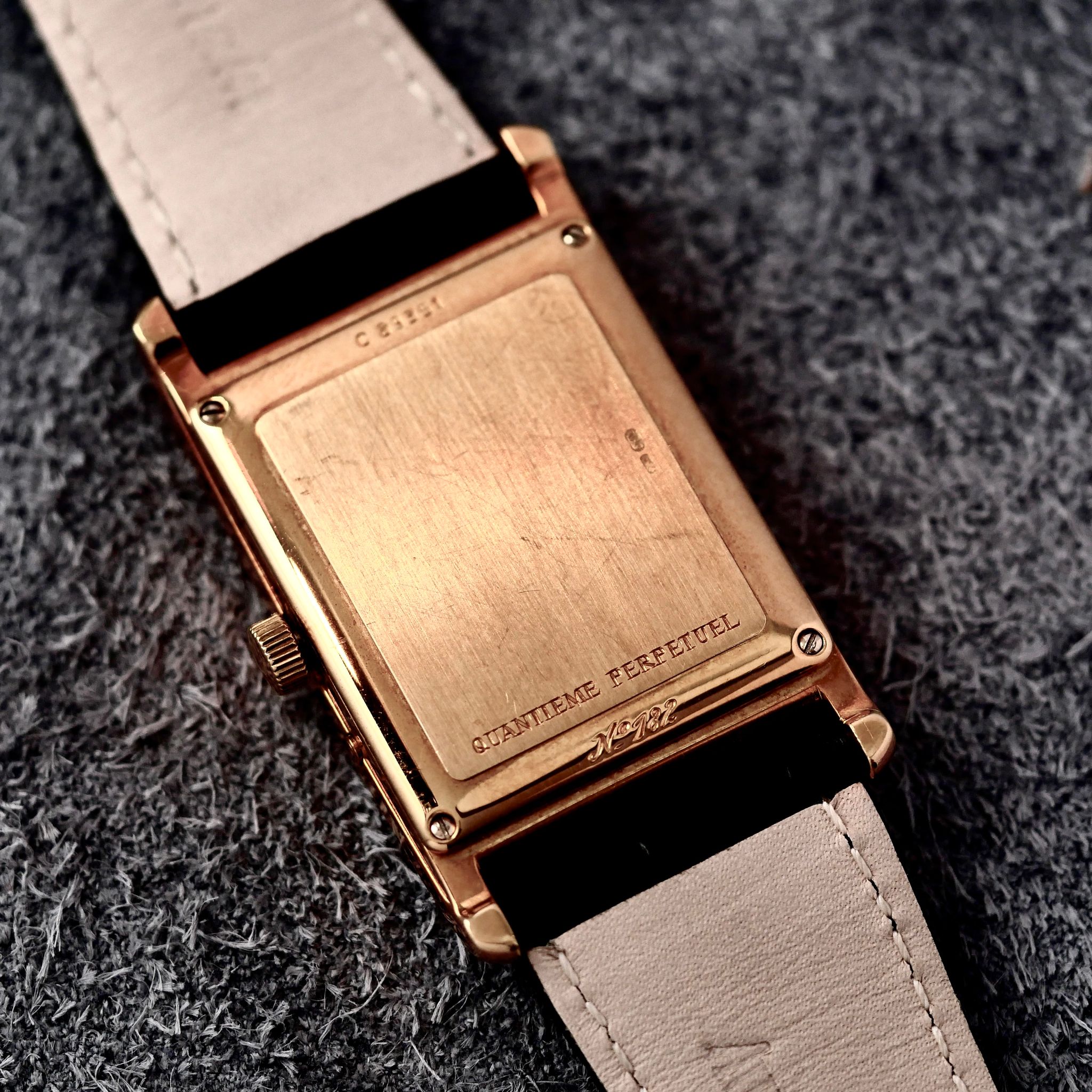 Two versions of the dial are known; the first features Breguet numerals and leaf-shaped hands, while the second; true to its Art Deco heritage, was equipped with stick hands and applied stick indexes. The rarest models produced in the very limited period from 1991 to 1993, such as the one shown here, carried a small logo while those produced after 1993 had a larger logo in the same position, below the moonphase indicator.