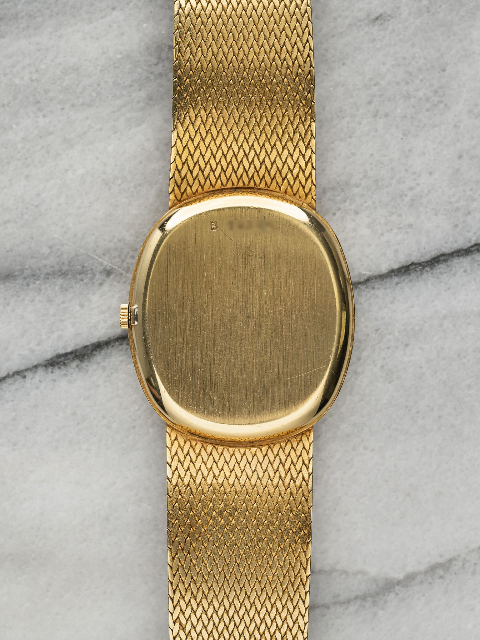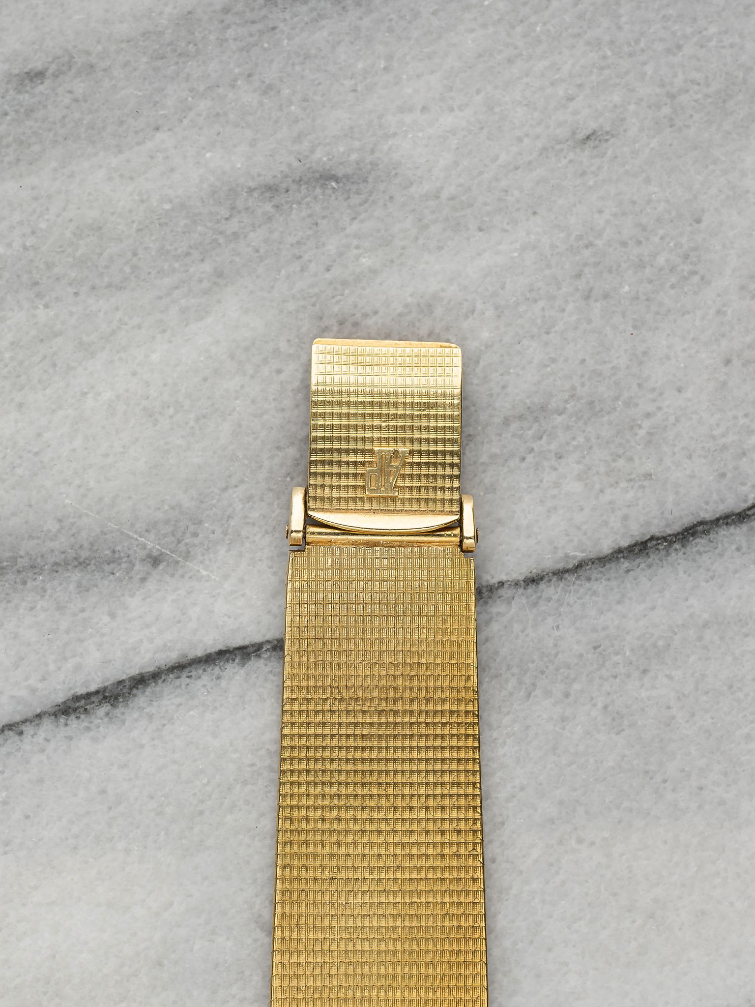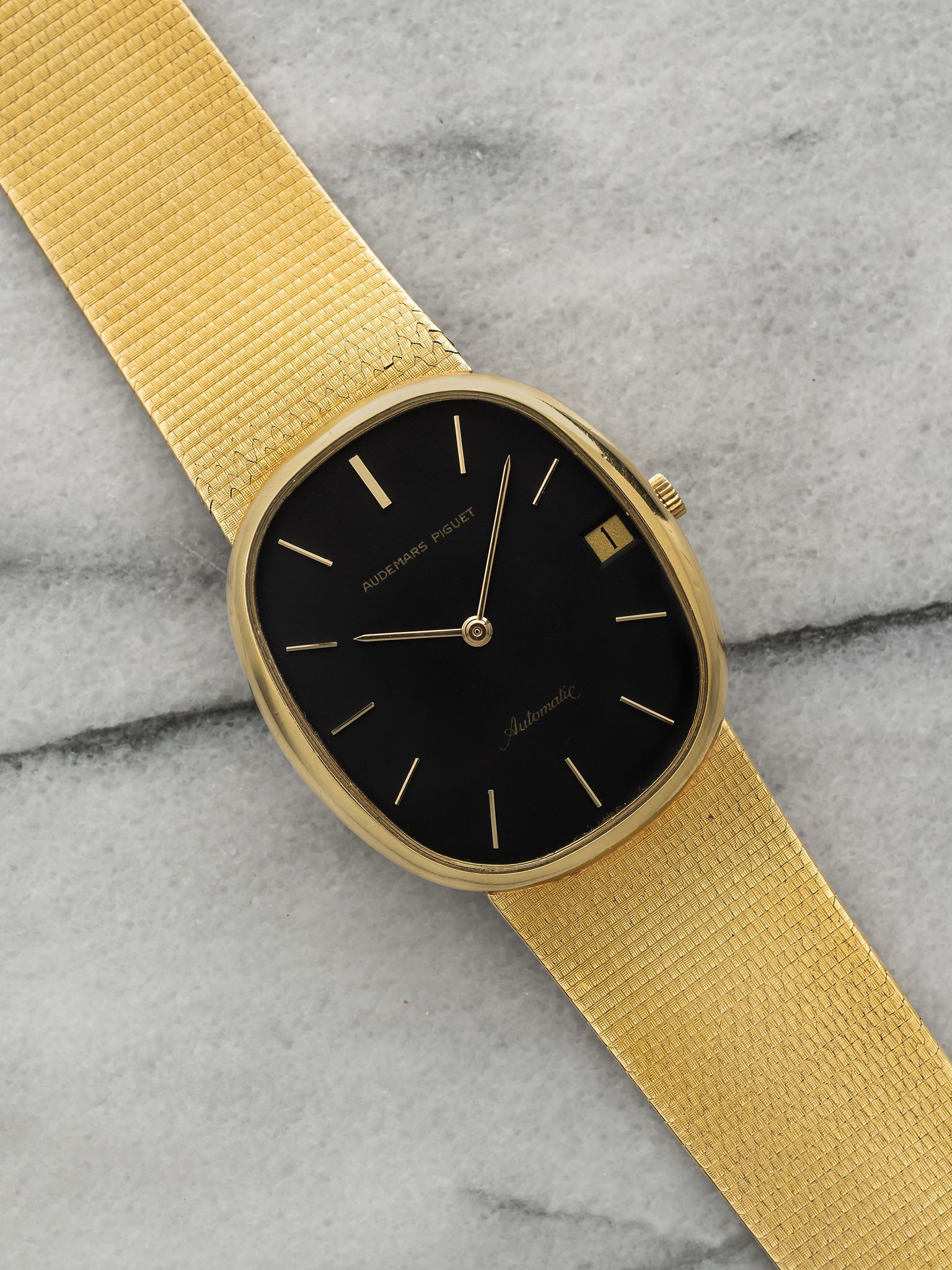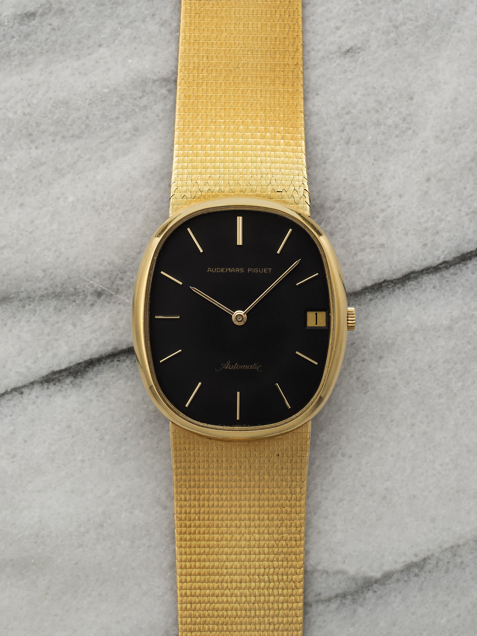 Here we have a vintage Audemars Piguet Ellipse automatic in 18k yellow gold with a matte black dial from the 1980s. Keeps great time and is fully functional. Measurements of the case is 30x30mm including the crown. Non quickset date function at 3 a clock. It's on its original matching integrated 18k yellow gold bracelet measuring 7 inches long with its micro adjuster. Both the dial and crystal are free from any scratches. There's a matching braided texture on both the bezel and bracelet. The bracelet is fully integrated with a woven finish through the case. Unusual to find larger automatic Ellipse shape from this brand. All parts are original including the dial, crown, movement, and caseback. Both the dial and case are in great cosmetic, untouched condition.
