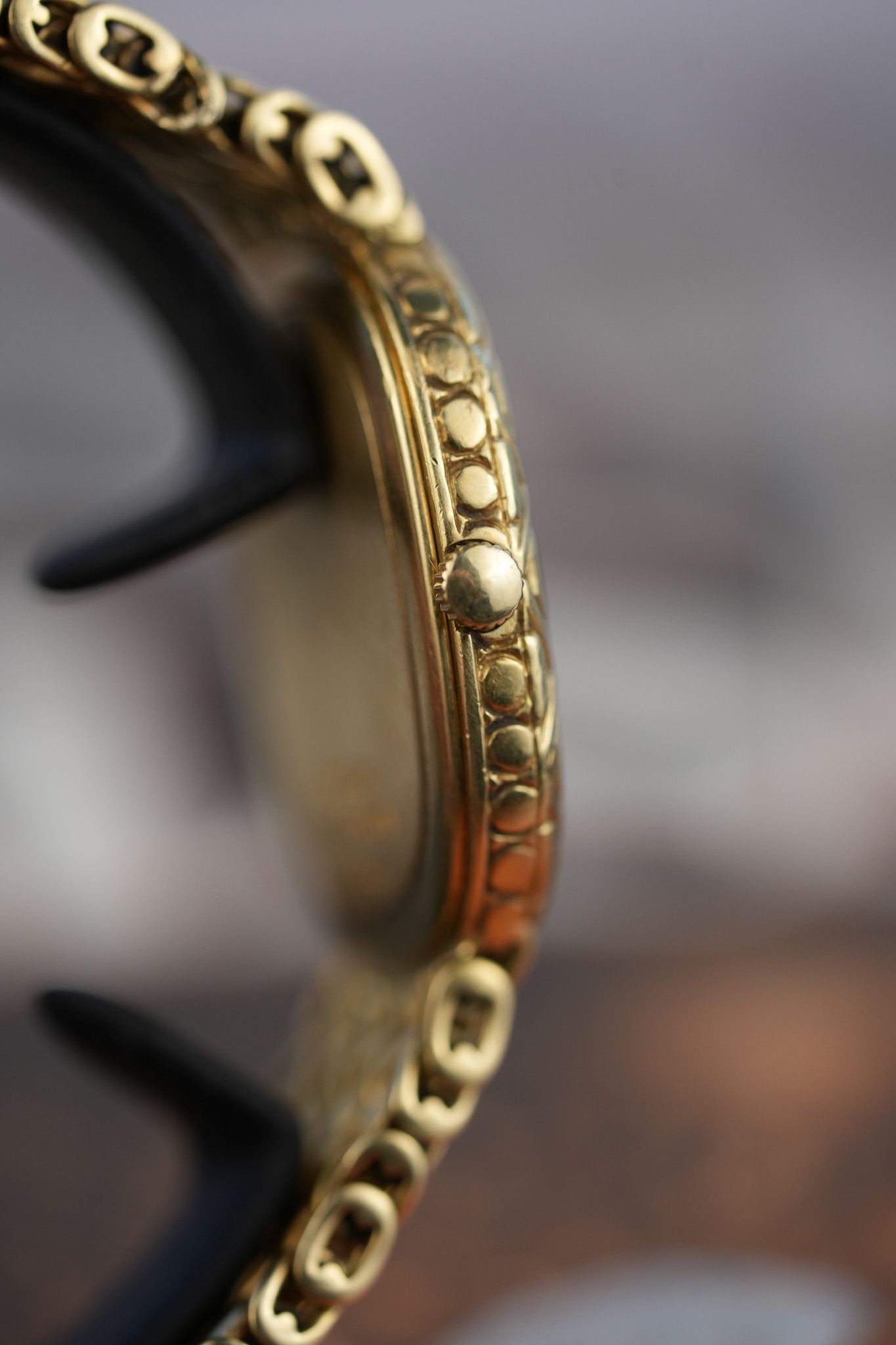 The 18K yellow gold case is equally ambitious. At 29 by 32mm, it’s elliptically shaped and deeply carved on the bezel, almost like the frame of a baroque mirror. Then AP switches it up—the case sides feature a totally different pattern: circular motifs that feel more like hammered gold medallions than machine work. Every inch is doing something different, and yet, it works.