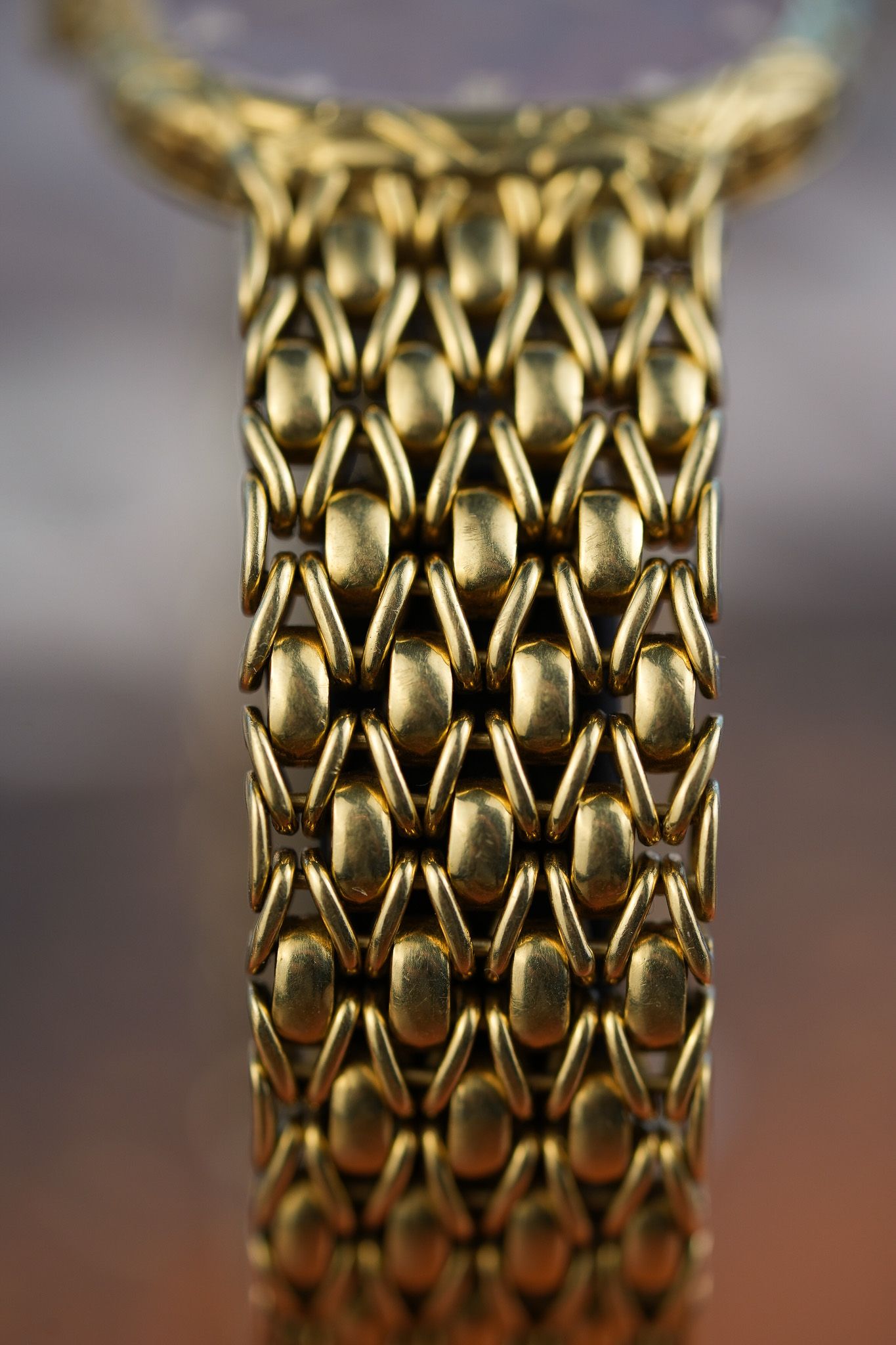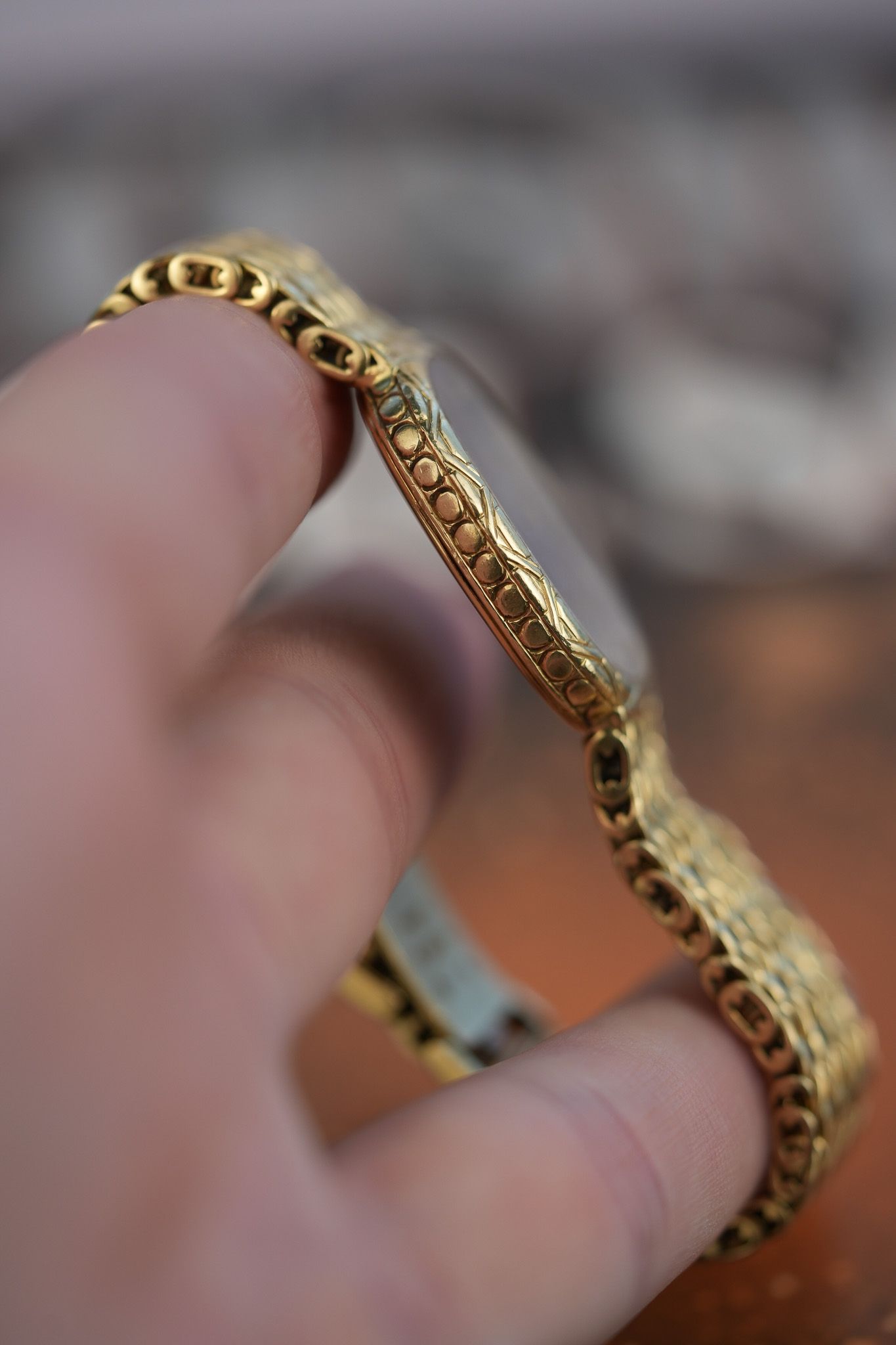 Dimensions: 29 x 32mm. Integrated 18K yellow gold bracelet. Fits up to 7inch wrist with 2 additional micro-positions.