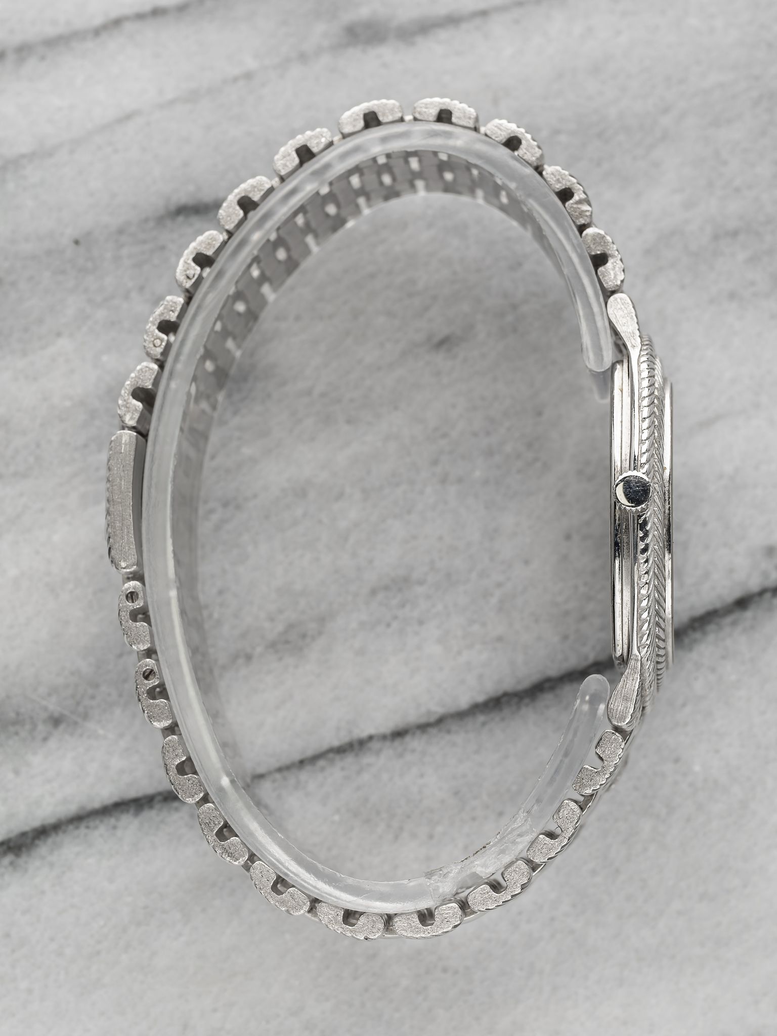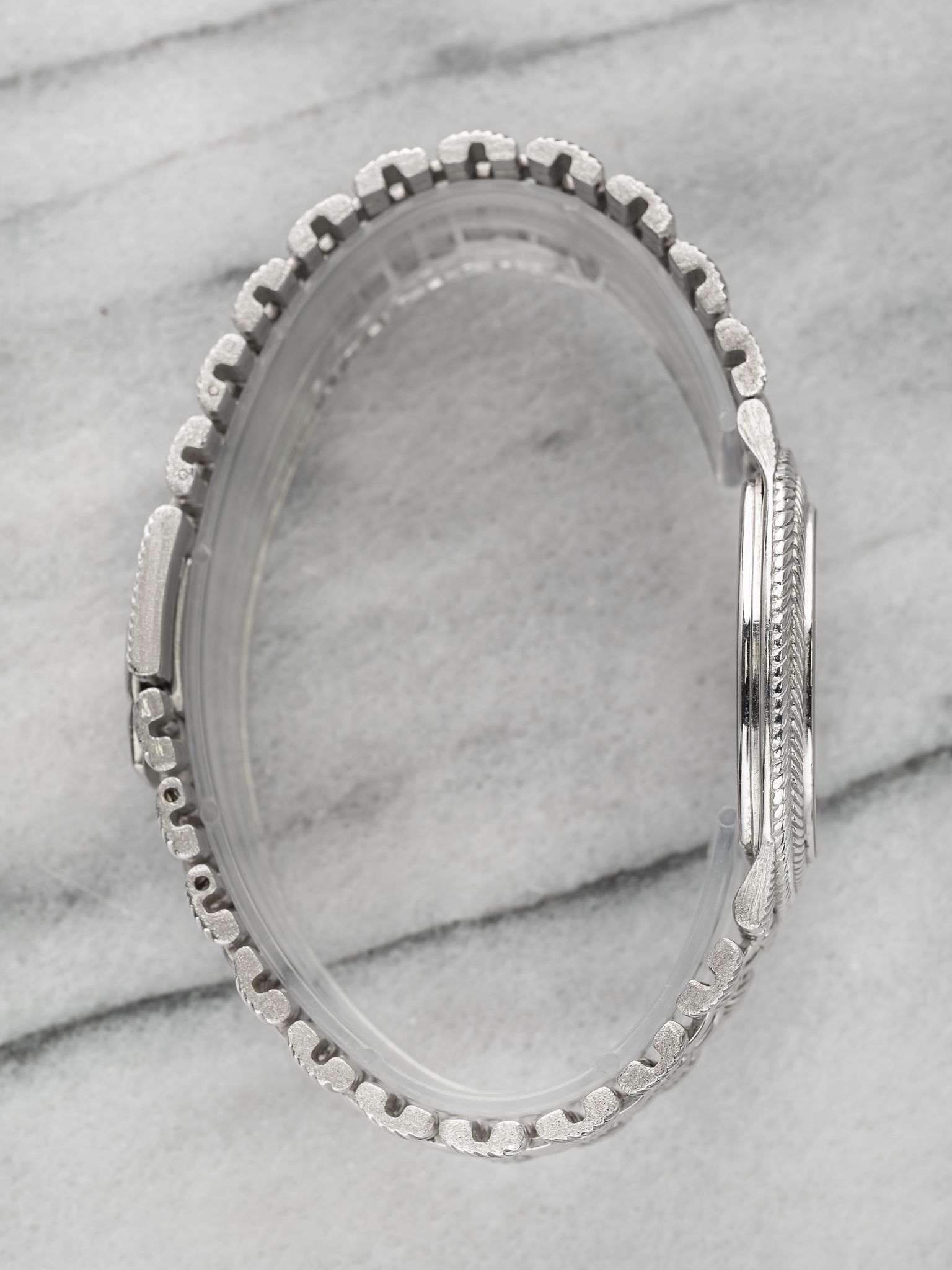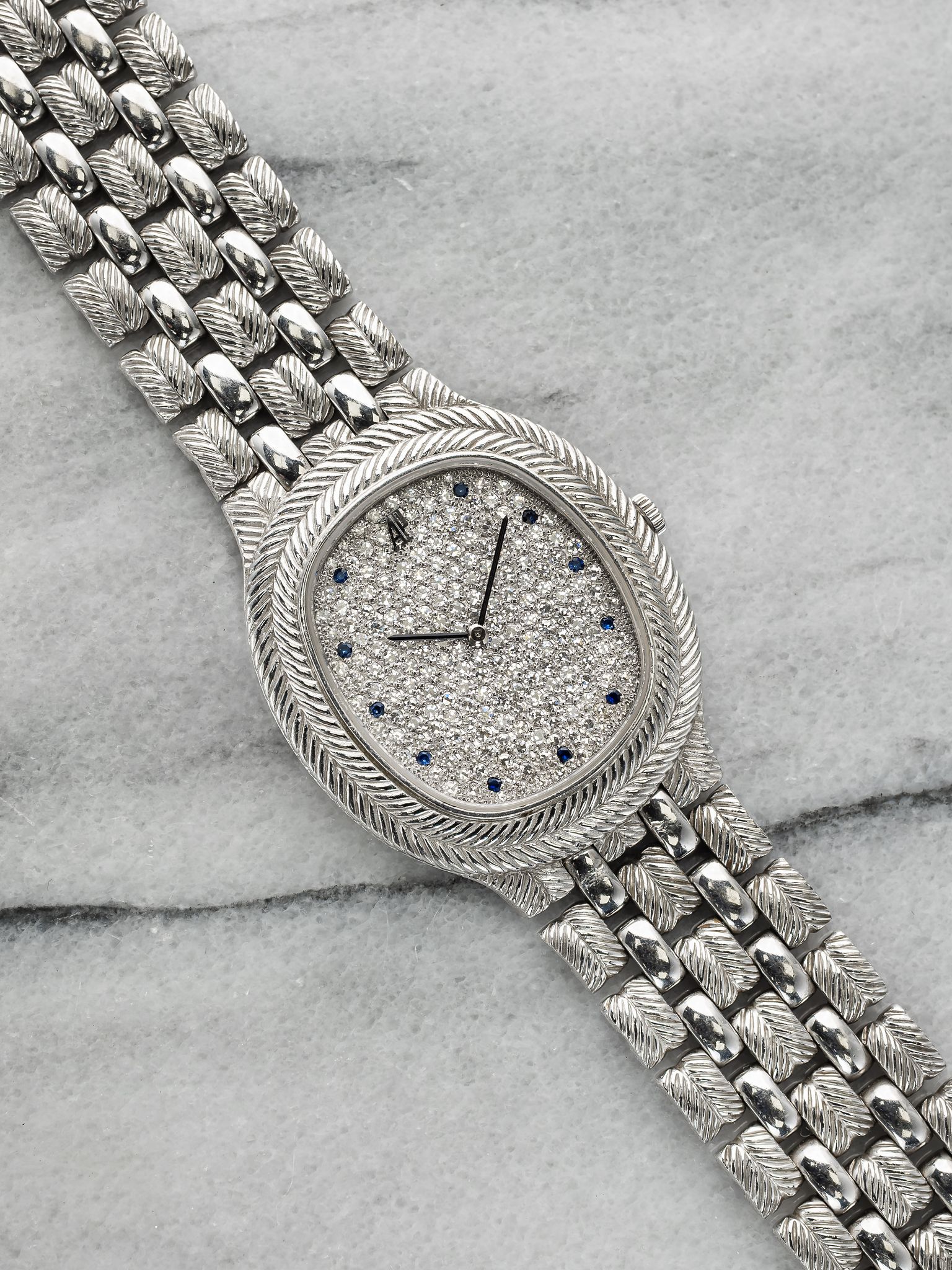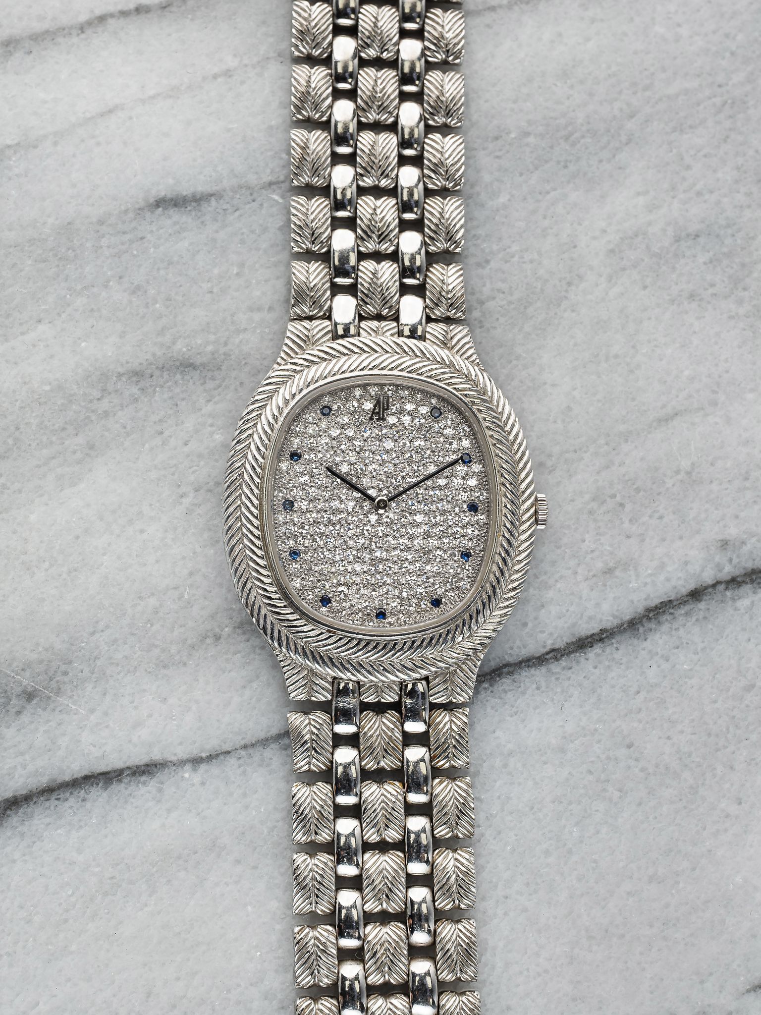 Here we have a vintage Audemars Piguet feather in quartz in 18k white gold with a silver diamond pave dial from the 1980s (C series). Keeps great time and is fully functional. Measurements of the case is 30x30mm including the crown. It's on its original matching integrated 18k white gold bracelet measuring 7.25 inches long with its micro adjuster. The piece is quite heavy! 18K white gold case and cashback. Both the dial and crystal are free from any scratches. There's a matching braided texture on both the bezel and bracelet. Very unique braid finishing and chain links on the bracelet. Blue sapphire hour markers. The bracelet is fully integrated with a woven finish through the case. All parts are original including the dial, crown, movement, and caseback. Both the dial and case are in great cosmetic, untouched condition.