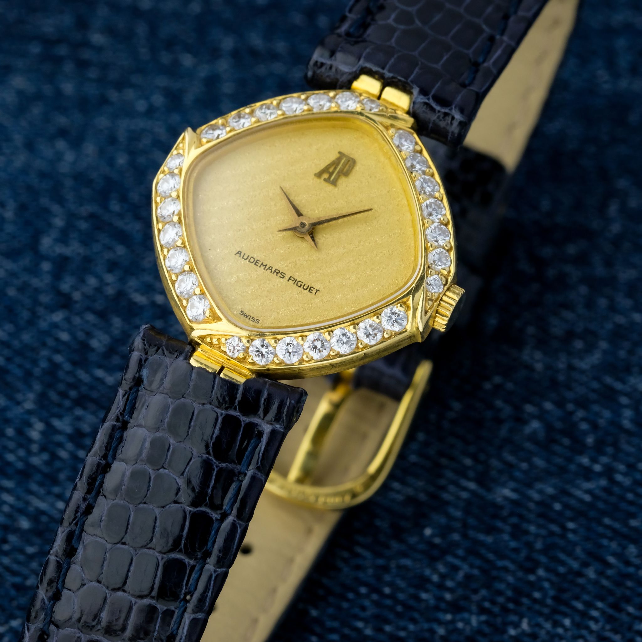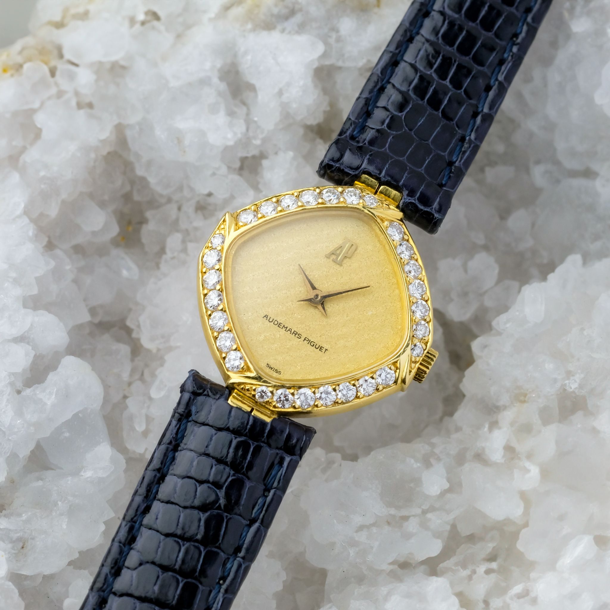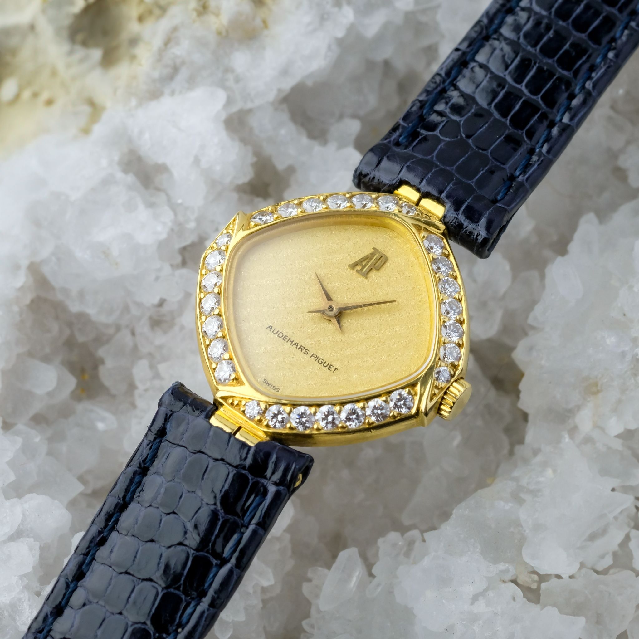 This exquisite ladies Audemars Piguet watch is a refined expression of haute horlogerie in miniature form. With its unusually shaped case, gracefully sculpted beyond traditional round or square lines, it showcases the brand’s creative approach. Crafted in 18k yellow gold and framed by a factory-set diamond bezel, the watch sparkles with subtle sophistication. Each diamond is meticulously set to enhance the flowing geometry of the case, adding brilliance without excess.