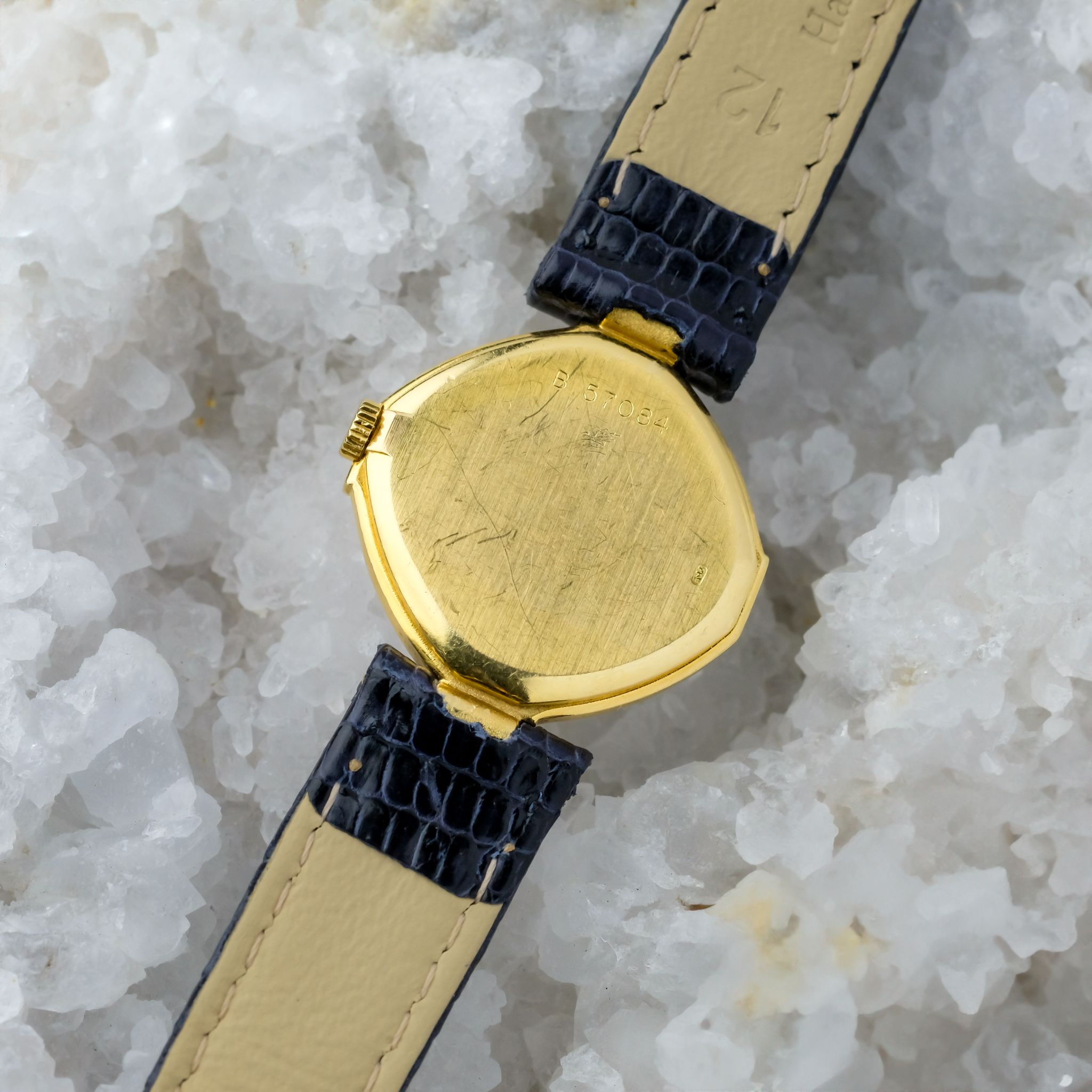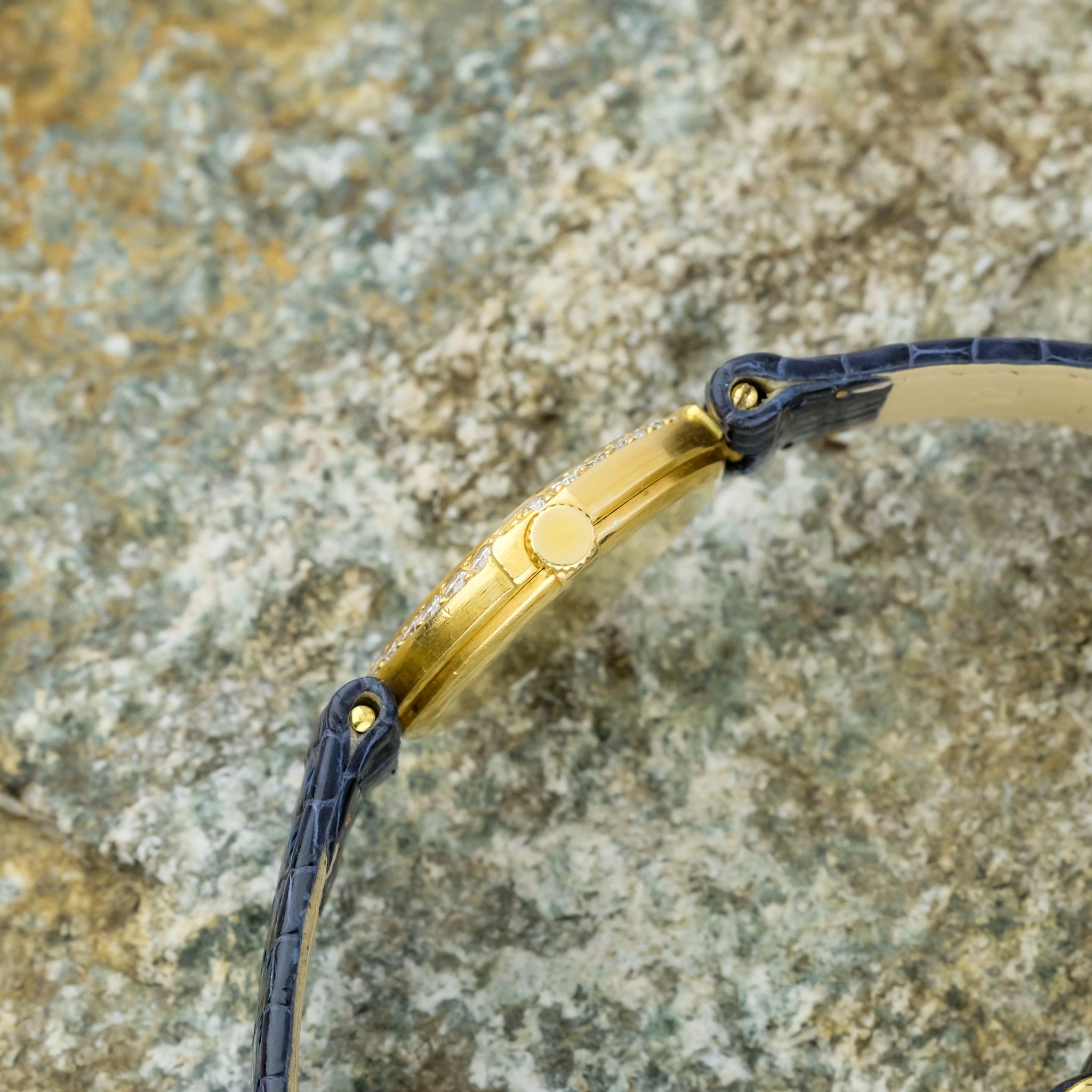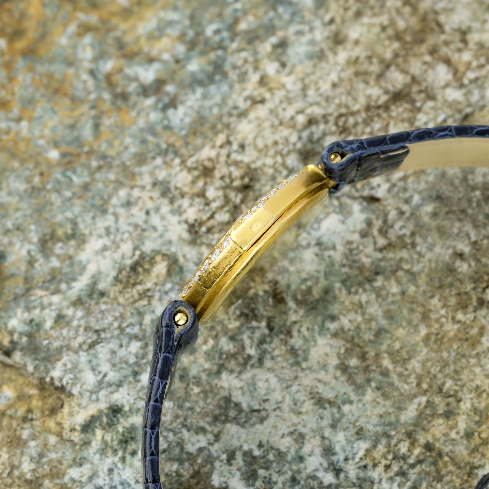 This exquisite ladies Audemars Piguet watch is a refined expression of haute horlogerie in miniature form. With its unusually shaped case, gracefully sculpted beyond traditional round or square lines, it showcases the brand’s creative approach. Crafted in 18k yellow gold and framed by a factory-set diamond bezel, the watch sparkles with subtle sophistication. Each diamond is meticulously set to enhance the flowing geometry of the case, adding brilliance without excess.
