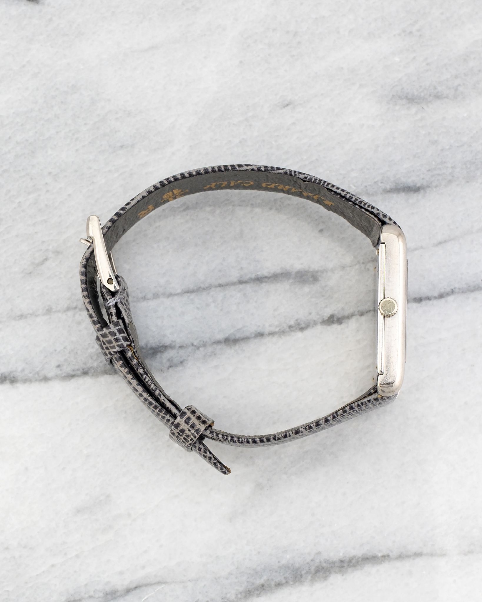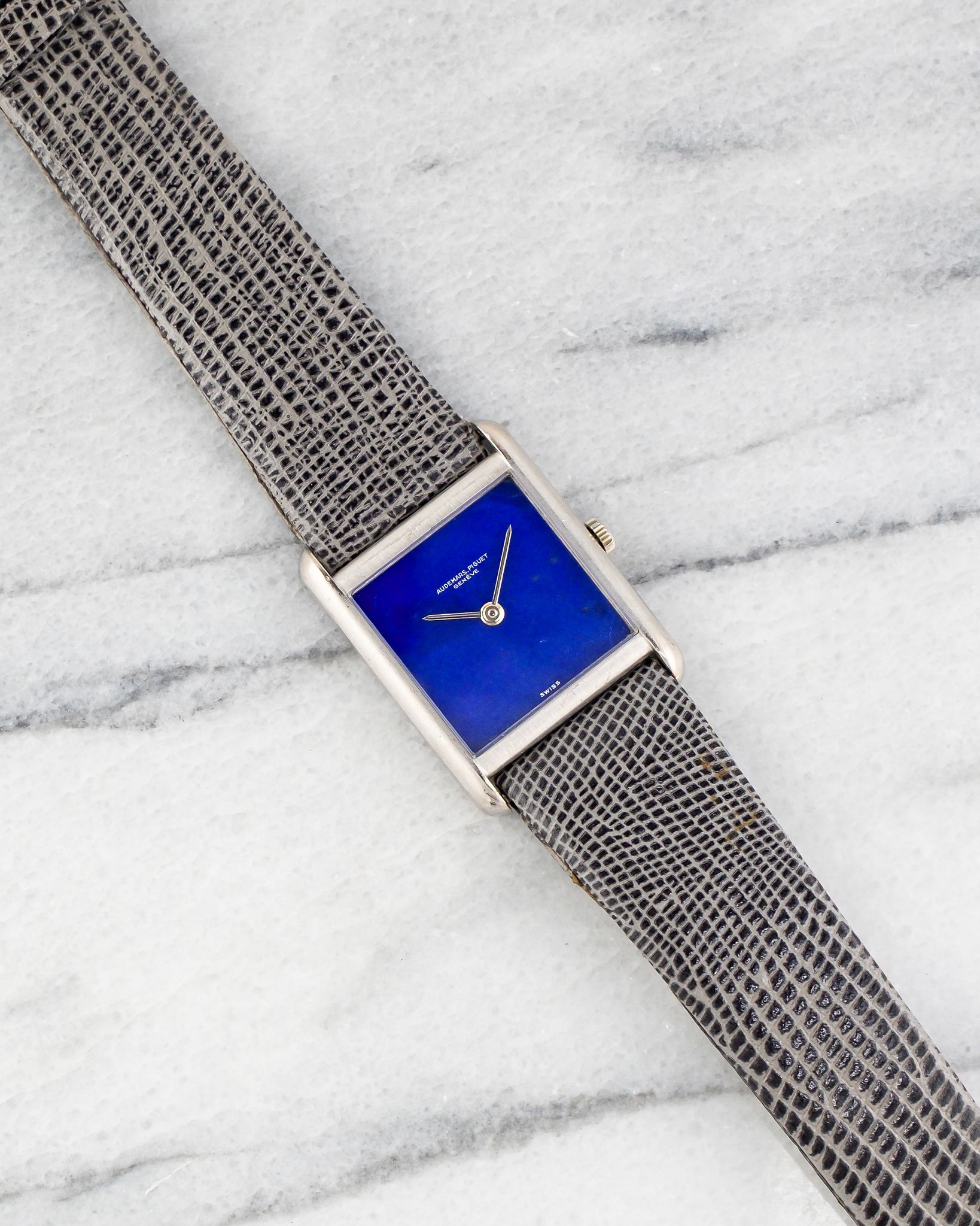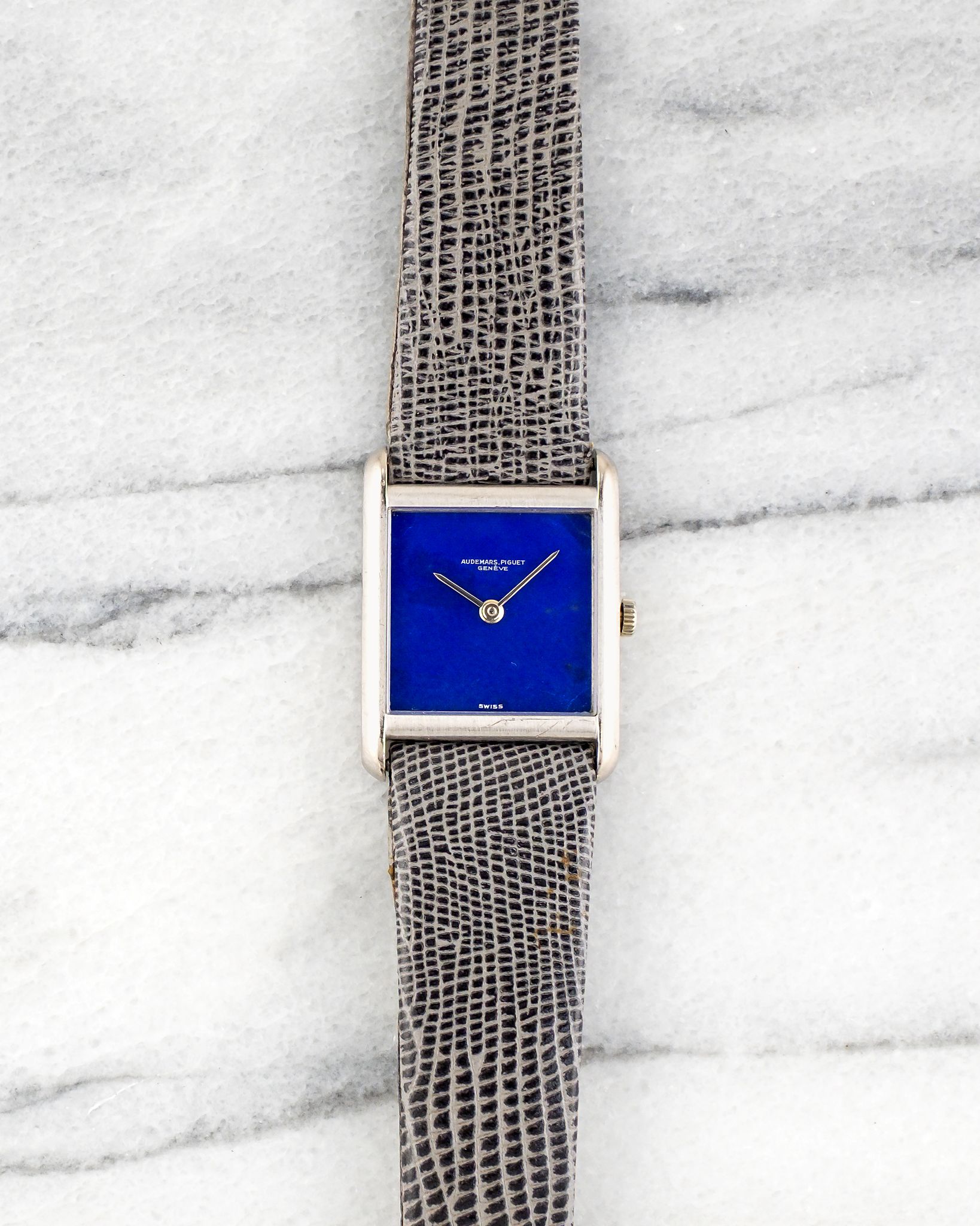 Here's a vintage Audemars Piguet manual wind in 18k white gold with a blue lapis stone dial on a leather strap from the 1970s. Keeps great time and is fully functional. Measurements include a 23x28mm white gold case. It's on a grey leather strap with a gold Piaget buckle. Deep blue lapis dial with a white gold case and minimalistic design. There is a slight crack on the top right of the dial as seen in photos. All parts are original including the signed Audemars Piguet crown, dial, movement, and caseback. Both the dial and case are in great cosmetic, untouched condition.