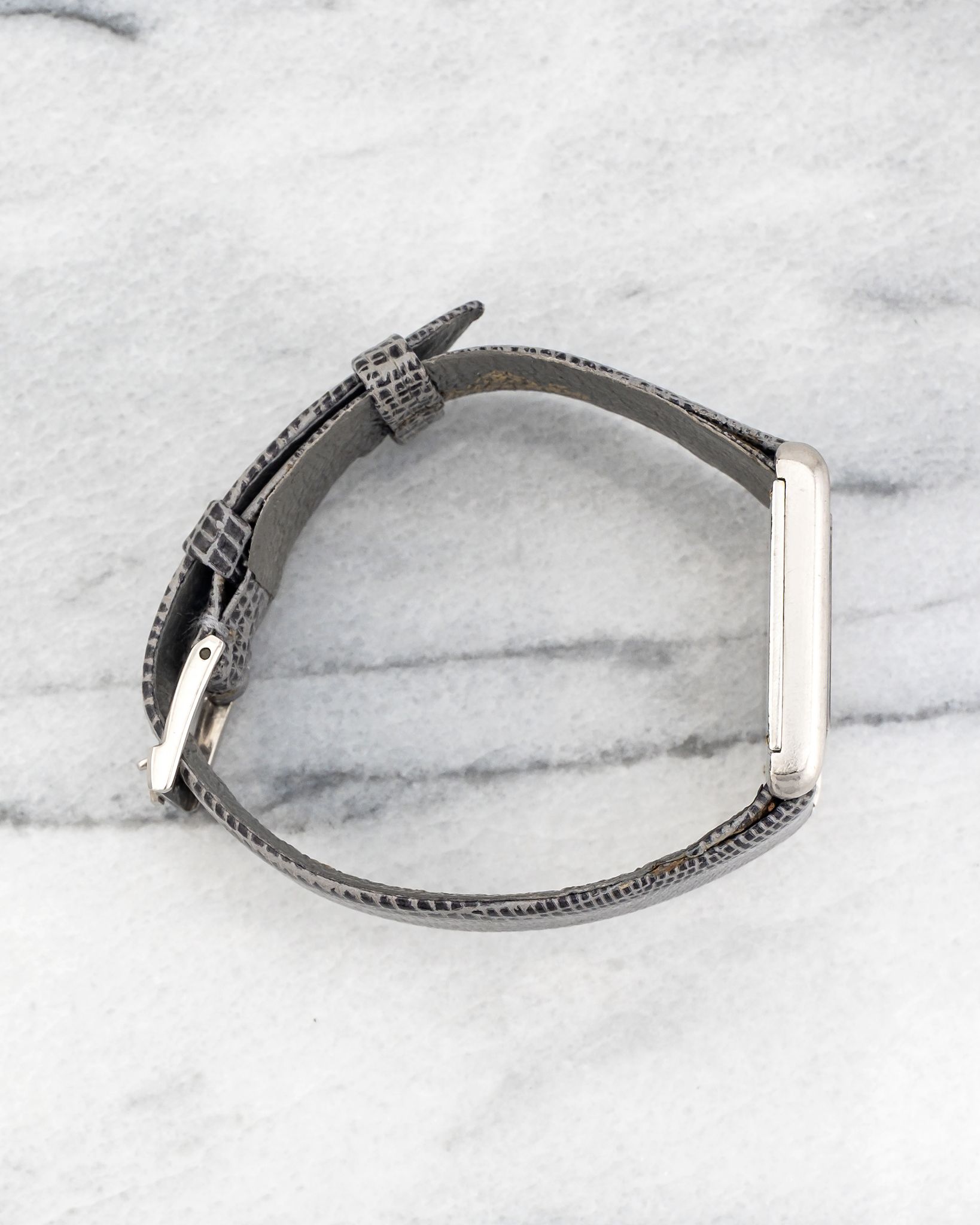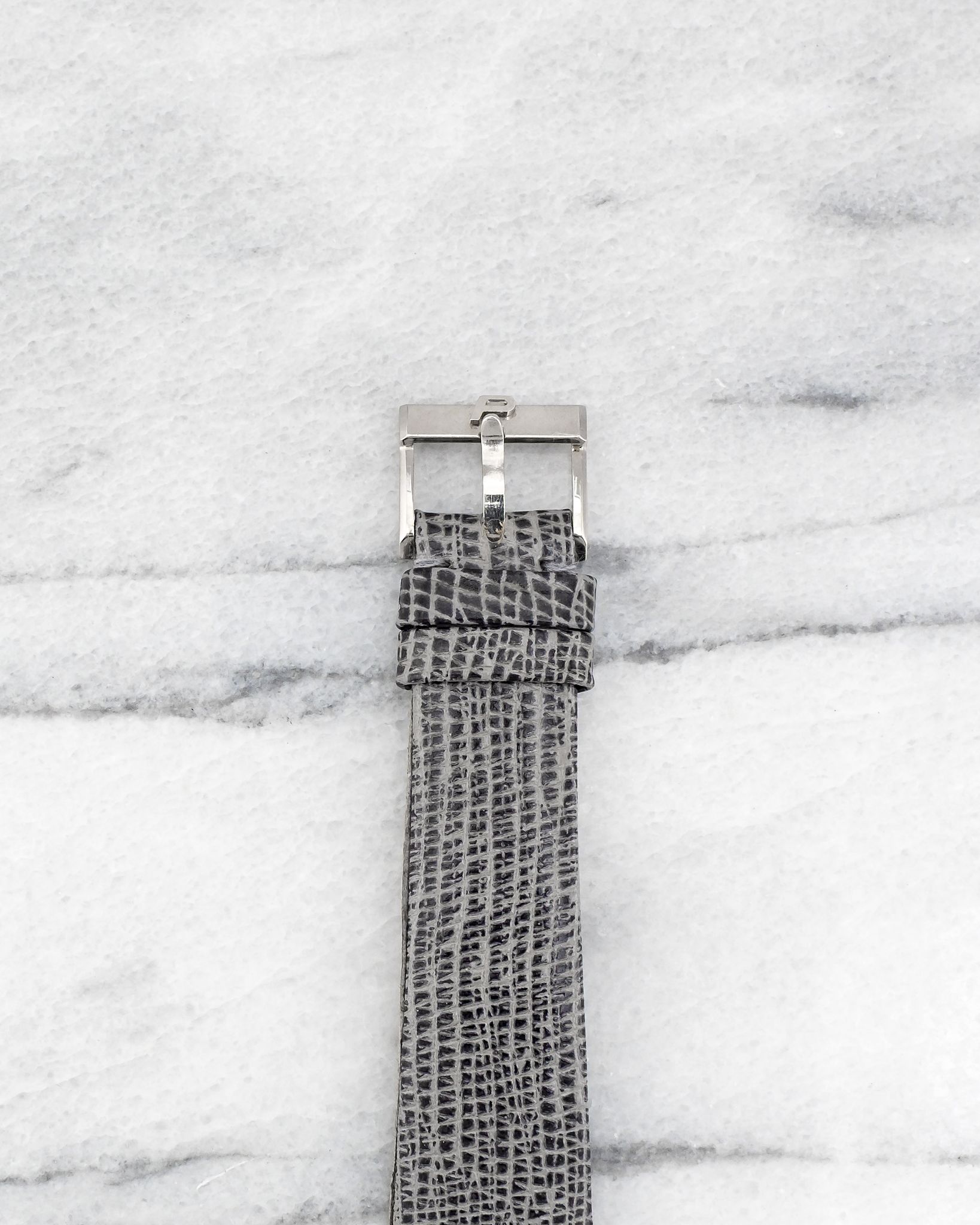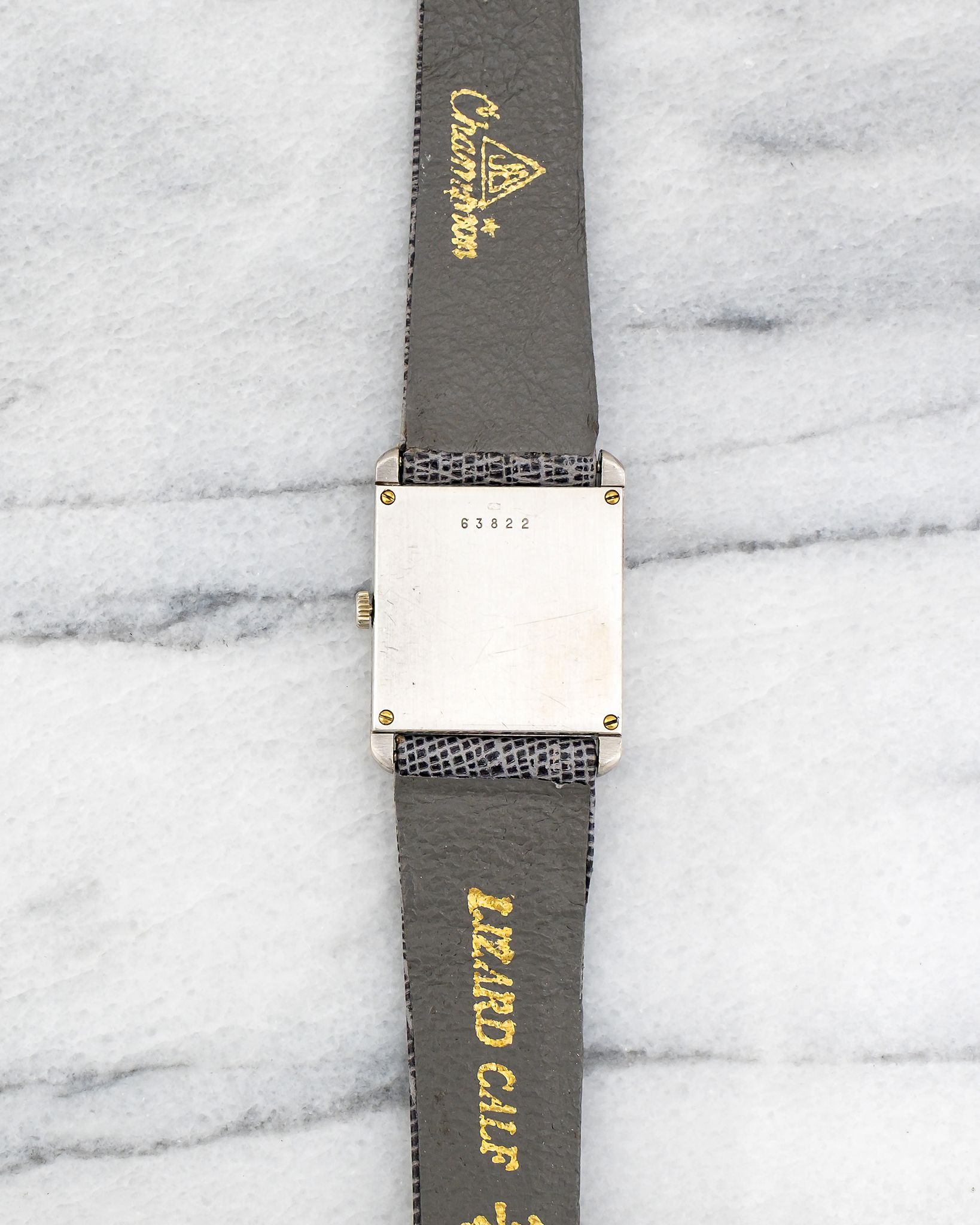 Here's a vintage Audemars Piguet manual wind in 18k white gold with a blue lapis stone dial on a leather strap from the 1970s. Keeps great time and is fully functional. Measurements include a 23x28mm white gold case. It's on a grey leather strap with a gold Piaget buckle. Deep blue lapis dial with a white gold case and minimalistic design. There is a slight crack on the top right of the dial as seen in photos. All parts are original including the signed Audemars Piguet crown, dial, movement, and caseback. Both the dial and case are in great cosmetic, untouched condition.