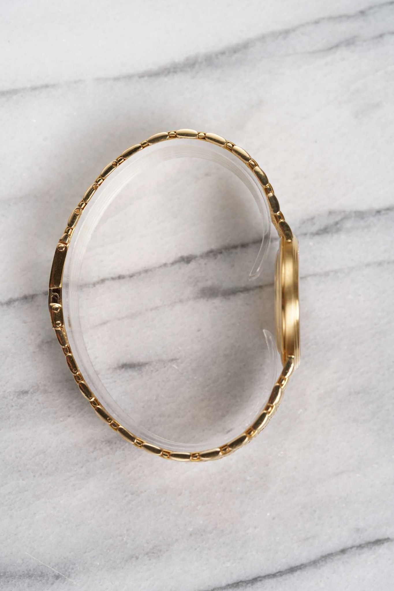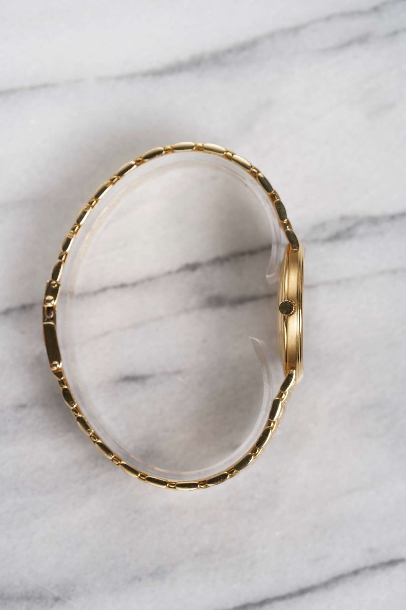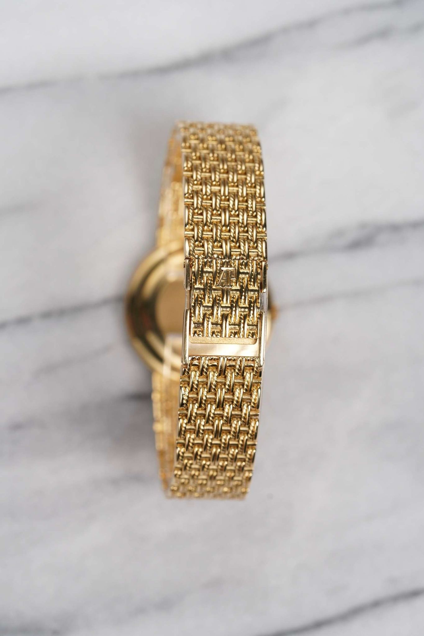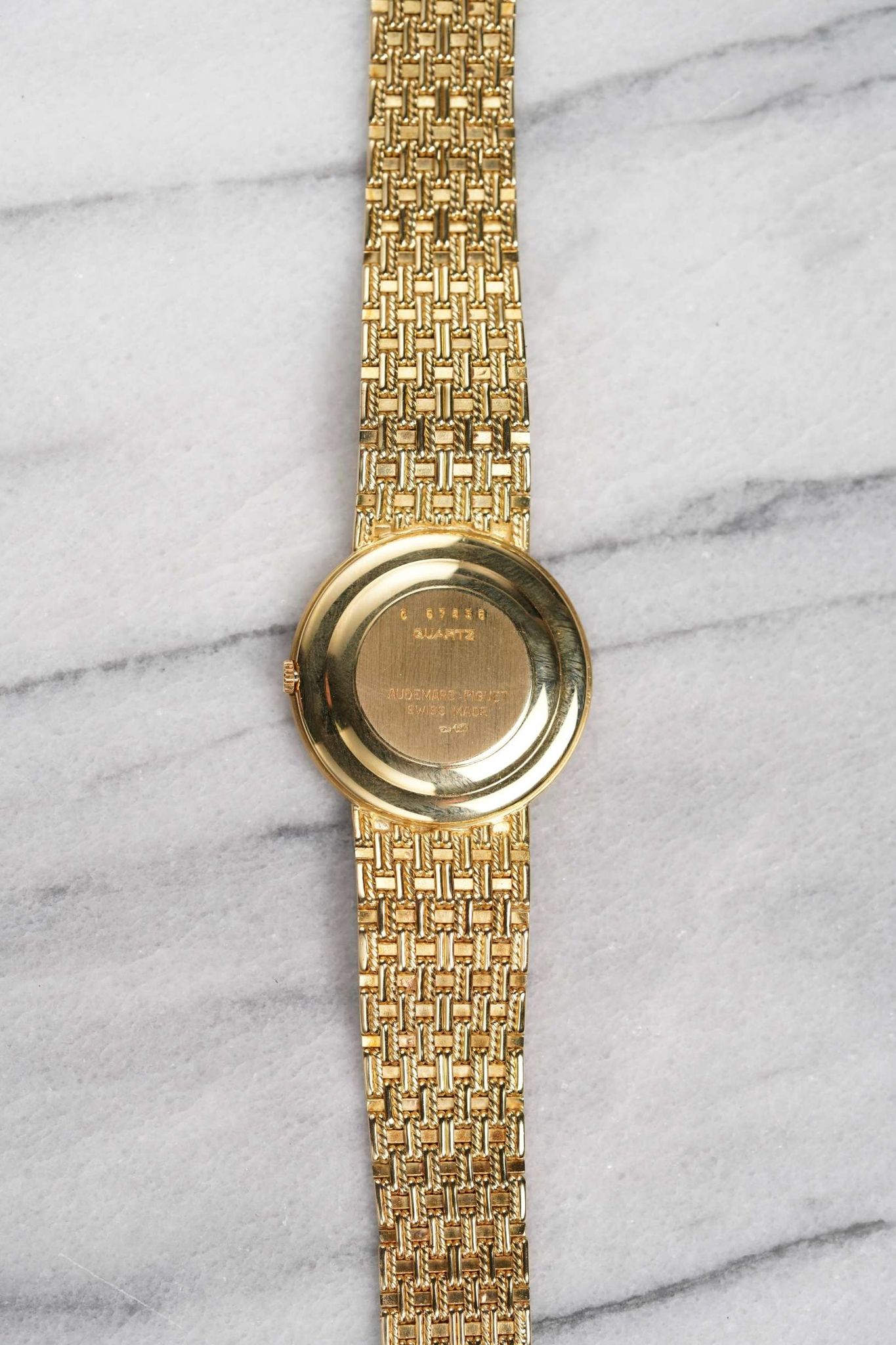 Here we have a vintage Audemars Piguet quartz in 18k yellow gold with an onyx and diamond pave dial from the 1980s. Comes with its pouch and original papers. Keeps great time and is fully functional. Measurements of the case is 32mm including the crown. It's on its original matching integrated 18k yellow gold bracelet measuring 7-7.25 inches long with its micro adjuster. 18K yellow gold case and cashback. Both the dial and crystal are free from any scratches. The bracelet is woven with matching hand-etched finish and case and bracelet. All parts are original including the dial, crown, movement, and caseback. Both the dial and case are in great cosmetic, untouched condition.