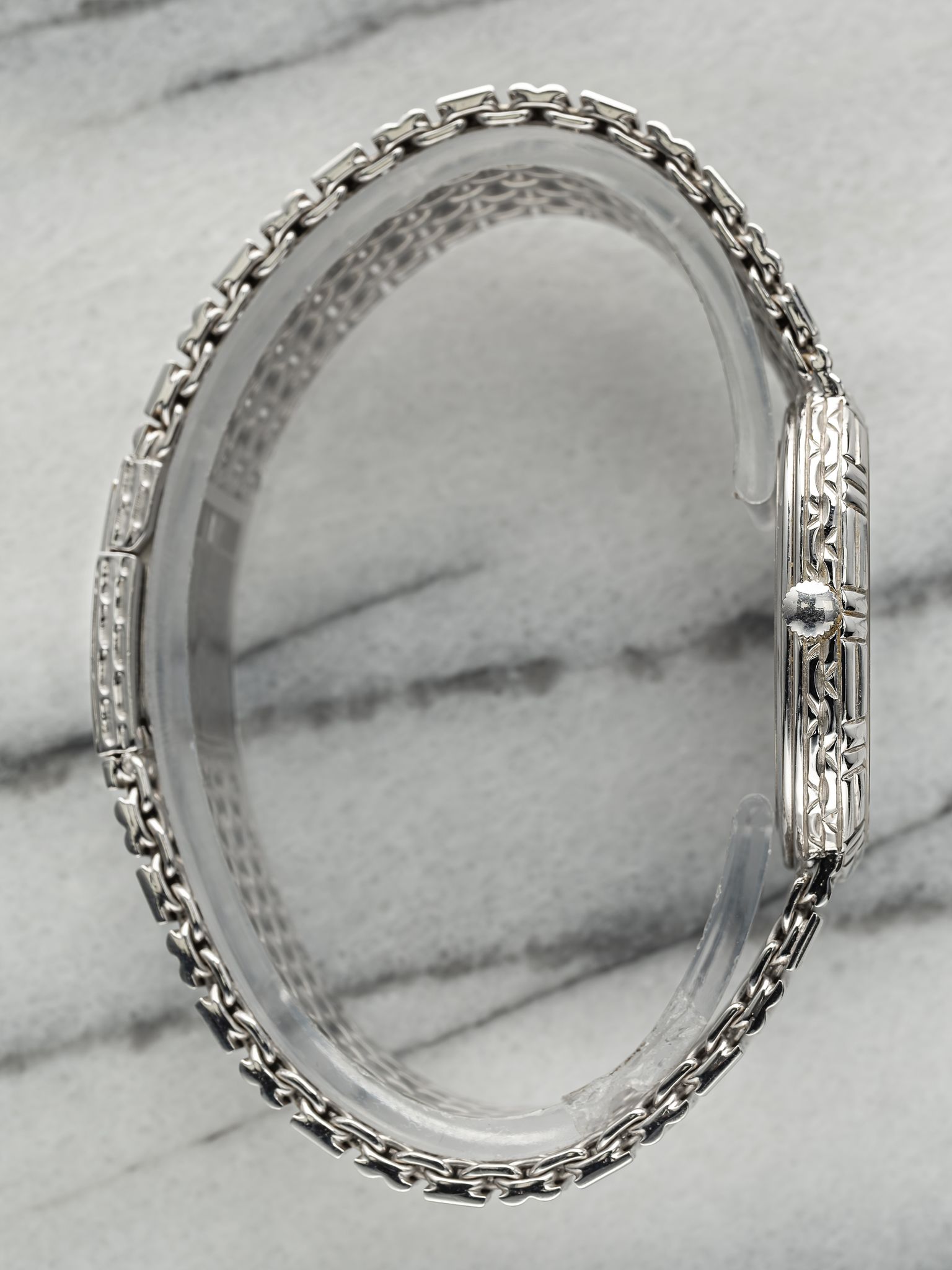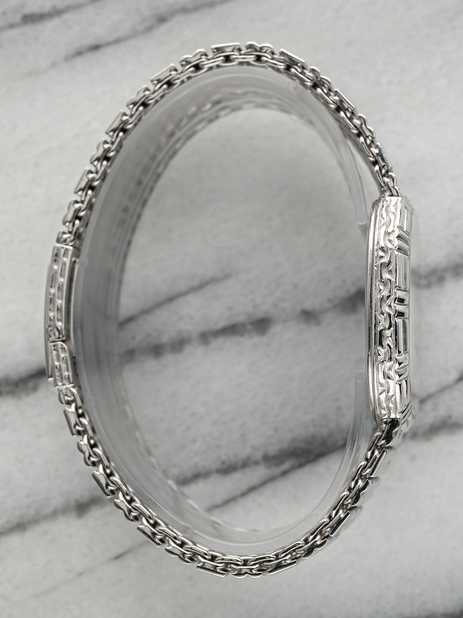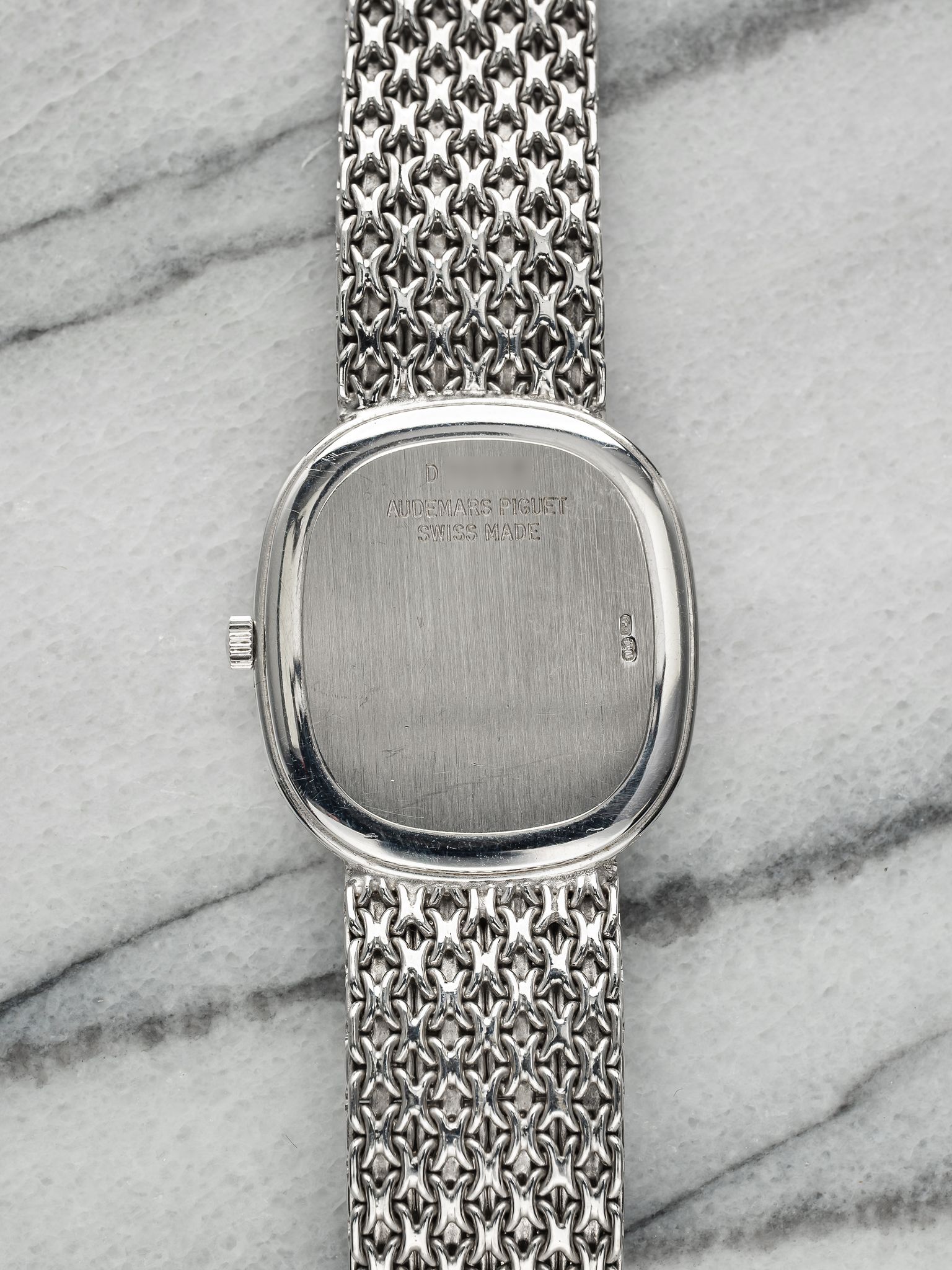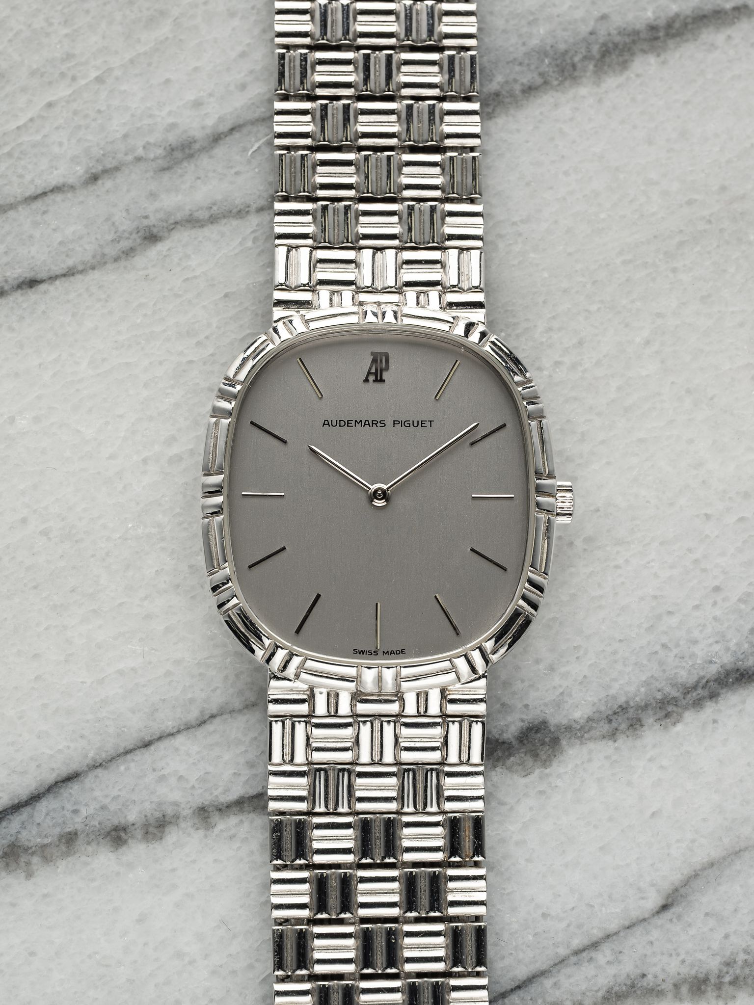 Here we have a vintage Audemars Piguet manual wind in 18k white gold with a silver dial dated from the 1990s (D series) Keeps great time and is fully functional. Measurements of the case are 28mm excluding the crown. It's on its original matching integrated 18k white gold bracelet measuring up to 7 inches long with its micro adjuster. 18K white gold case and case back. Both the dial and crystal are free from any scratches. The bracelet is fully integrated with a puzzle finish through the case. All parts are original including the dial, crown, movement, and caseback. Both the dial and case are in great cosmetic, untouched condition.