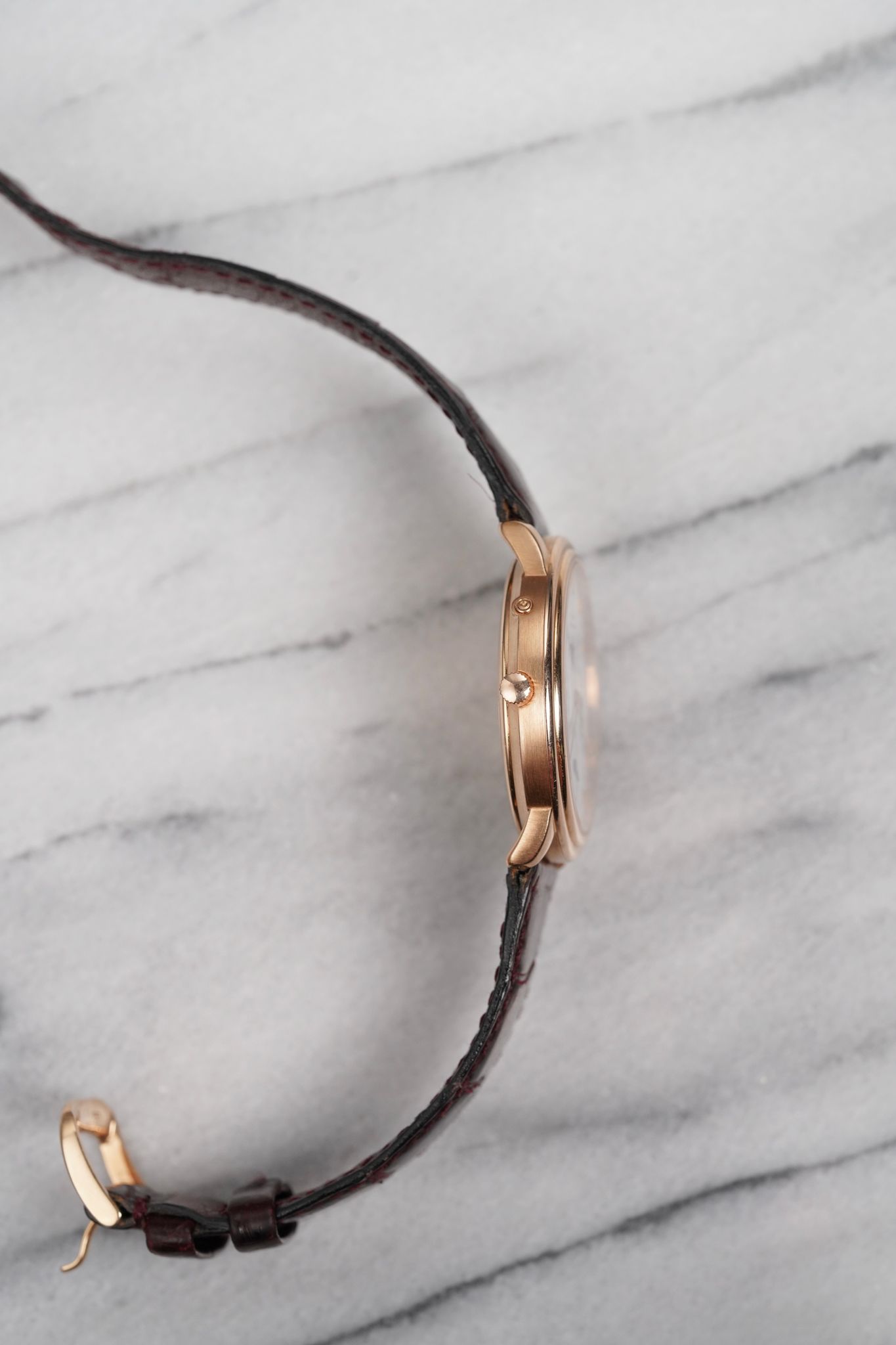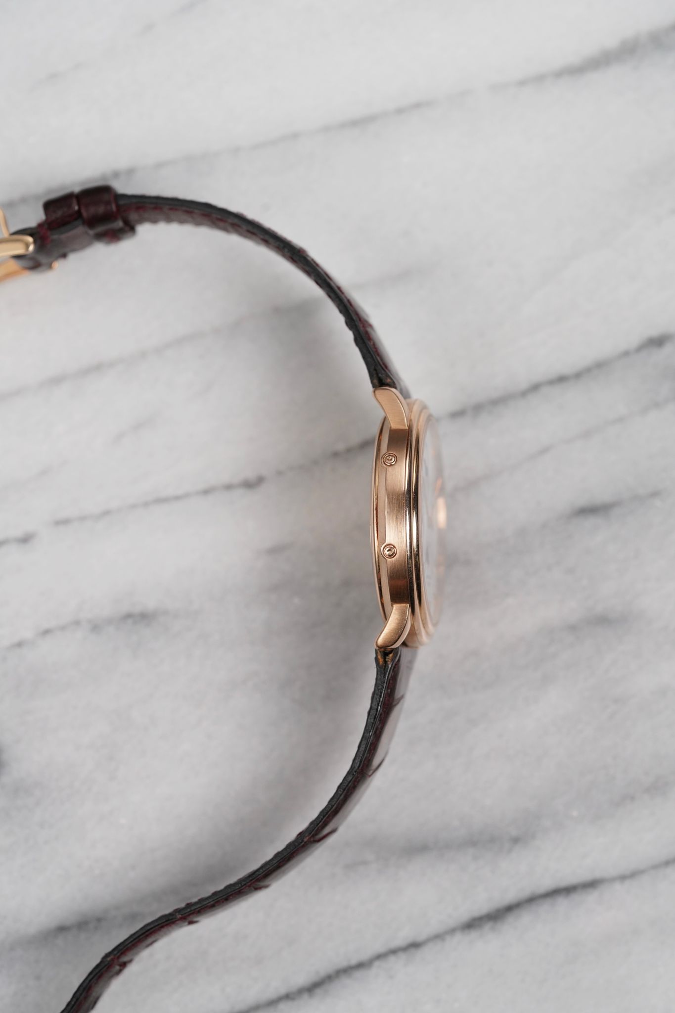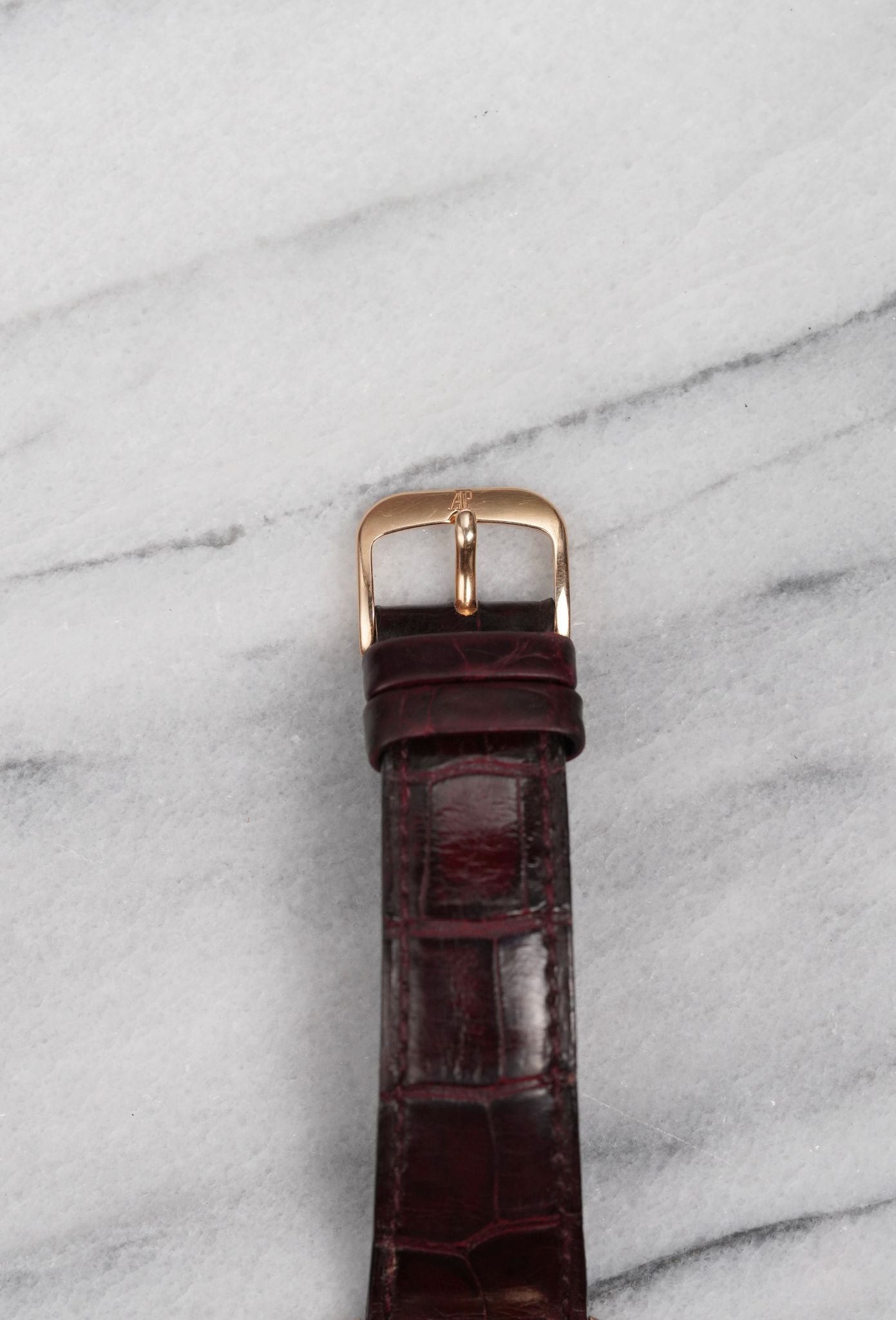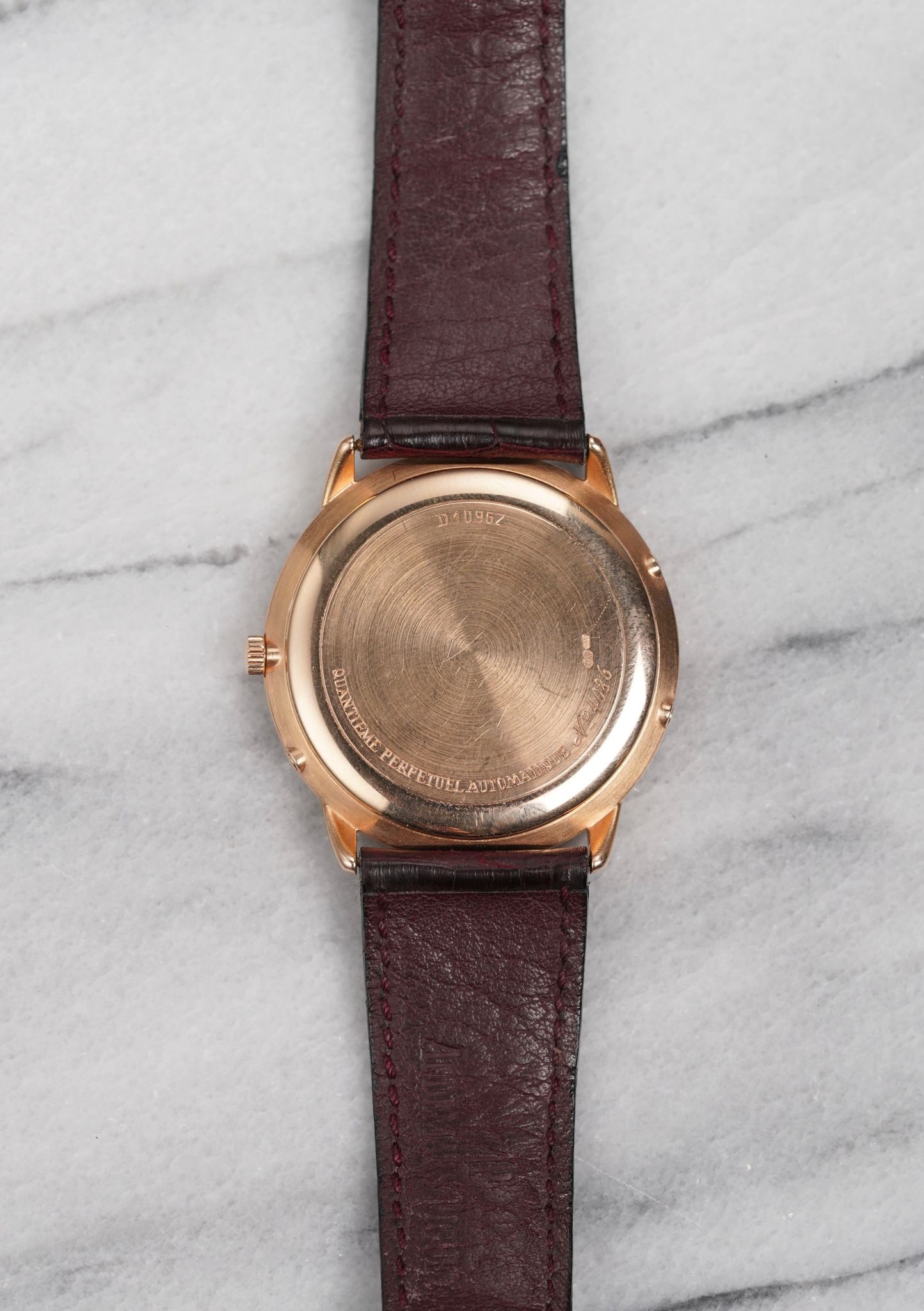 Here’s an Audemars Piguet Quentieme Perpetual in 18K rose gold automatic with a white dial from the 1990s. Unusual to find these examples in rose gold. Reference number 25657OR. Measurments include a 36mm and 20mm lug width. On its original brown alligator leather strap.Complications include the day, date, month, and moonphase complication at 6 a clock. Clear exhibition case back. Original case, dial, and movement. Fully functional and keeping time.