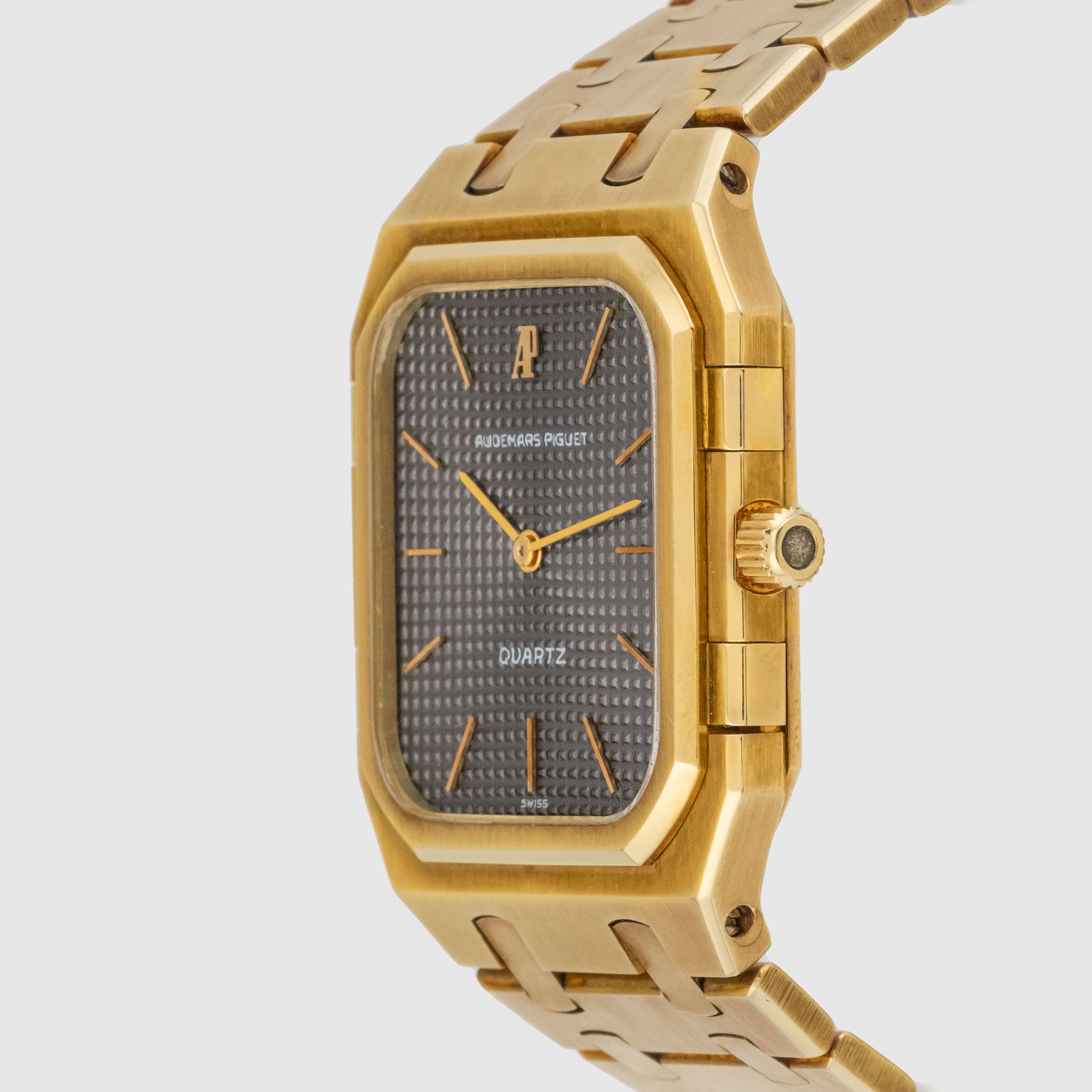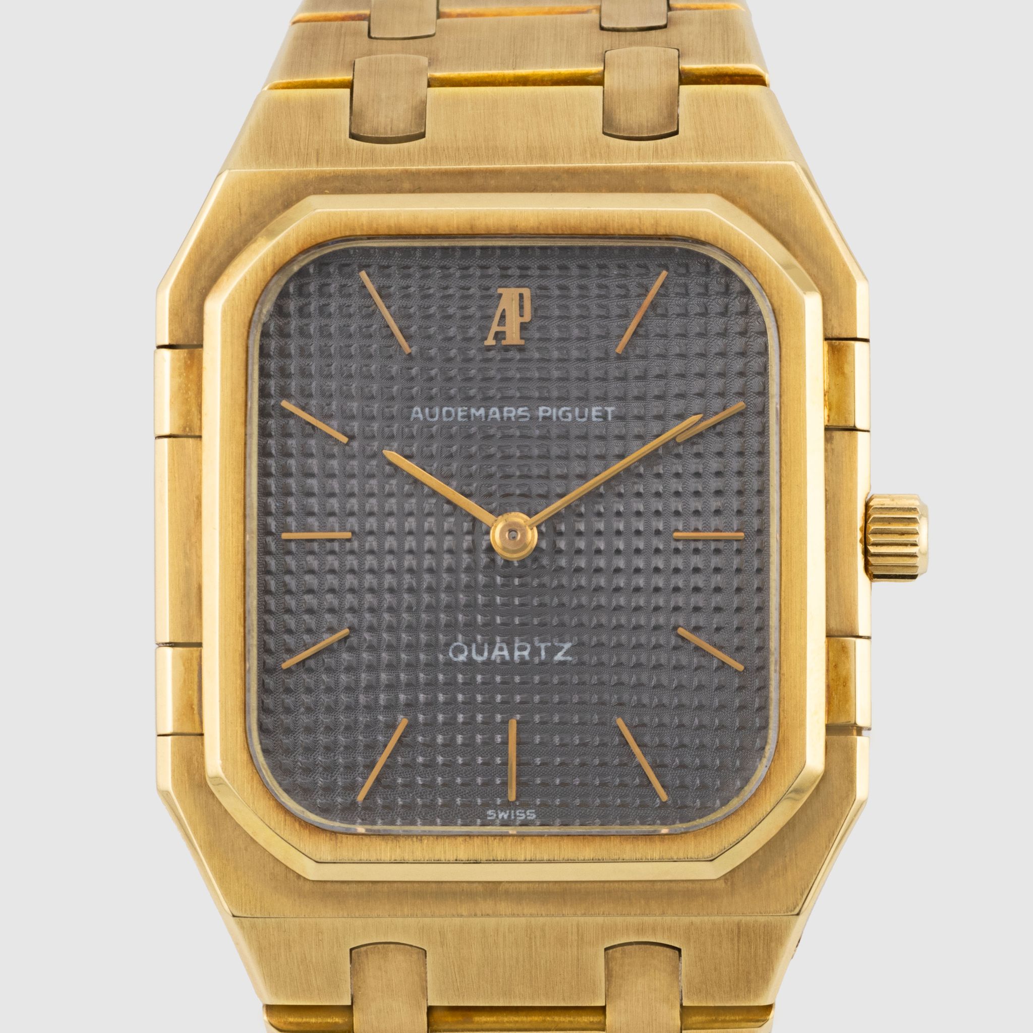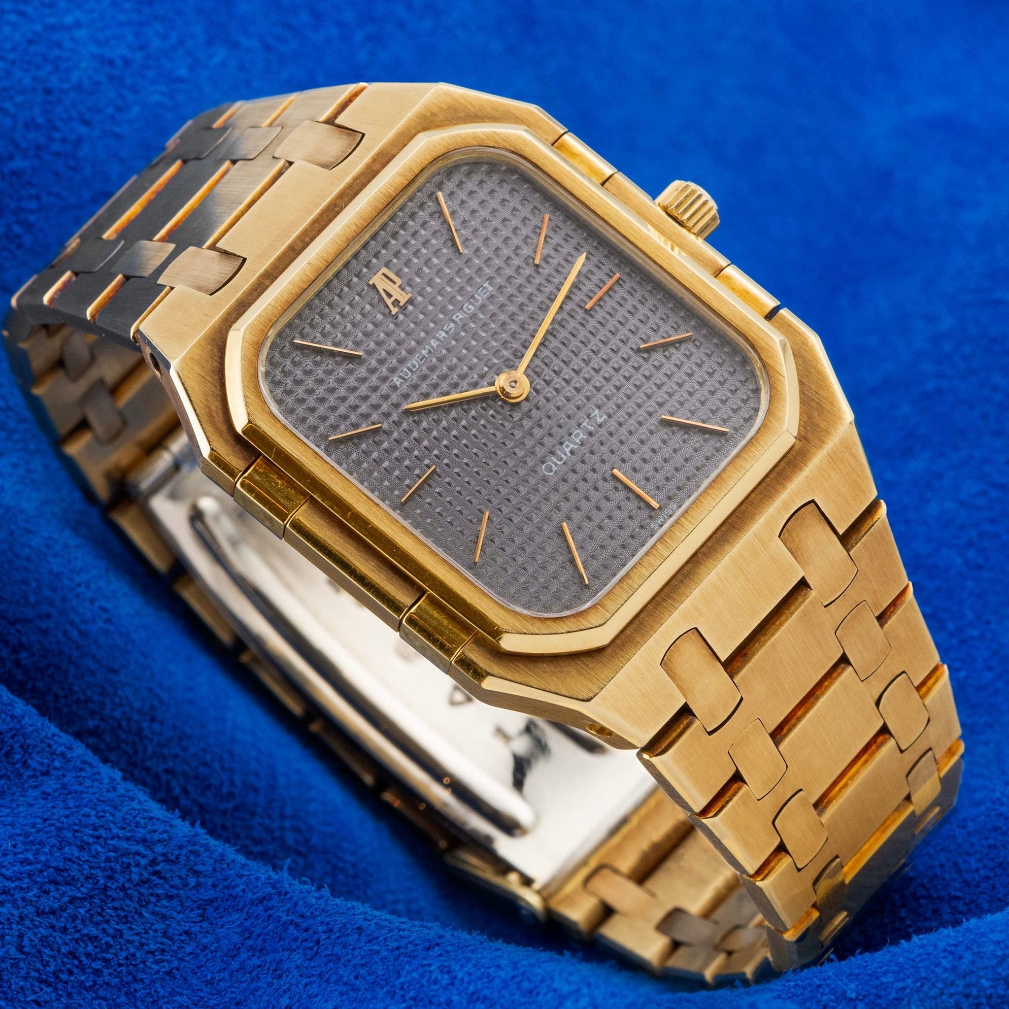 The Square Royal Oak 6005 in Gold is part of the 'Wild Three' alongside the Patek Philippe Nautellipse 3770 and the Square Vacheron 222. These quirky yet aesthetically pleasing designs are rare, making them highly sought after today. This Audemars Piguet 6005SA in 18K yellow gold features a 32x41mm case and an integrated bracelet, offering a great wrist presence as the Jumbo version. In beautiful vintage condition, the gold has aged to a warm hue over the past 40 years. The grey Tapisserie dial, rarer than the black, is in excellent condition. The bracelet and fine dial echo the iconic 5402 Royal Oak, making this watch look stunning on the wrist with its perfect size, color, and proportions.