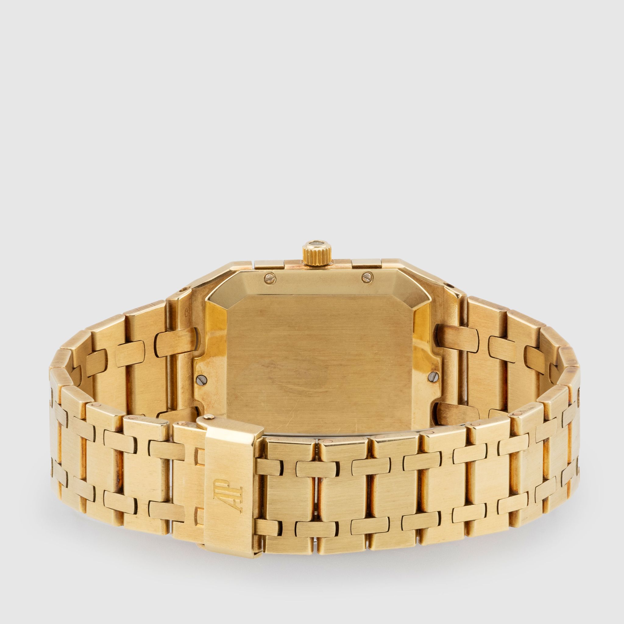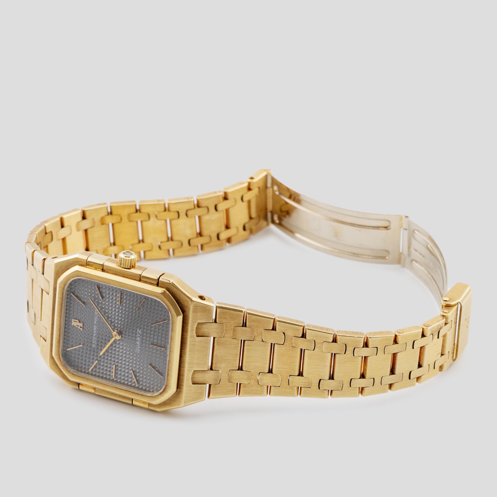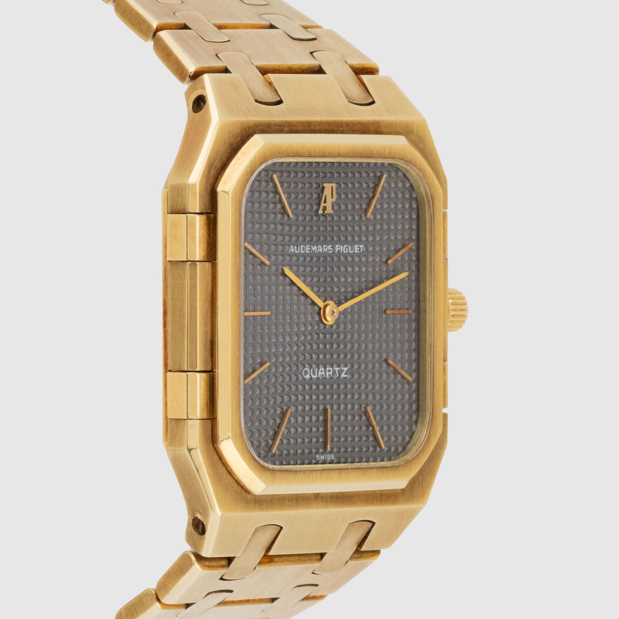 The Square Royal Oak 6005 in Gold is part of the 'Wild Three' alongside the Patek Philippe Nautellipse 3770 and the Square Vacheron 222. These quirky yet aesthetically pleasing designs are rare, making them highly sought after today. This Audemars Piguet 6005SA in 18K yellow gold features a 32x41mm case and an integrated bracelet, offering a great wrist presence as the Jumbo version. In beautiful vintage condition, the gold has aged to a warm hue over the past 40 years. The grey Tapisserie dial, rarer than the black, is in excellent condition. The bracelet and fine dial echo the iconic 5402 Royal Oak, making this watch look stunning on the wrist with its perfect size, color, and proportions.
