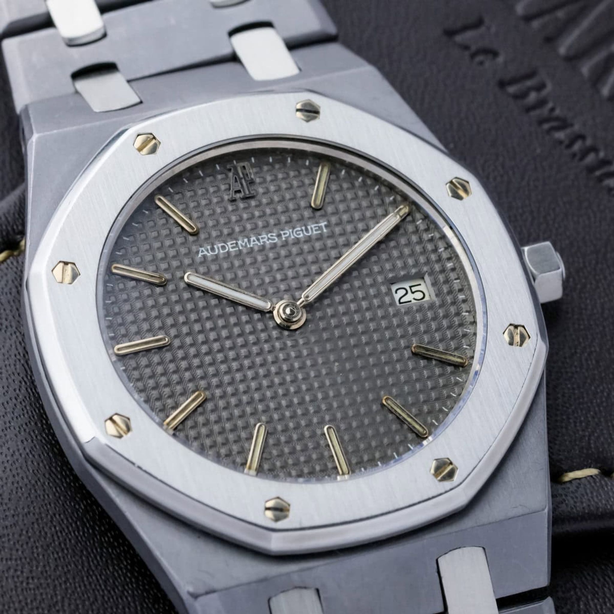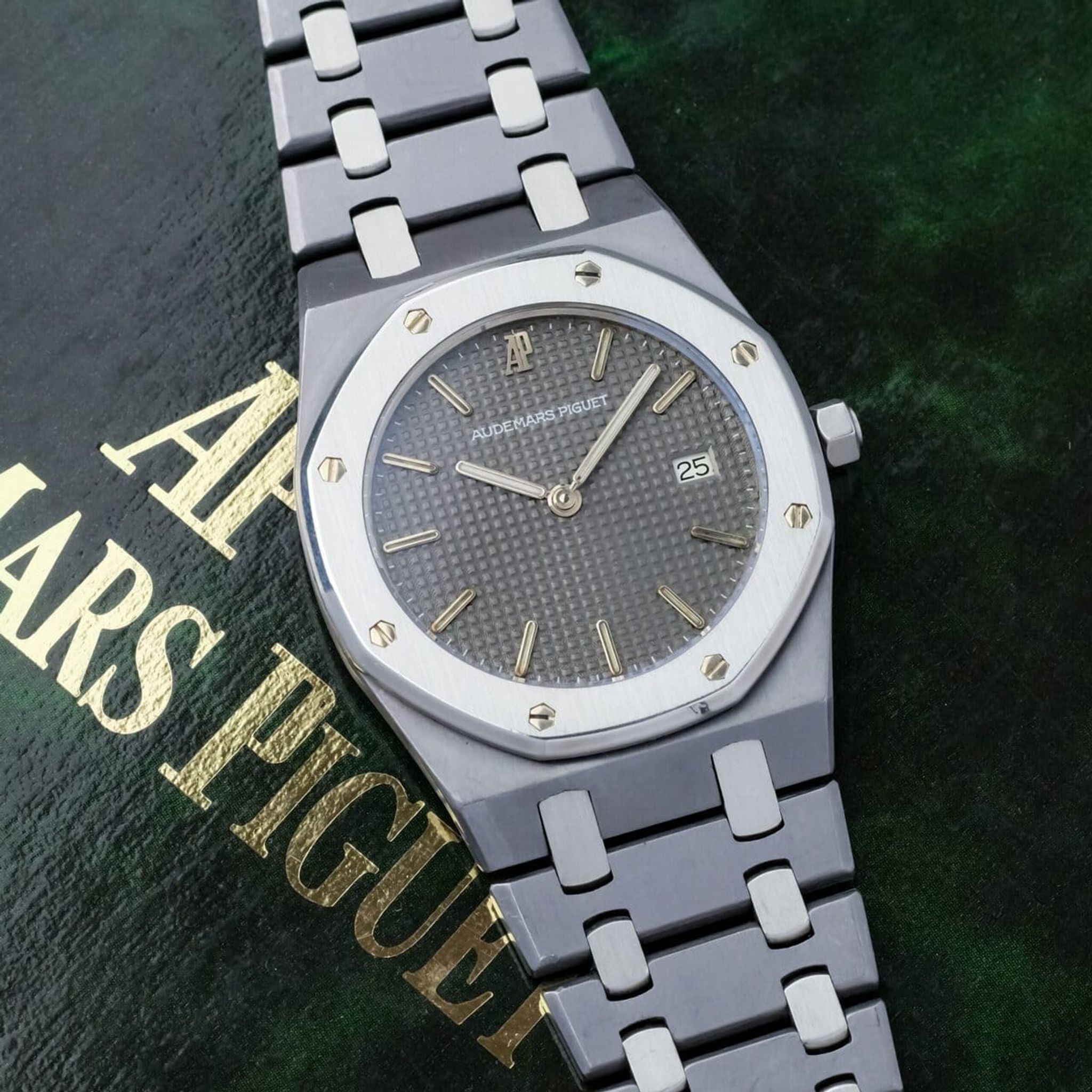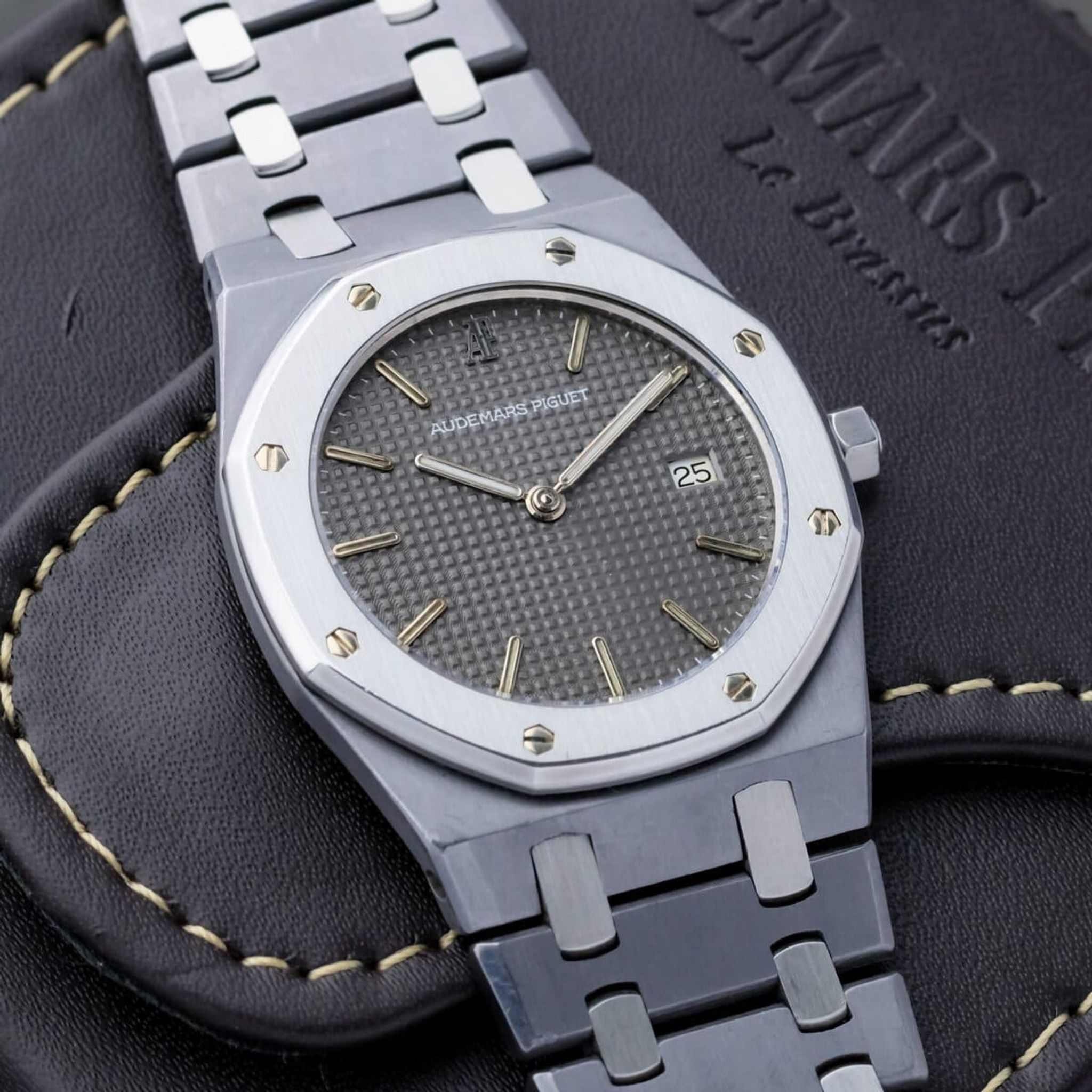 The grey dial features the signature petite tapisserie pattern, applied hour markers and the classic Audemars Piguet logo, creating a sophisticated monochromatic look that complements the unique tones of the case and bracelet. Powered by a reliable quartz movement, the watch delivers both precision and ease of wear.