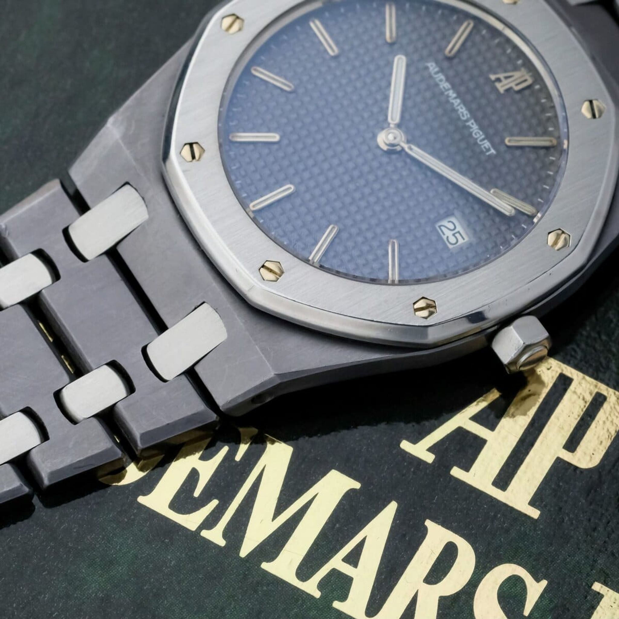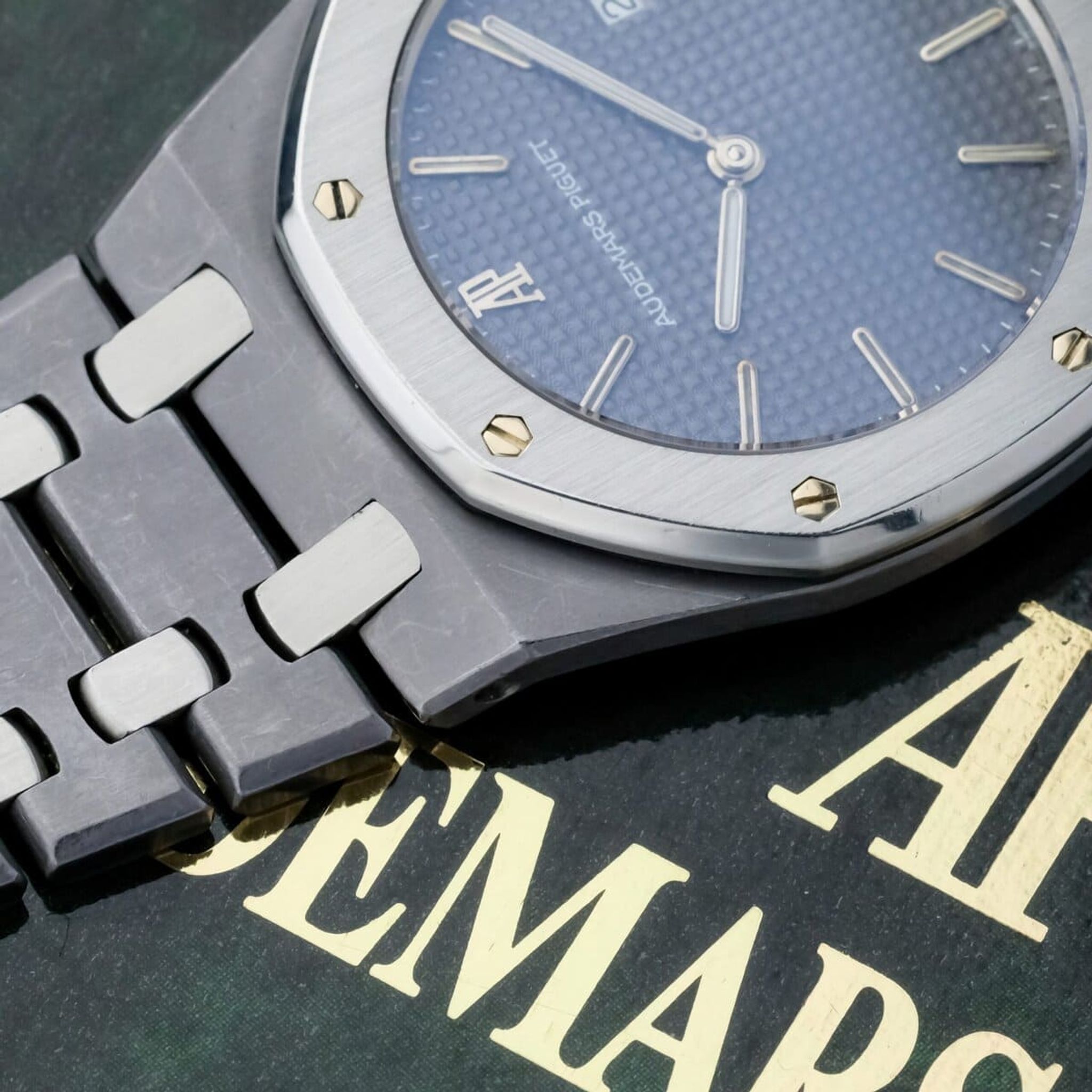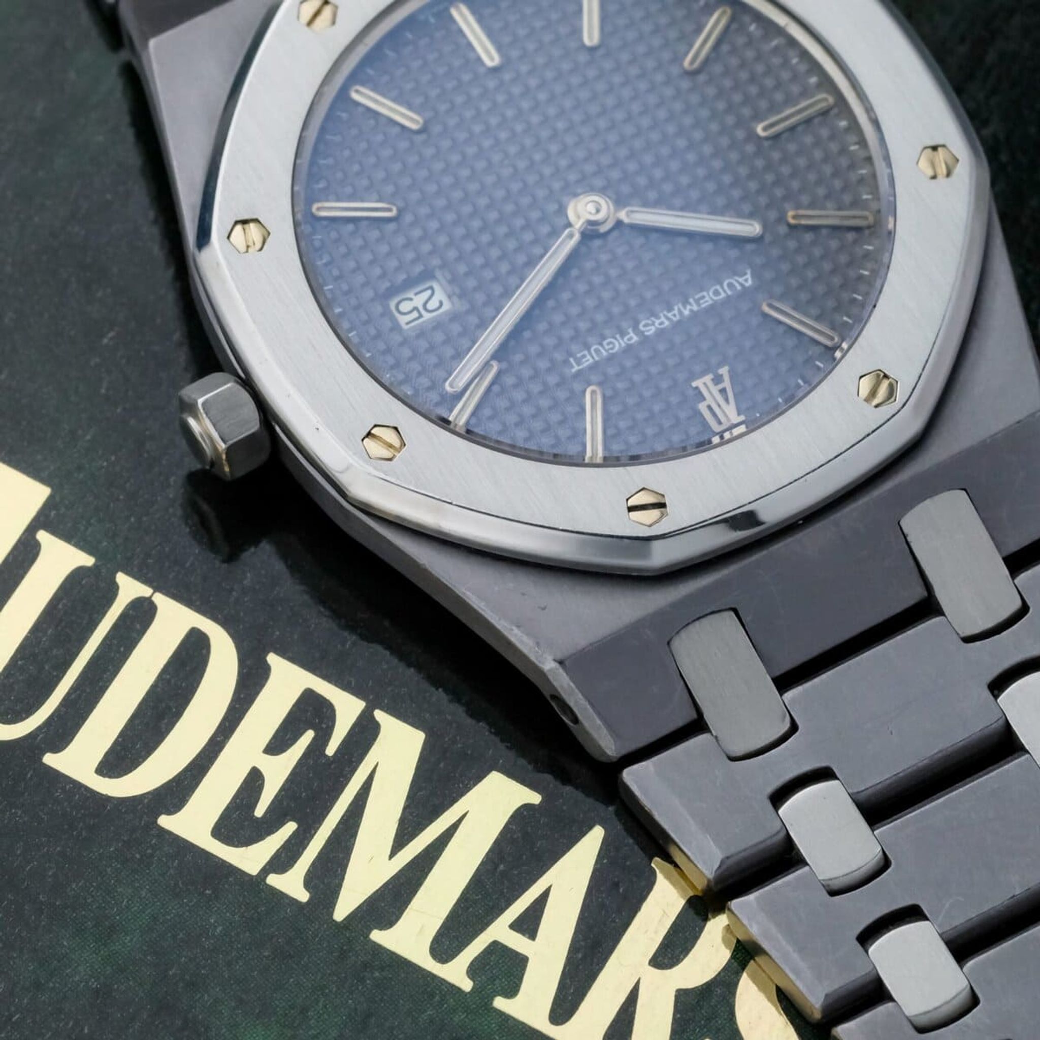 The grey dial features the signature petite tapisserie pattern, applied hour markers and the classic Audemars Piguet logo, creating a sophisticated monochromatic look that complements the unique tones of the case and bracelet. Powered by a reliable quartz movement, the watch delivers both precision and ease of wear.