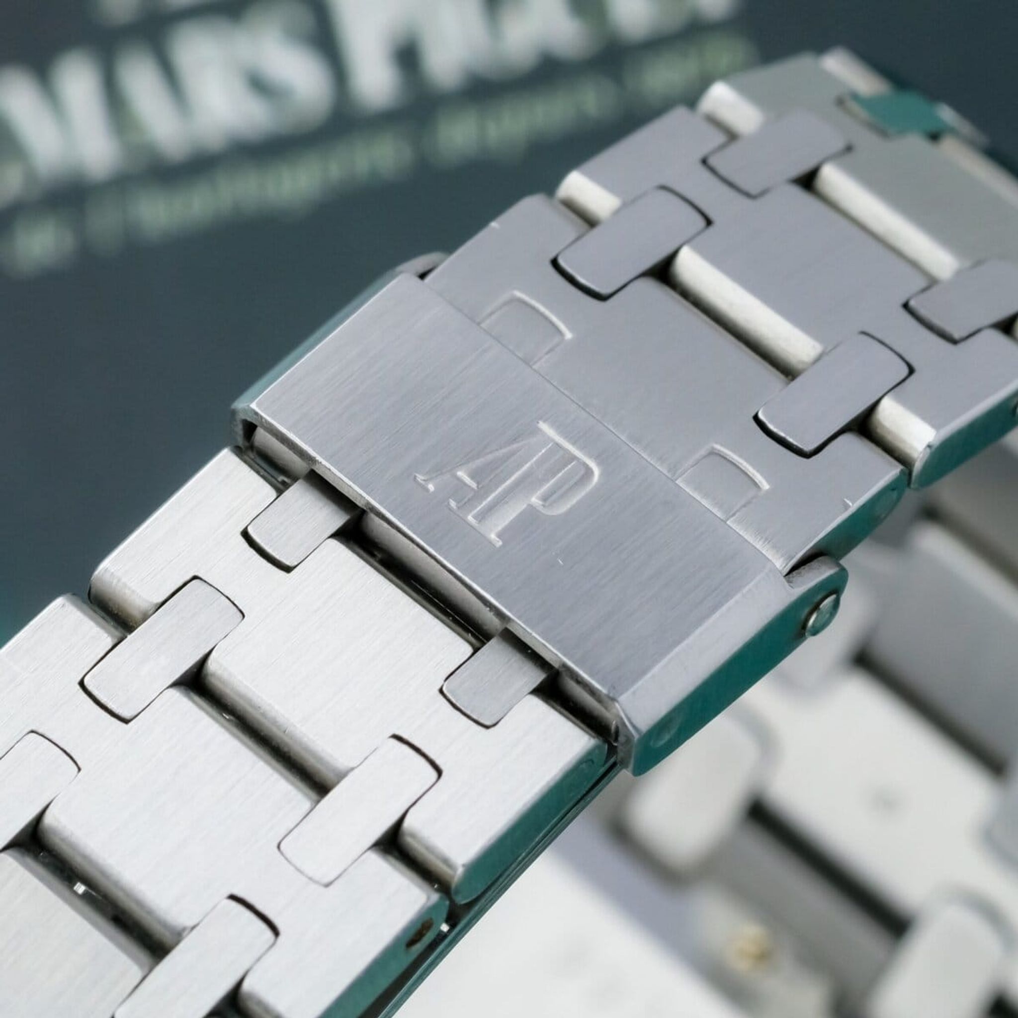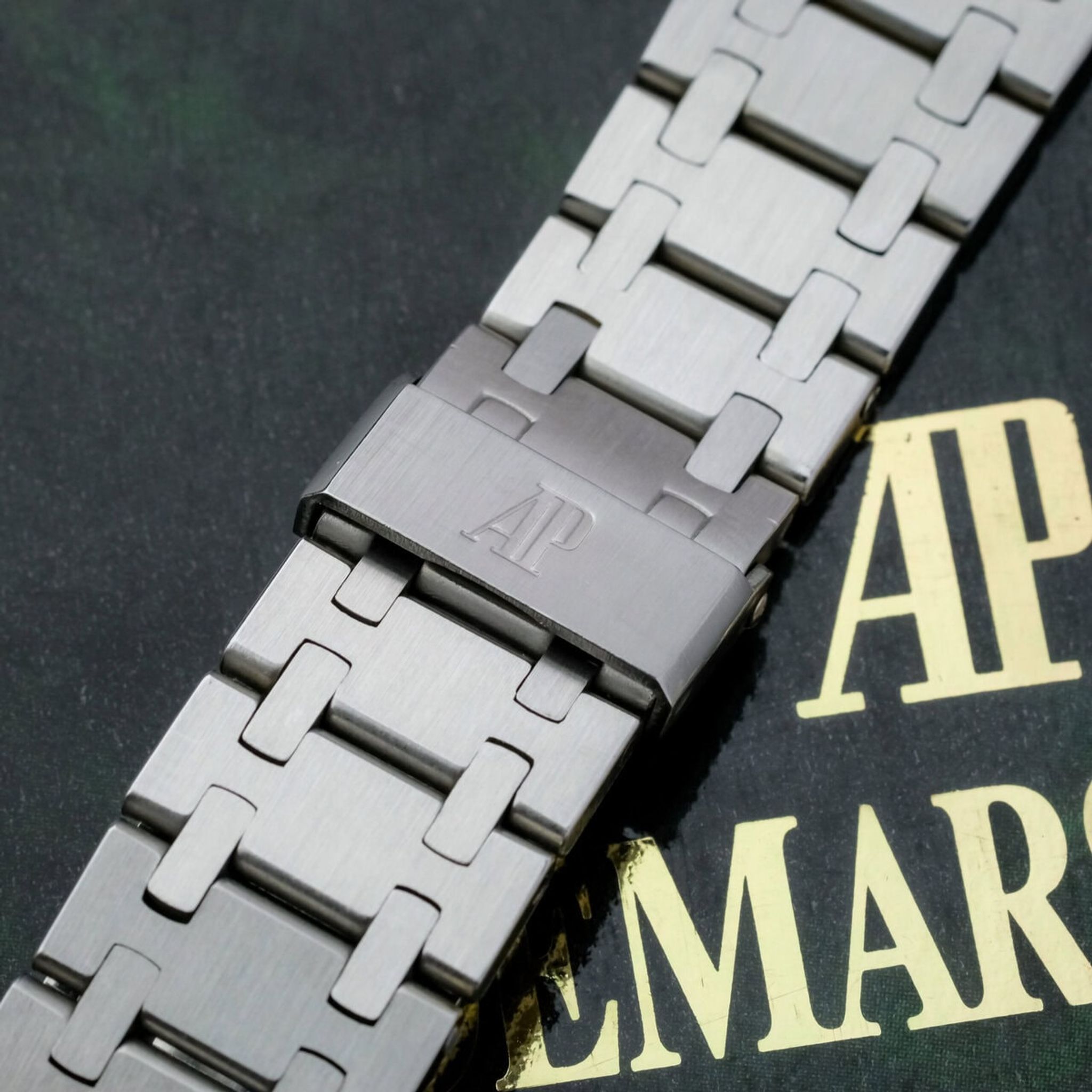 The watch is powered by a precise quartz movement and fitted with an integrated stainless steel bracelet that remains in exceptional condition, showing no stretch and retaining its original factory finishing. The polished and brushed surfaces are perfectly preserved, reflecting the meticulous craftsmanship for which Audemars Piguet is renowned.