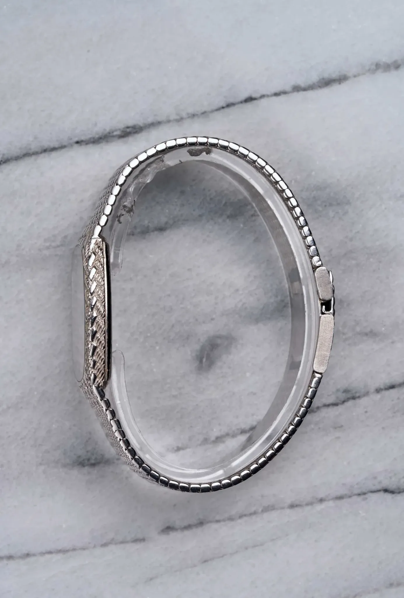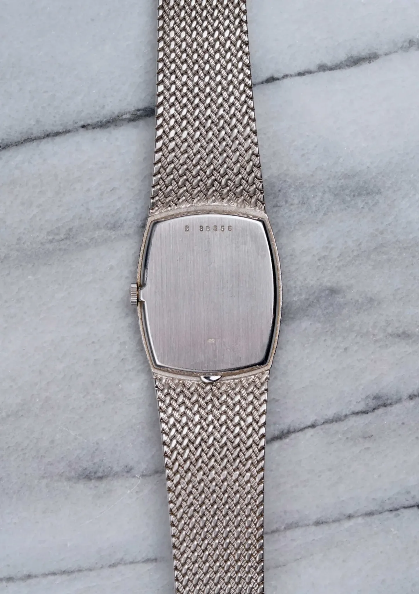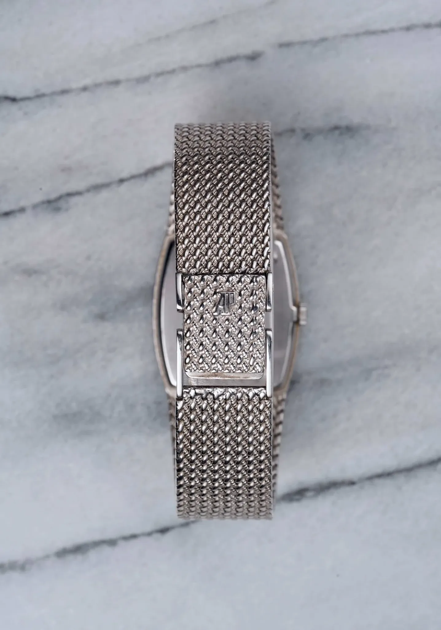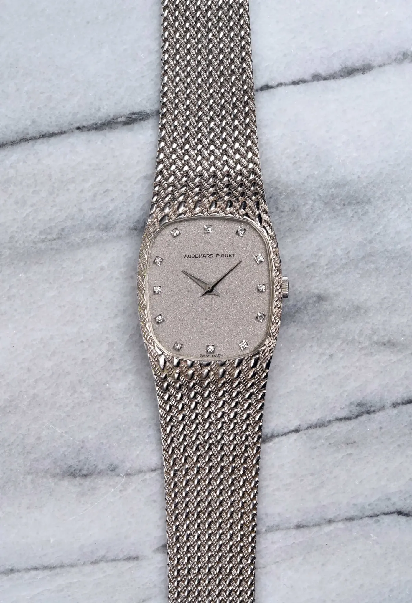 Here we have a vintage Audemars Piguet cobra manual wind in 18k white gold with a silver glitter finish diamond dial with sword hands dated from 1976-1979. Keeps great time and is fully functional. Measurements of the case is 28x28mm including the crown. It's on its original matching integrated 18k white gold bracelet measuring 6.5-6.75 inches long with its micro adjuster. The total weight of the watch is 75.6 grams. 18K white gold case and cashback. Both the dial and crystal are free from any scratches. The bracelet is woven with matching hand-etched finish and case and bracelet. All parts are original including the dial, crown, movement, and caseback. Both the dial and case are in great cosmetic, untouched condition.