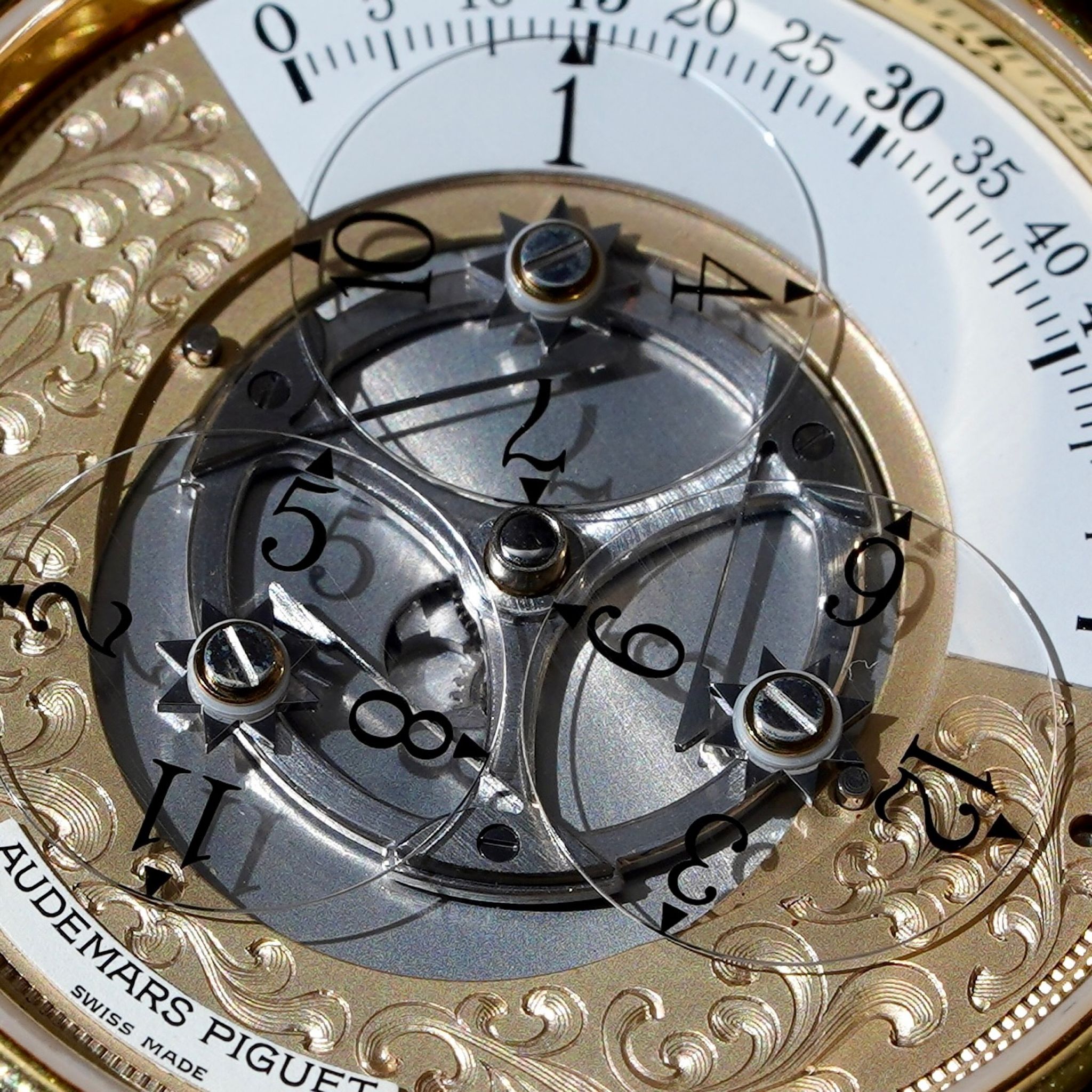 LE BRASSUS, SWITZERLAND : Launched in 1991 and inspired by the Campani clock, the Audemars Piguet ref. 25720BA "Star Wheel" shows time via three sapphire disks that rotate along the top of the dial. Each sapphire disk passes over the minute track, displaying the hour as it moves across; highlighting the cyclical nature of time as influenced by the sun's movement across the sky.