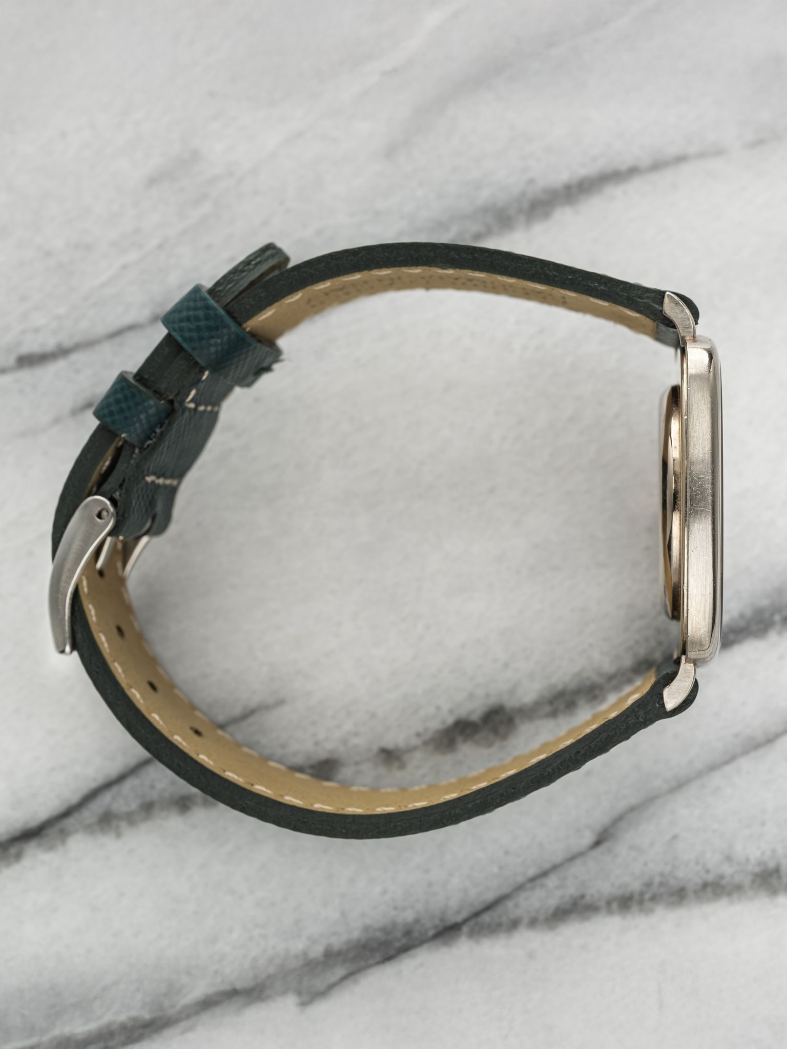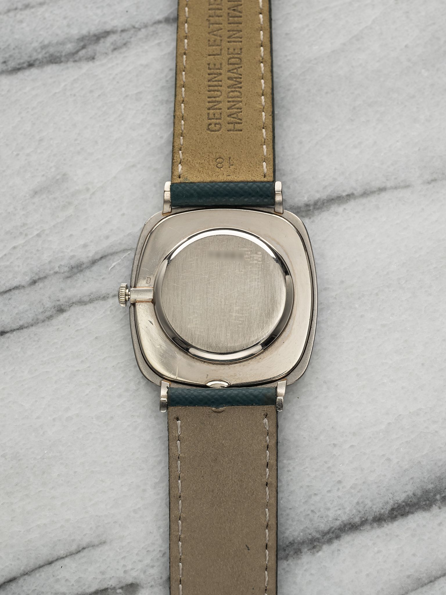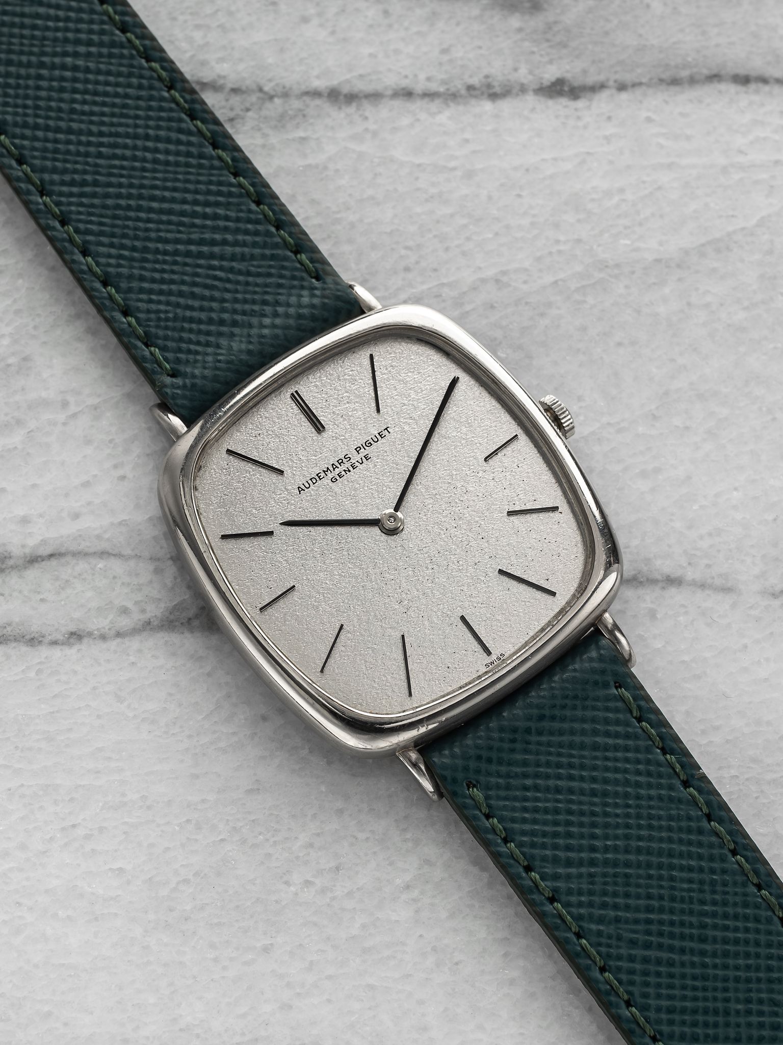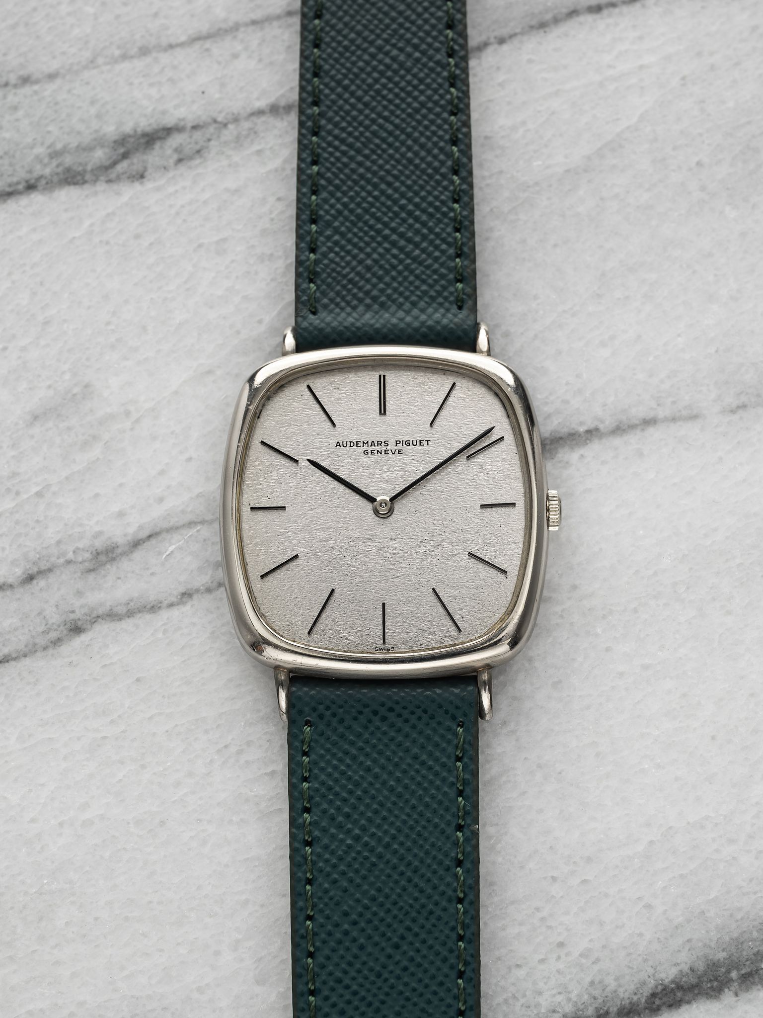 Here's a vintage Audemars Piguet manual wind in 18K white gold with a silver textured dial from the 1970s. Keeps great time and is fully functional. Measurements include a 32mm case size across and an 18mm lug width. On an aftermarket green leather strap (made in Italy). White gold case. Matching stick hands and hour markers. The piece is unisex , it can be worn by both men and women. The piece is great alternative and value from other pieces offered by AP. All parts are original including the dial, case, and movement. the dial and case are in great cosmetic, untouched condition.