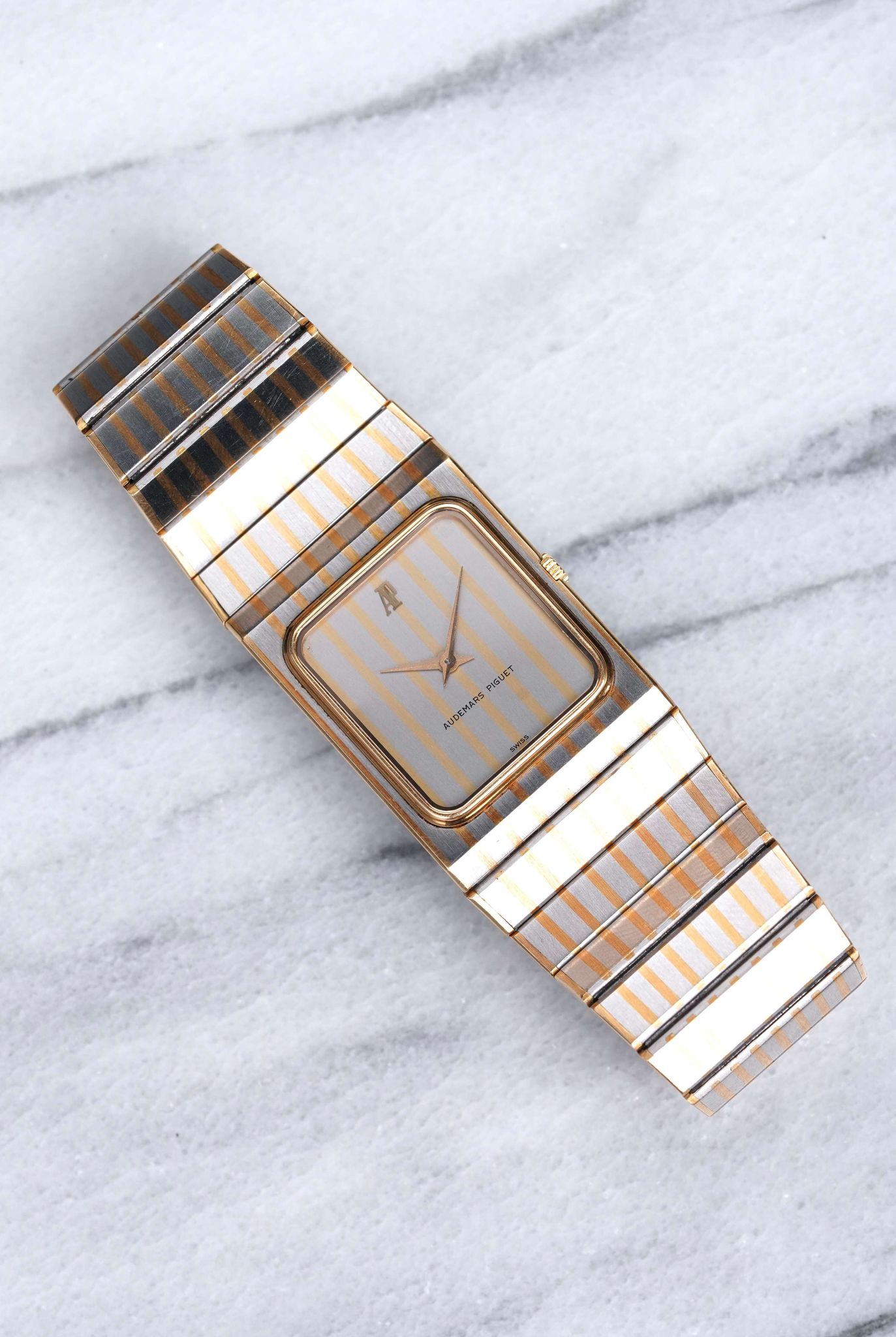 Here’s a rare vintage Audemars Piguet "zebra" manual wind silver dial from the 1970s. Measurements include a 25x30mm rectangular case in a striking two-tone “zebra” pattern. Bracelet fits up to a 7.25 inch wrist. Time only. dauphine hands. 18K yellow gold two tone bracelet. The yellow stripes are hammered into the watch for that flat look. There are 4 aftermarket links added on to the bracelet from the previous owner.
