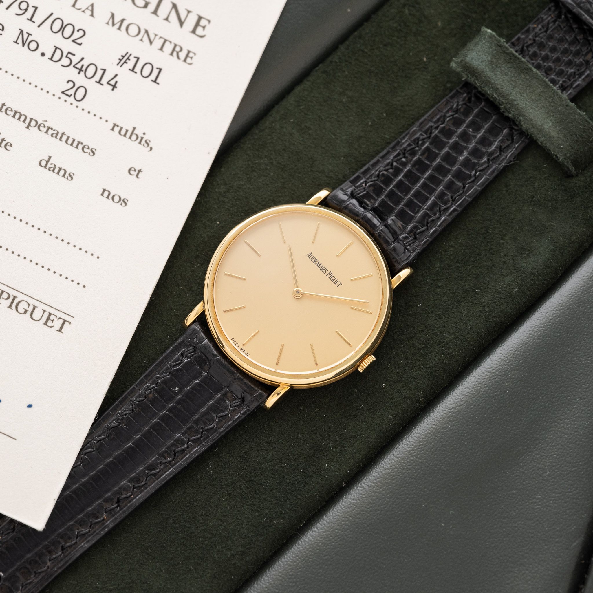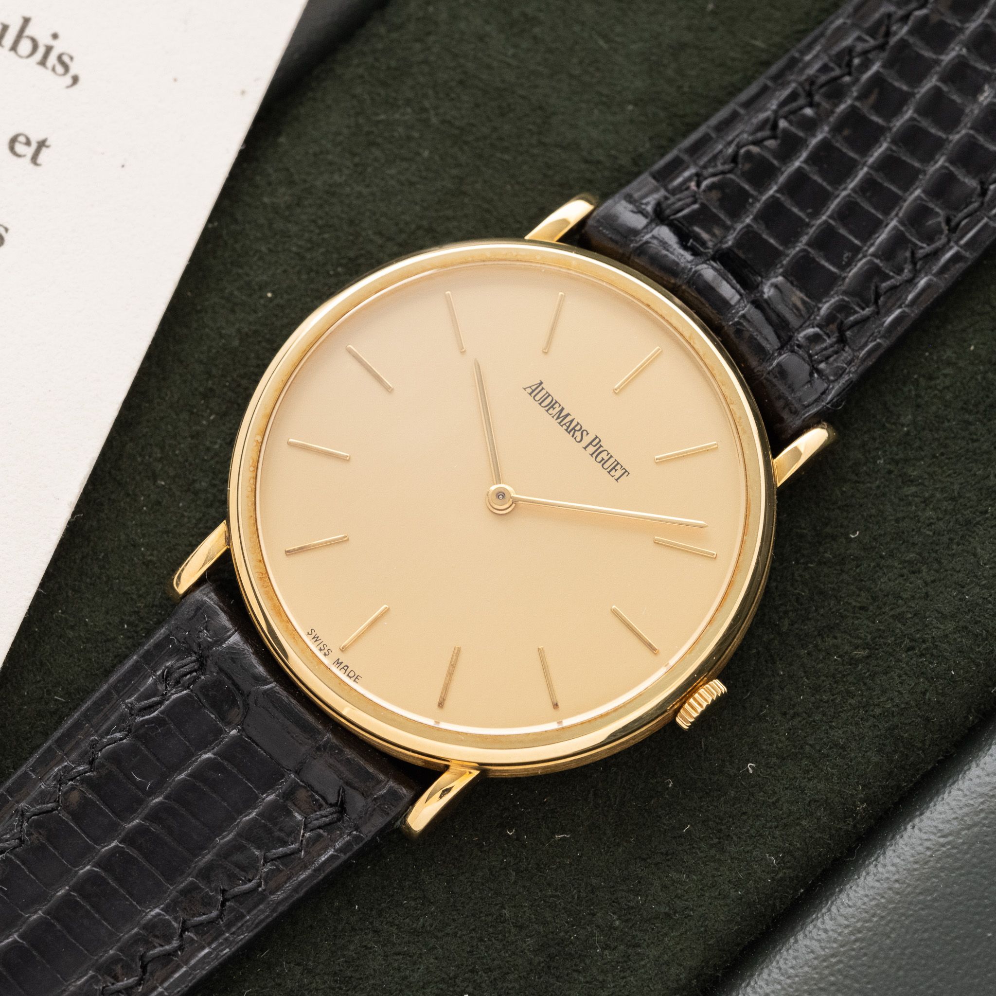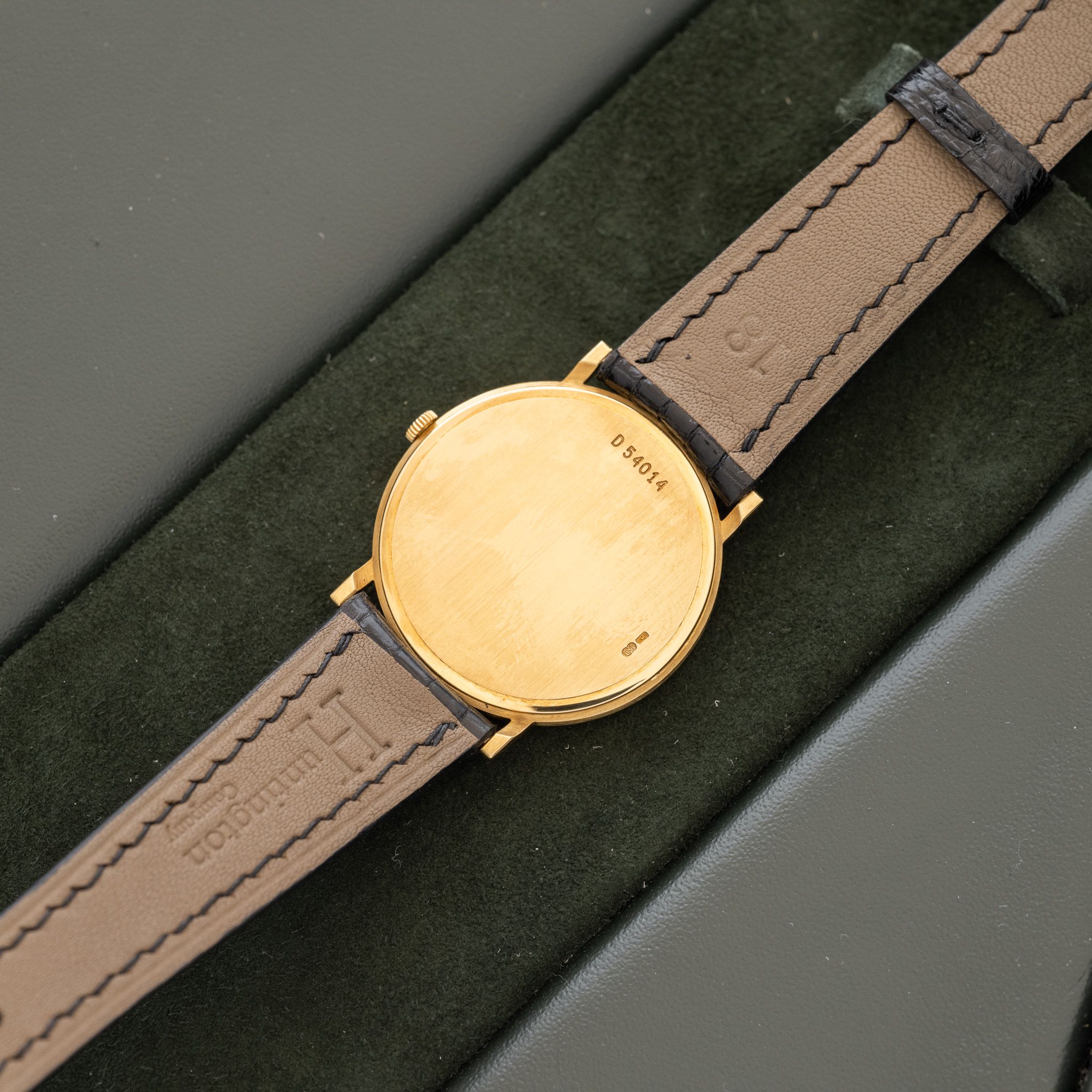 Case: The size is 31mm with an ultra slim profile. The 18k yellow gold case is in unpolished condition.