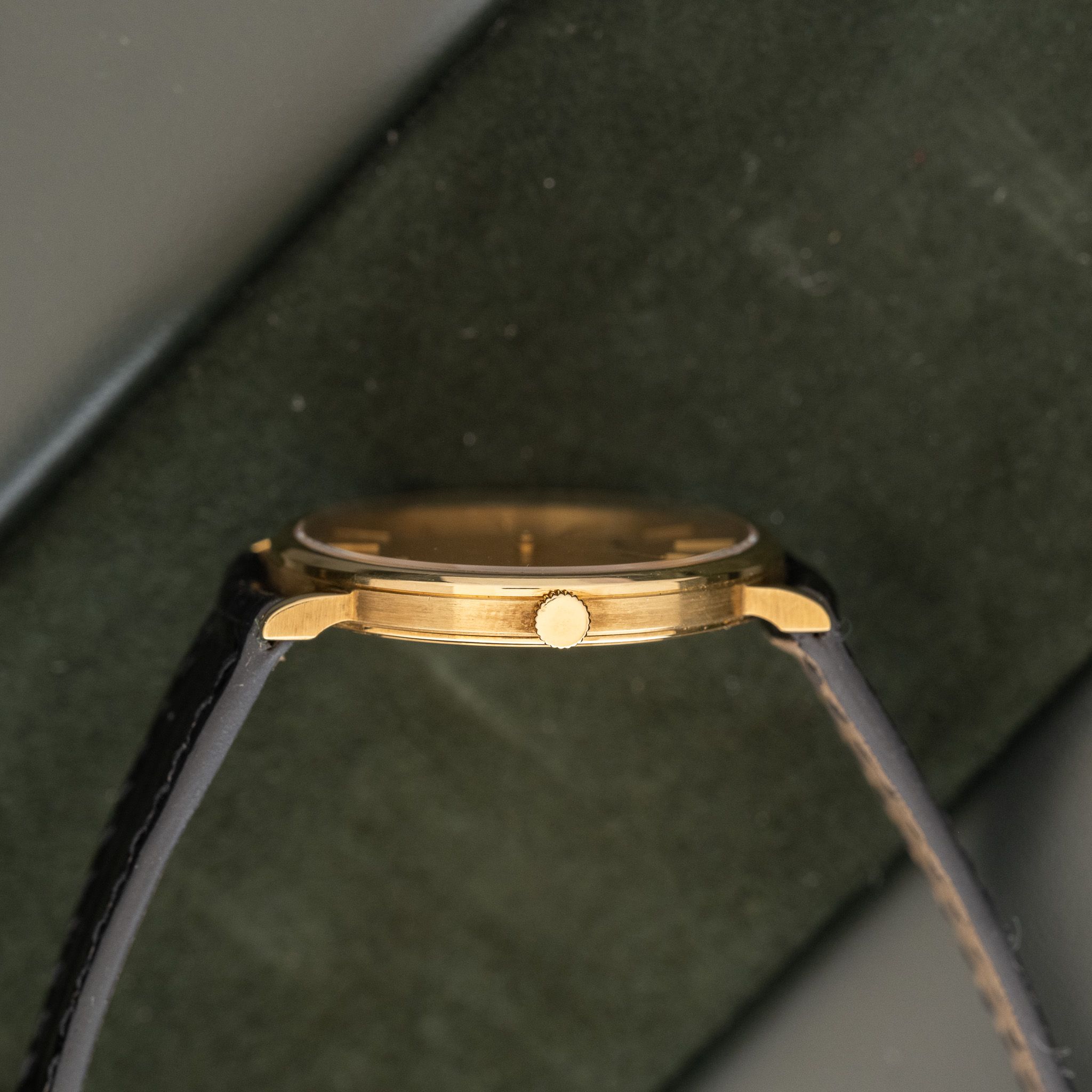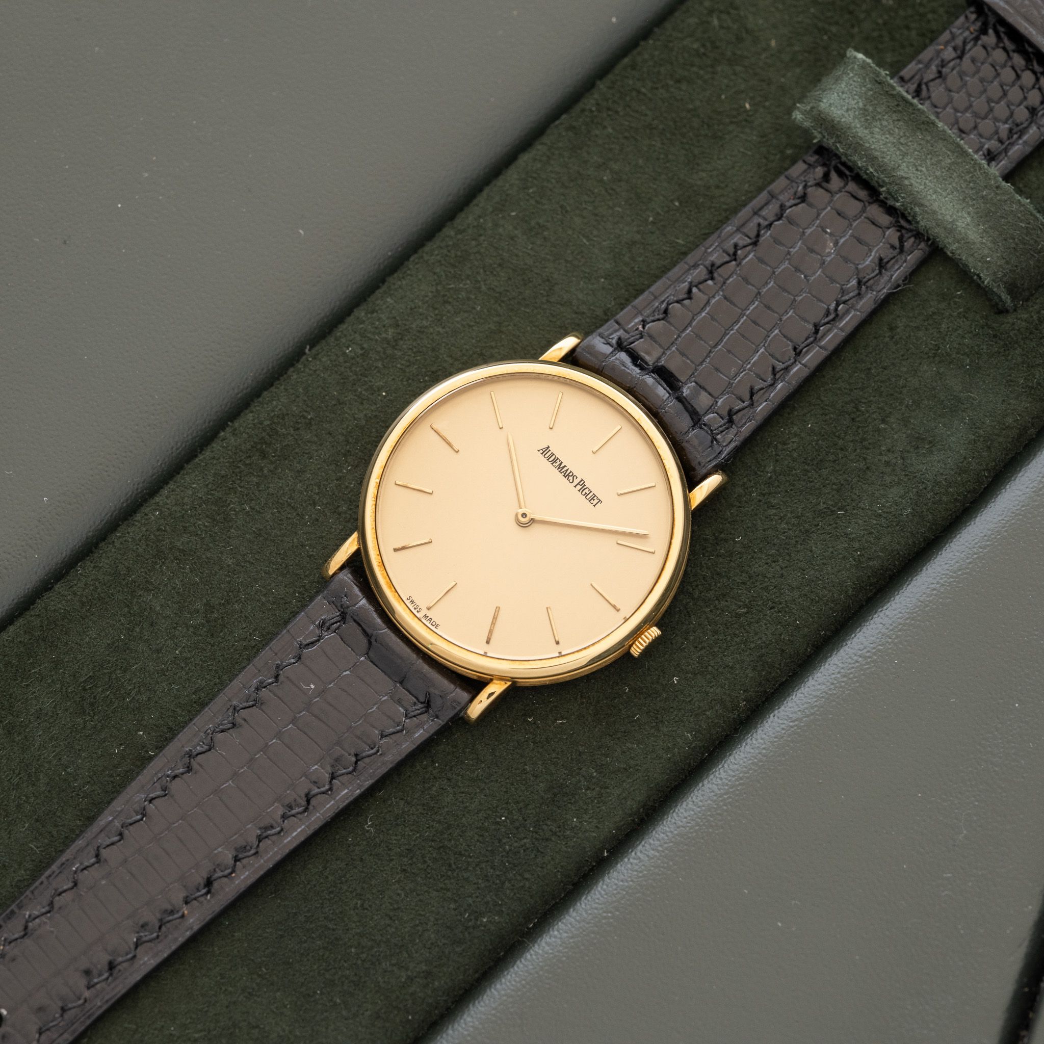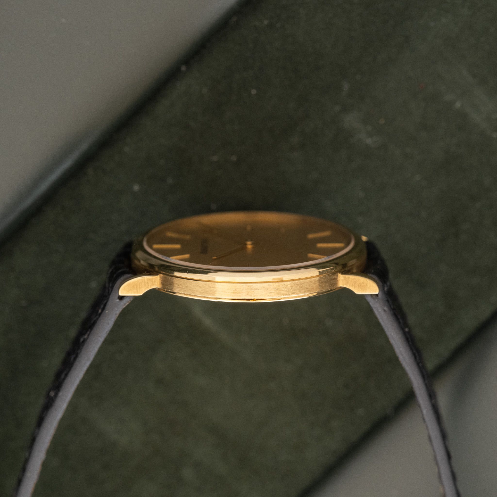 Case: The size is 31mm with an ultra slim profile. The 18k yellow gold case is in unpolished condition.