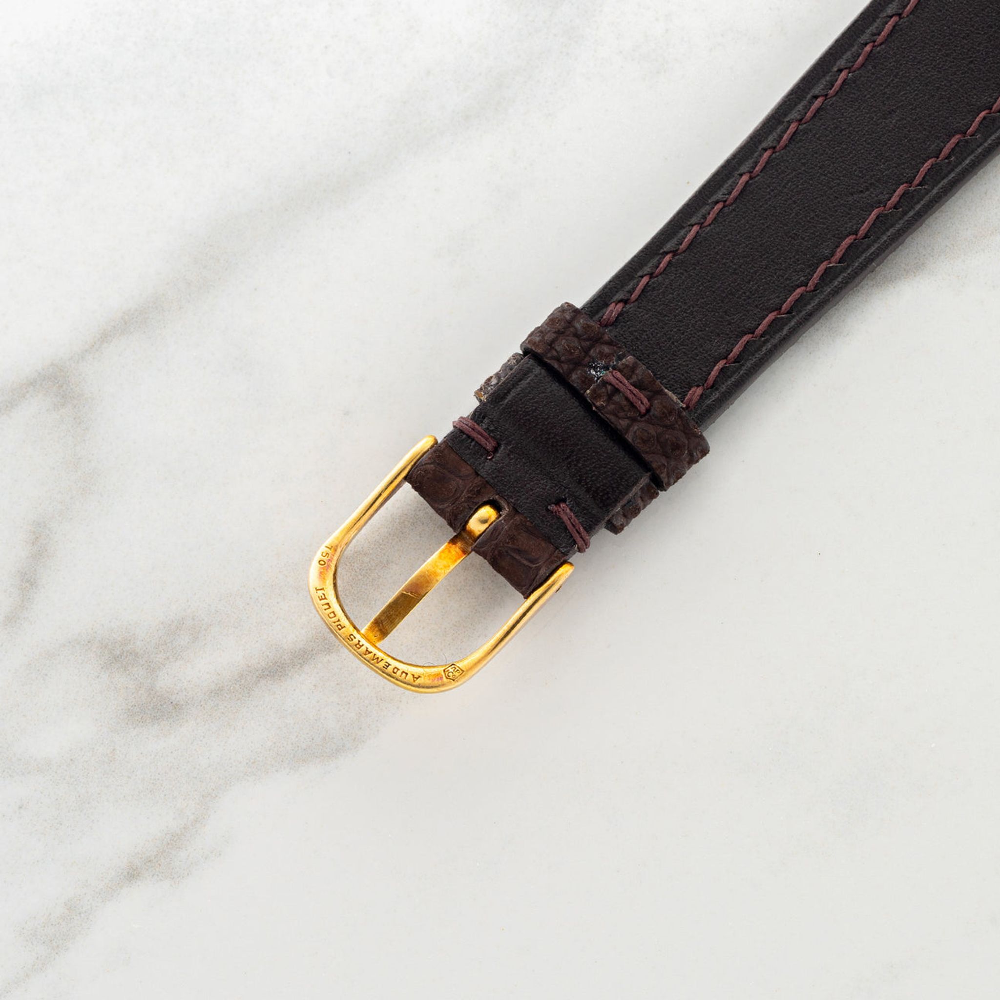 Case: Appears unpolished with crisp markings Light signs of use. Correct unsigned crown. Bracelet: Correct 18k AP signed buckle and brown two piece lizard strap in brown.