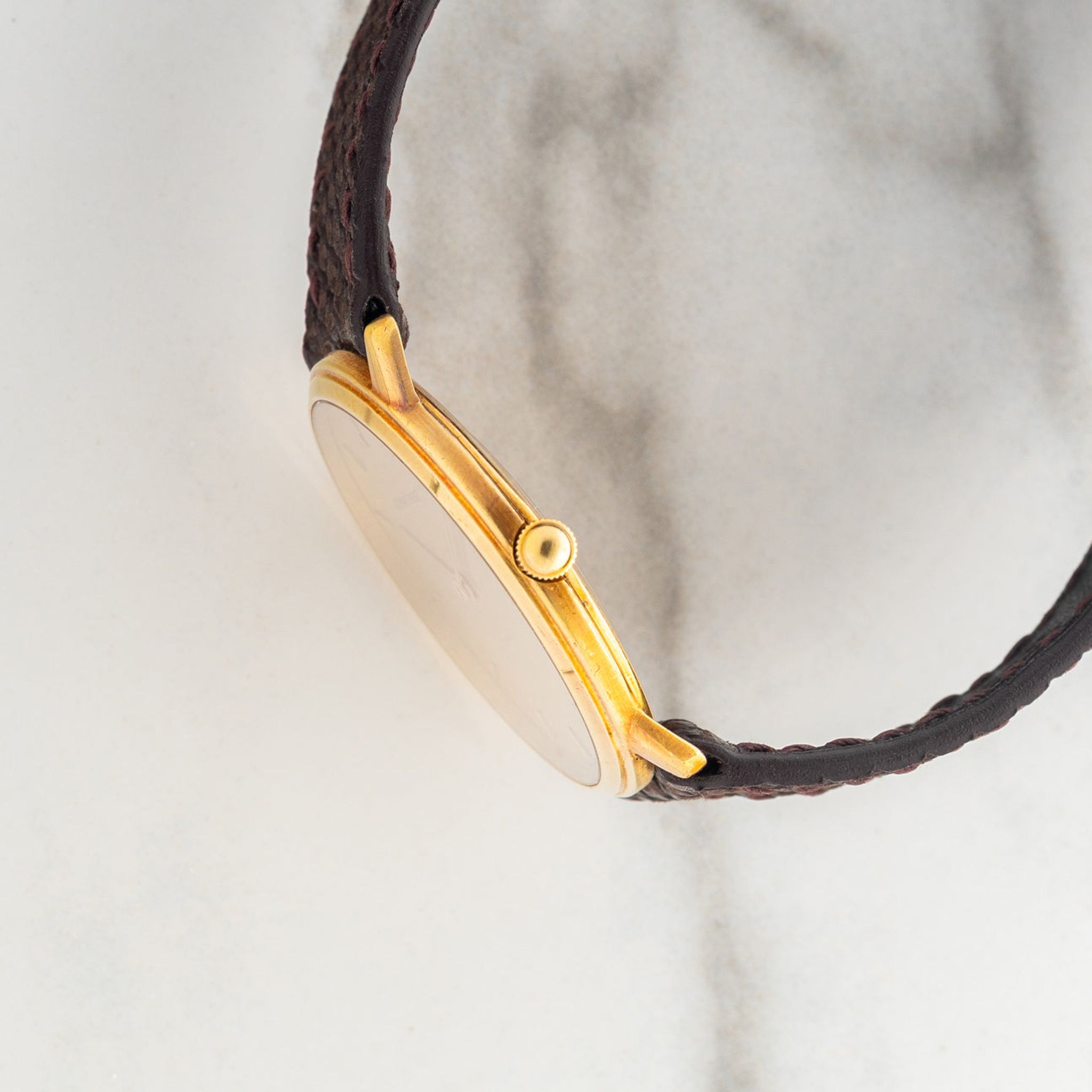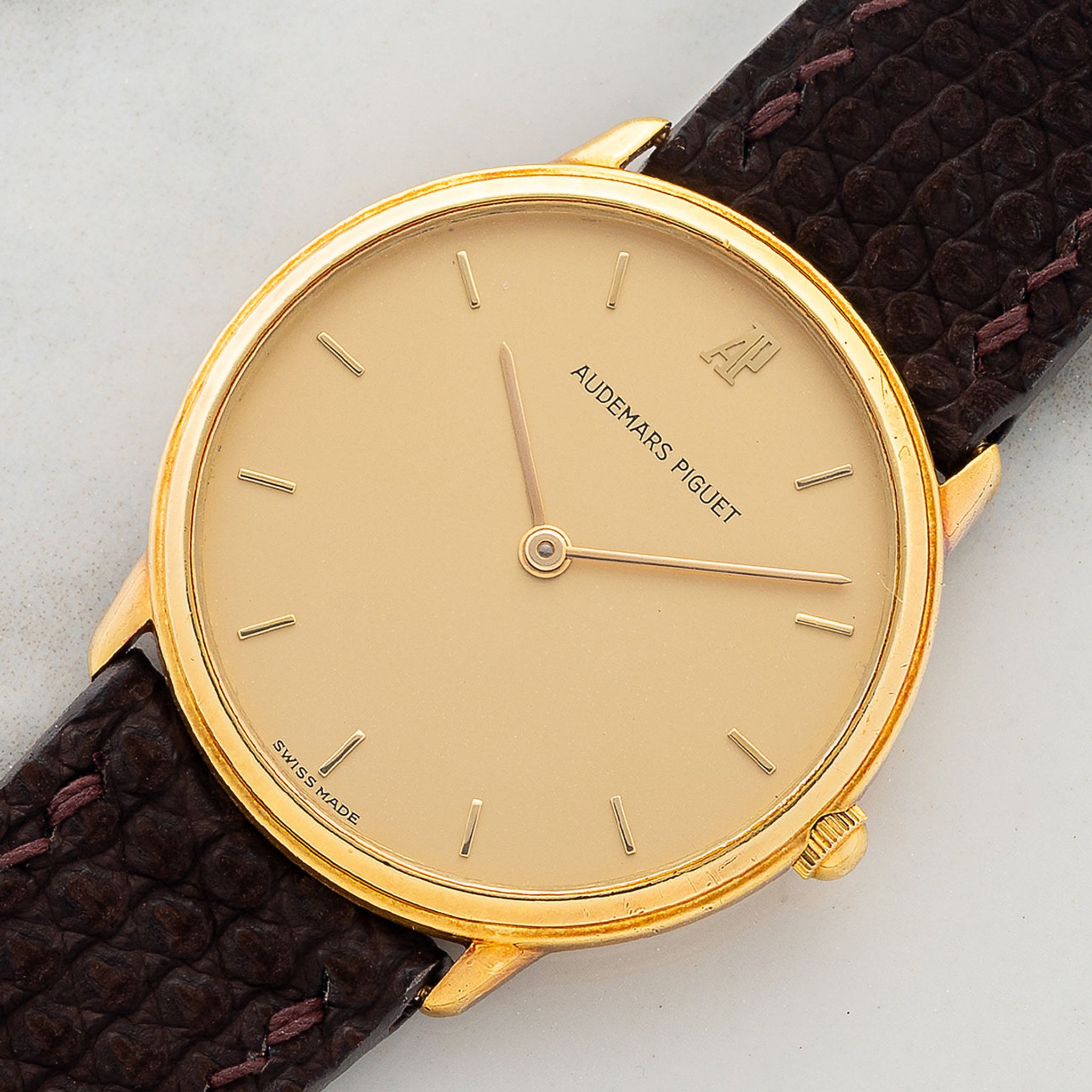 Audemars Piguet are one of the top selling watch brands, mainly due to the Royal Oak. However, there are plenty of other fantastic offerings in their vintage catalog through the decades, especially with regards to their dress watches. AP are known for some of their highly technical and complicated dress pieces as well but these can get wildly expensive and can frankly be difficult to operate and maintain. That brings the affordable AP category and their Ultra Slim or "cocktail watch." This example is 18k yellow gold and at 31mm is the perfect size for medium to smaller wrists. It has remained in fantastic vintage condition with a mint dial and unpolished case. This one even retains its correct 18k AP pin buckle and is ready to enjoy for years to come.