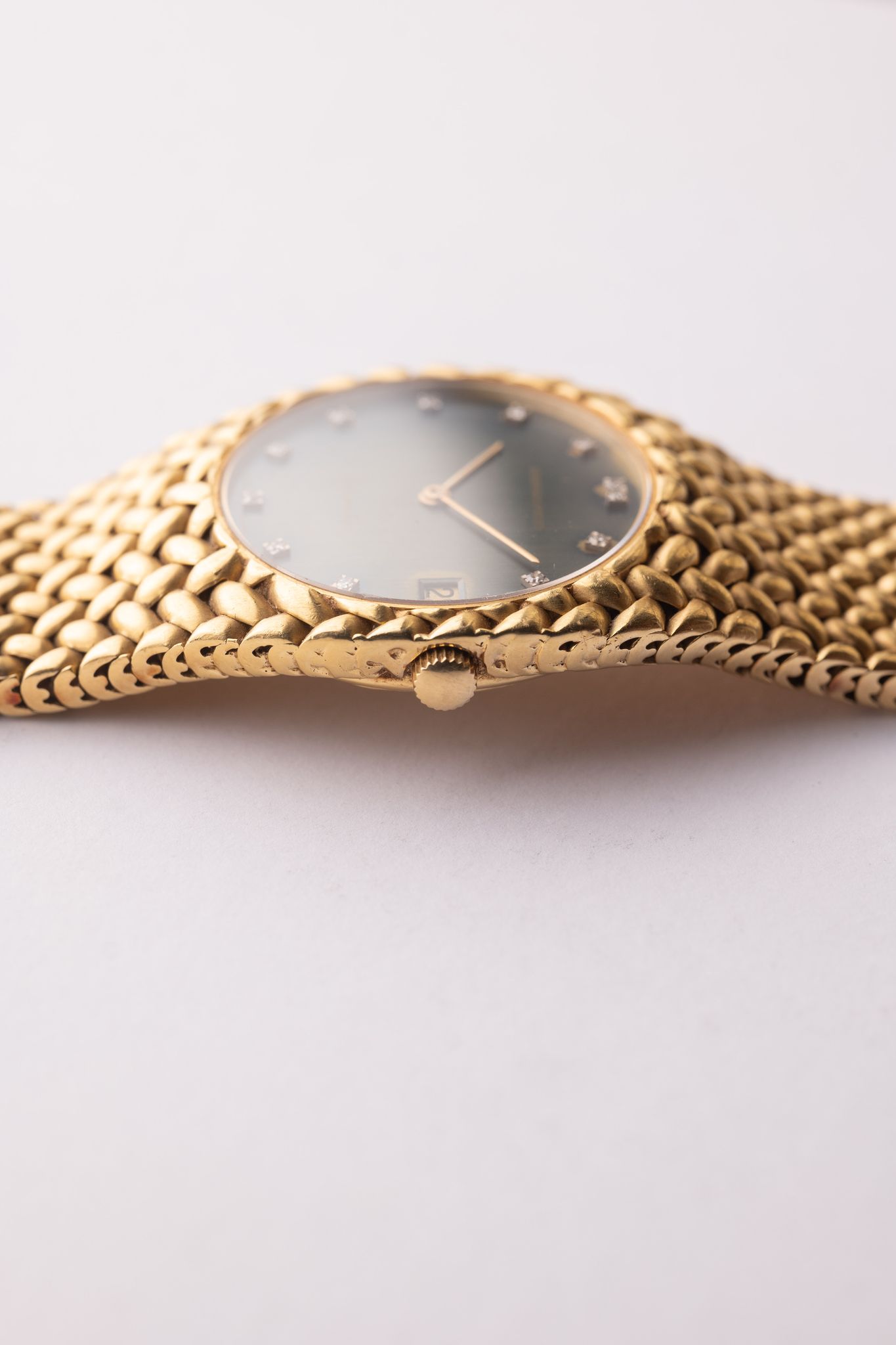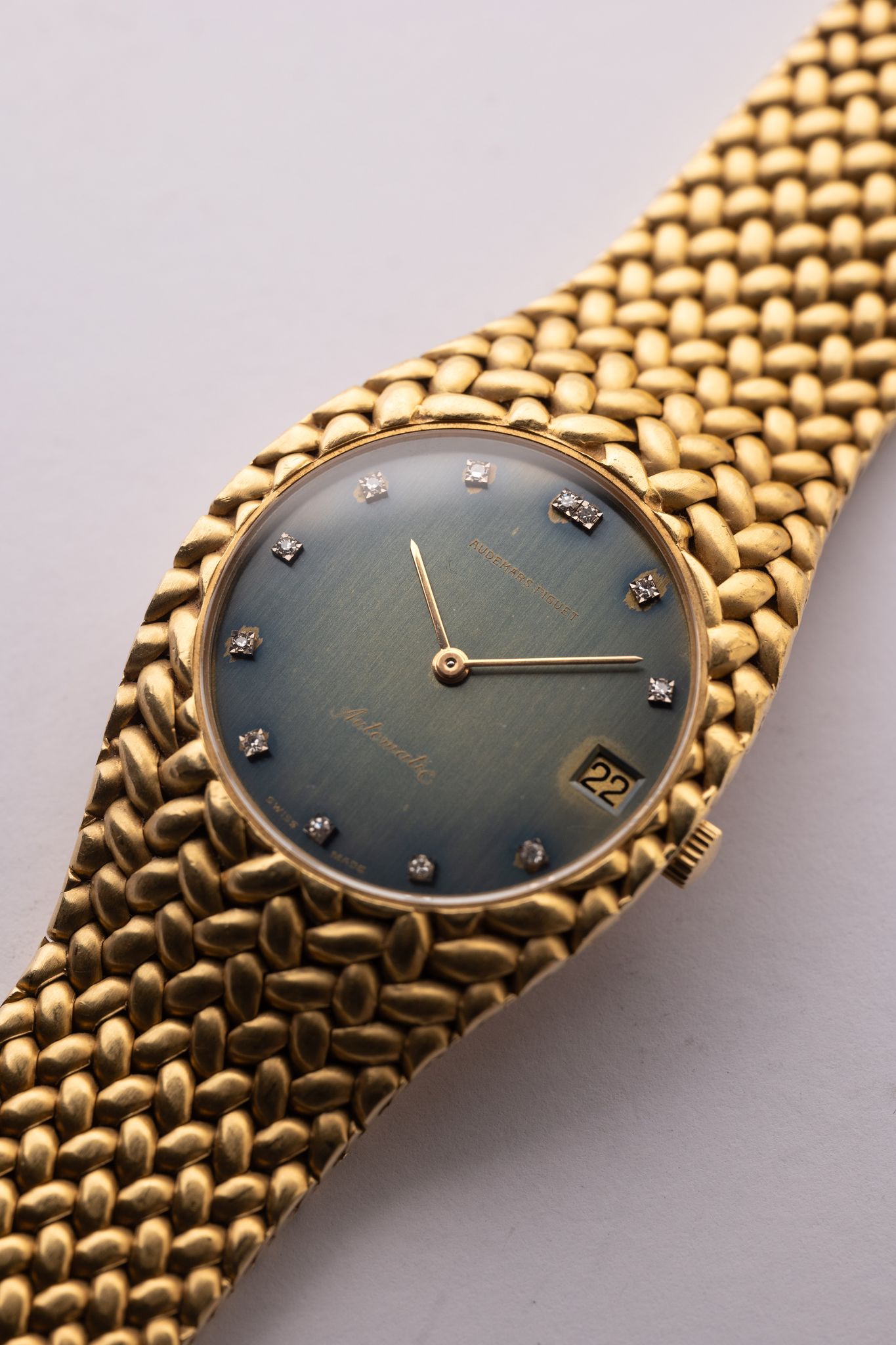Description: The Audemars Piguet Cobra reference 5403BC is a refined and elegant time-and-date wristwatch from the 1970s. Crafted entirely from 18K white gold, it features a 34mm case seamlessly integrated into a striking braided bracelet, which gives the watch its “Cobra” nickname due to its resemblance to a snake’s scales. The black dial is adorned with diamond hour markers and has turned a tropical blueish slate over the years. Powering the movement is a self-winding caliber 2121, providing a 40-hour power reserve. We feel there is a resurgence of these elegant crafted dress/jewelry pieces and the AP Cobra’s capture everything we love from this ornate period of watchmaking.
