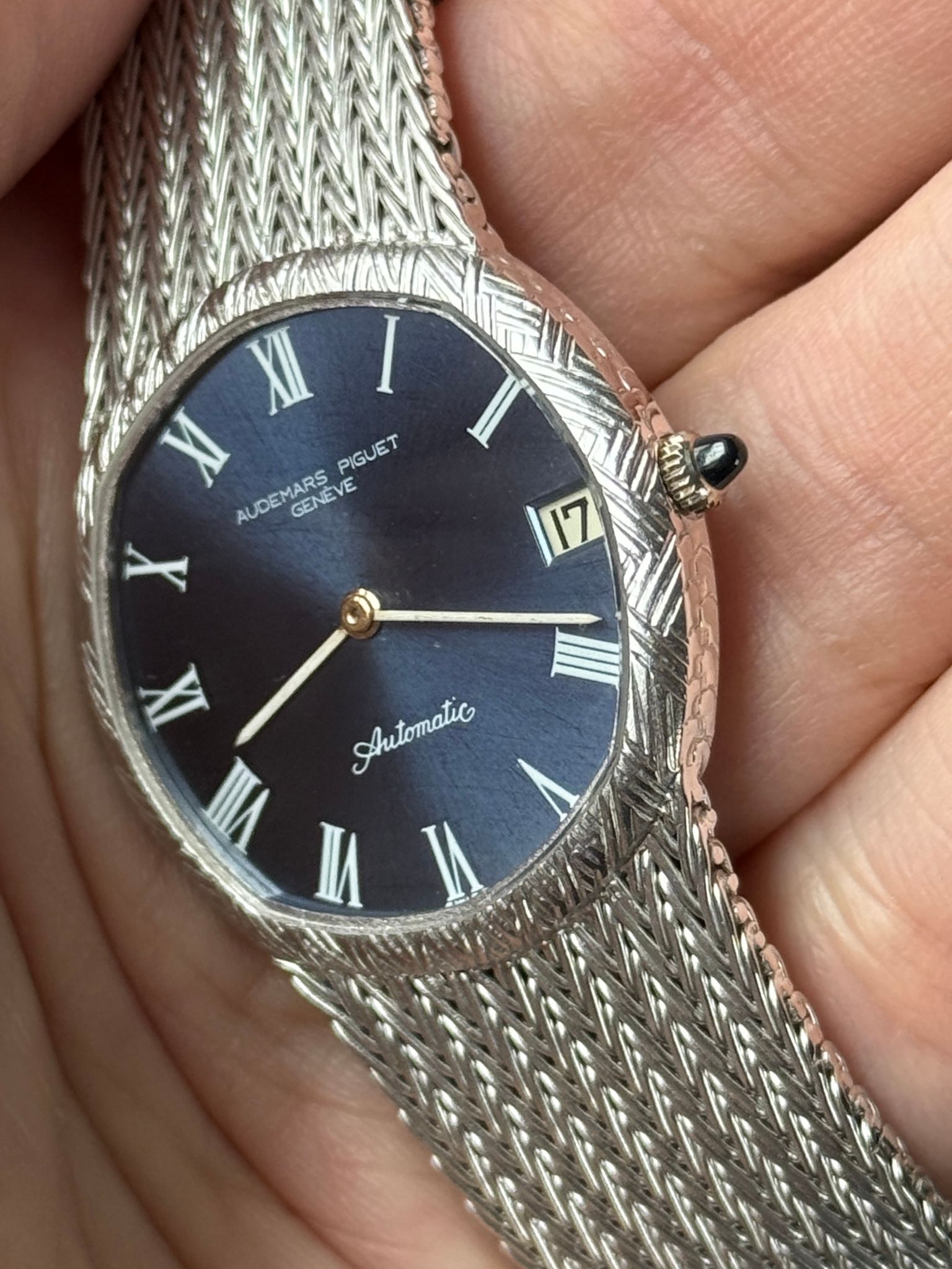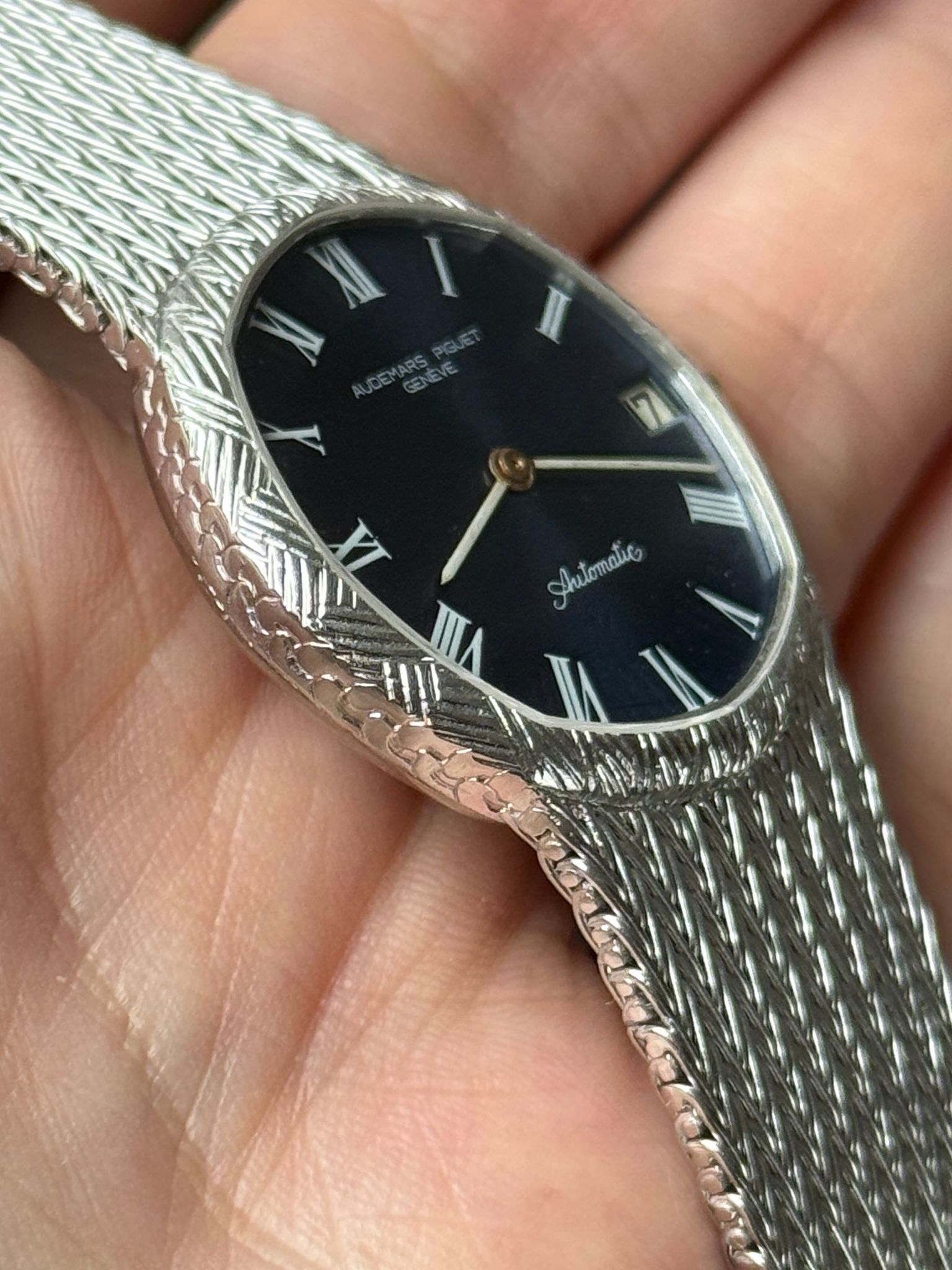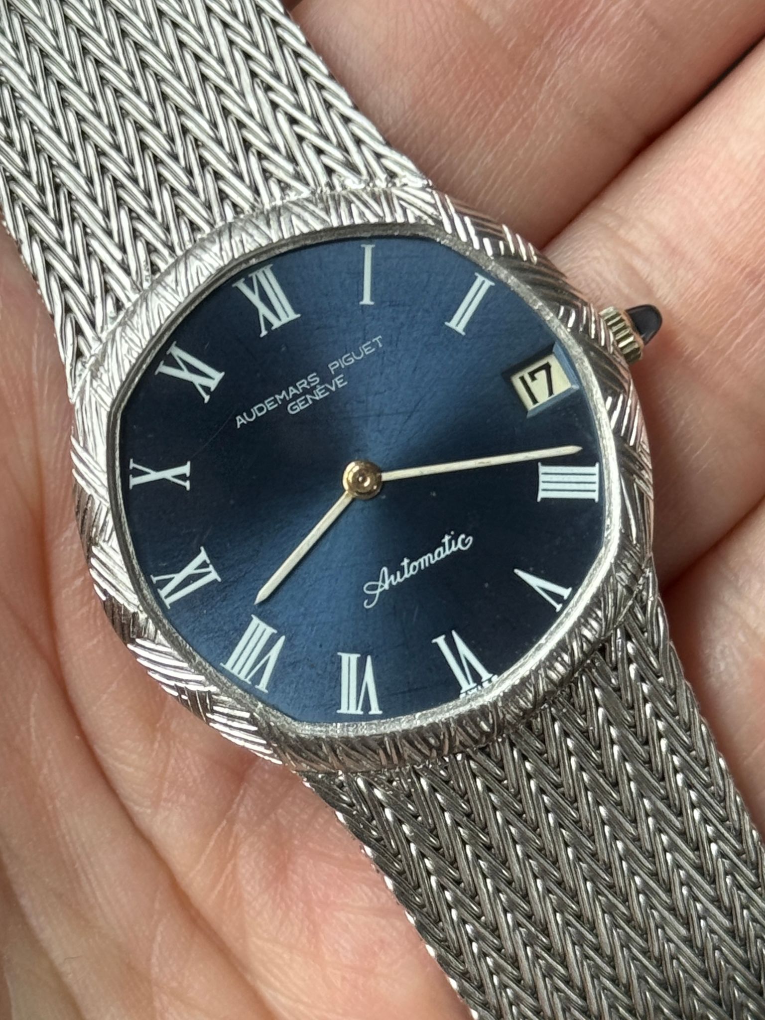 Vintage Audemars Piguet reference 5388 automatic in 18k white gold with a beautiful blue roman numeral dial from the 1980s. Quickset date function at 3 a clock. It's on its original matching integrated 18k white gold bracelet which fits at least 7 inches with micro adjuster. Bracelet is fully integrated with a woven finish through the case. Unusual to find this in an automatic version.