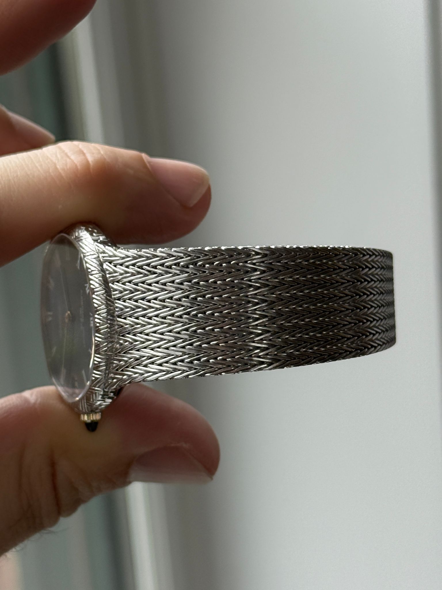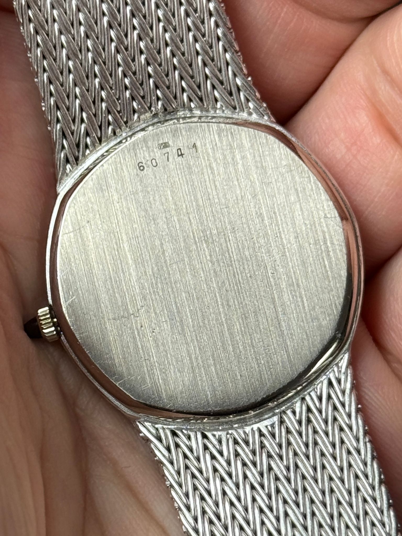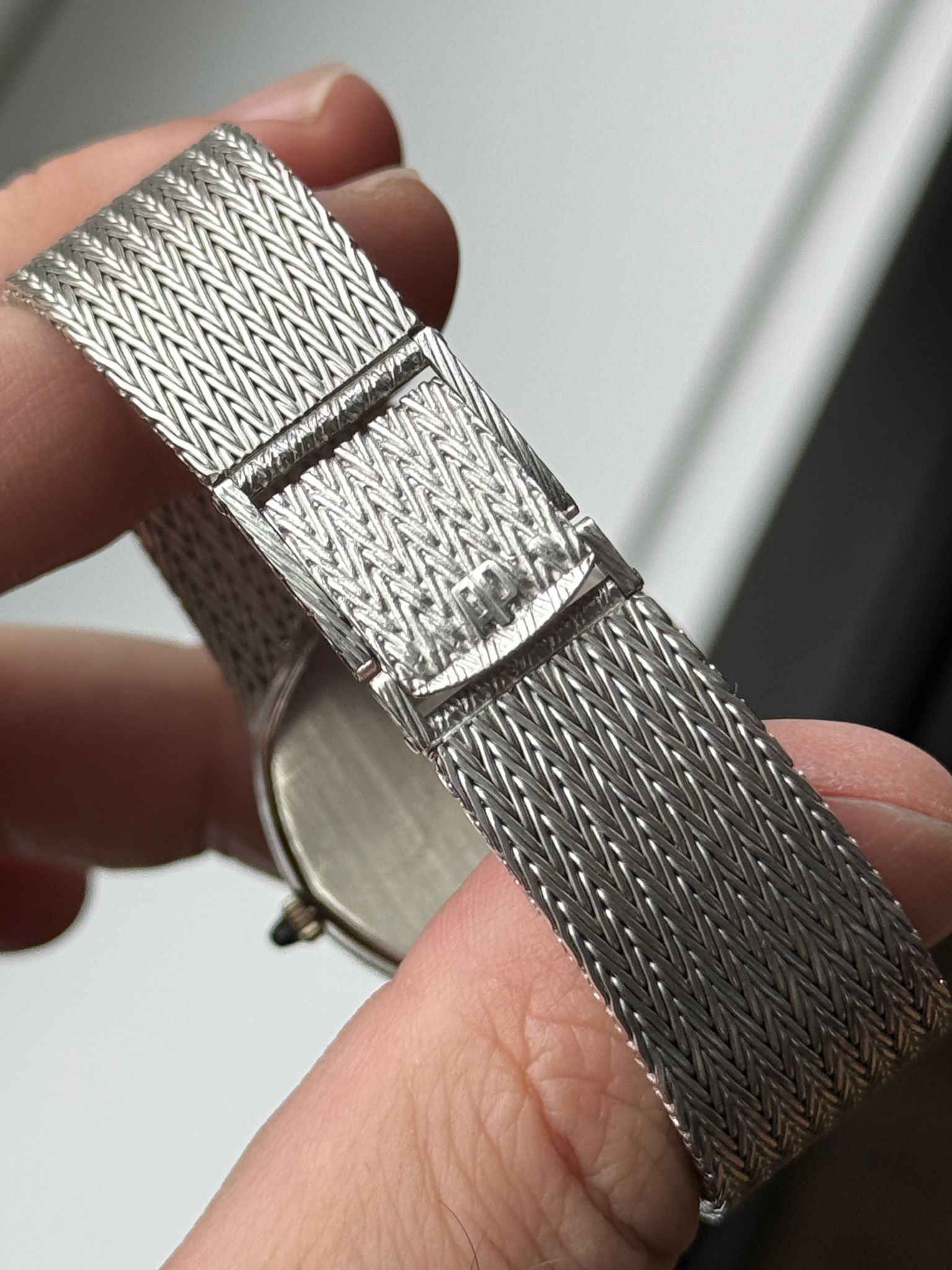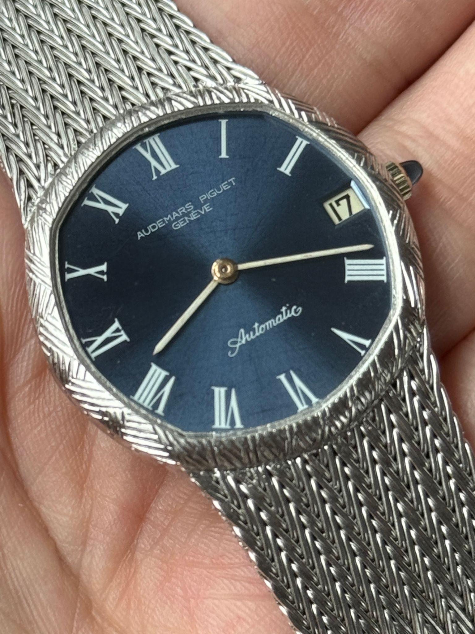 Vintage Audemars Piguet reference 5388 automatic in 18k white gold with a beautiful blue roman numeral dial from the 1980s. Quickset date function at 3 a clock. It's on its original matching integrated 18k white gold bracelet which fits at least 7 inches with micro adjuster. Bracelet is fully integrated with a woven finish through the case. Unusual to find this in an automatic version.