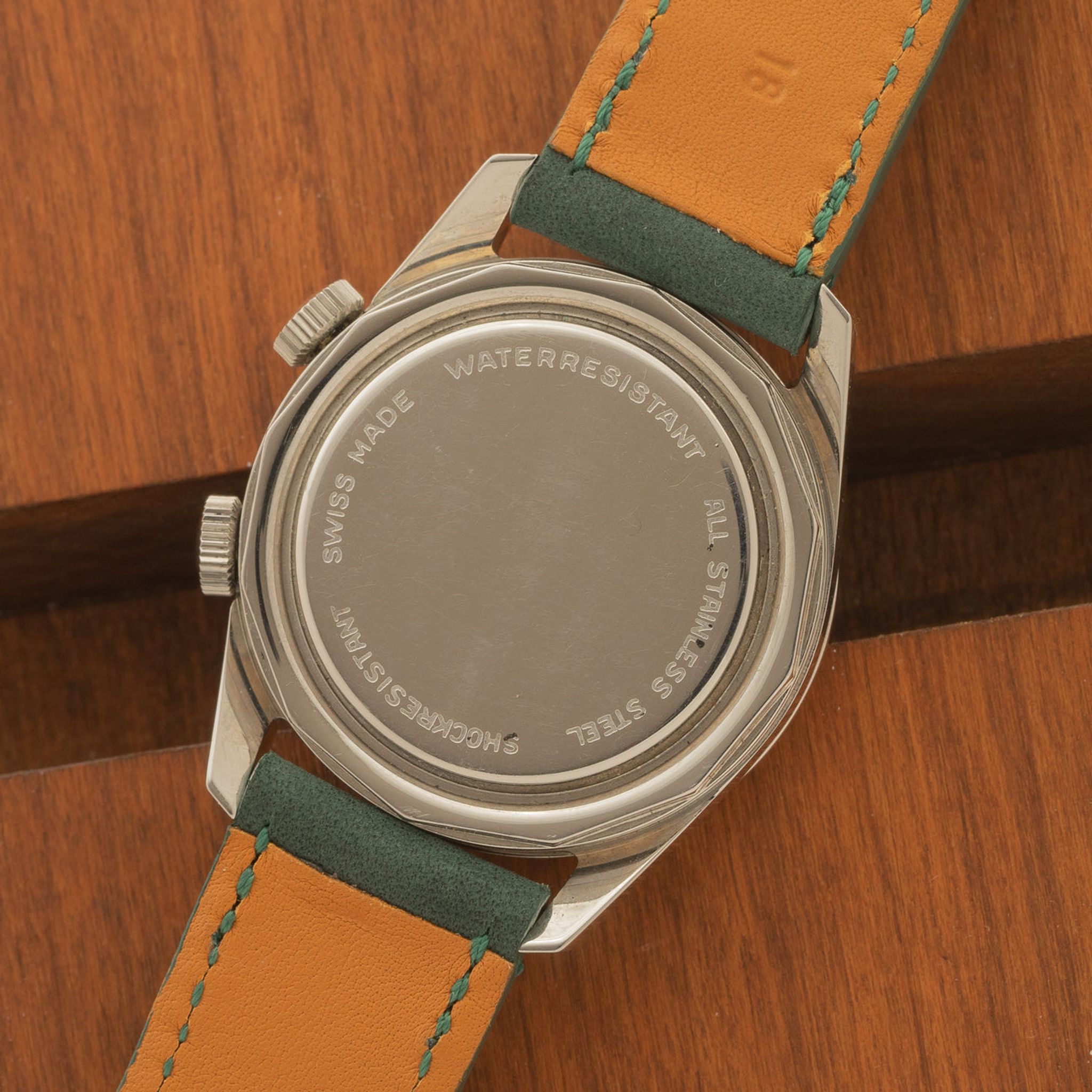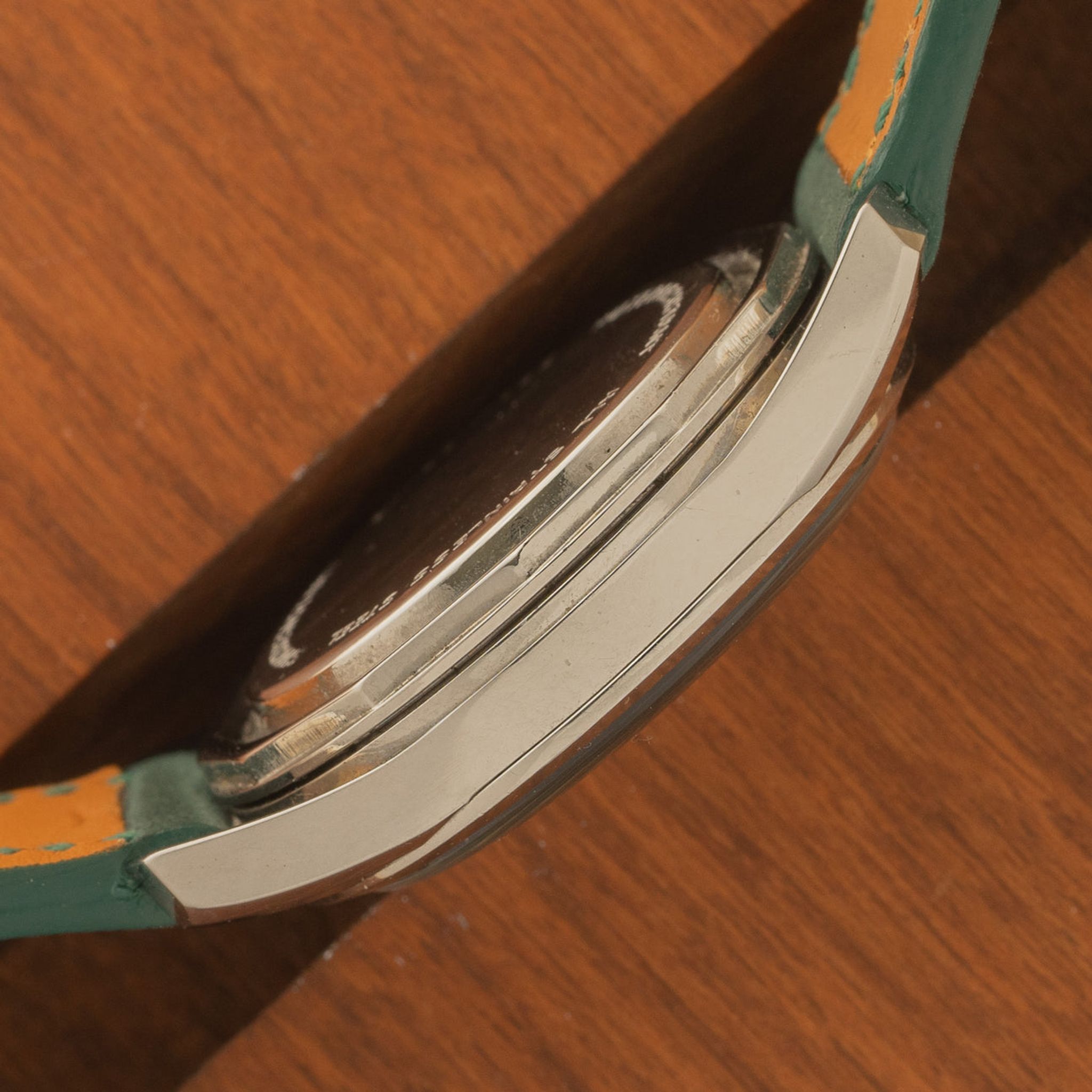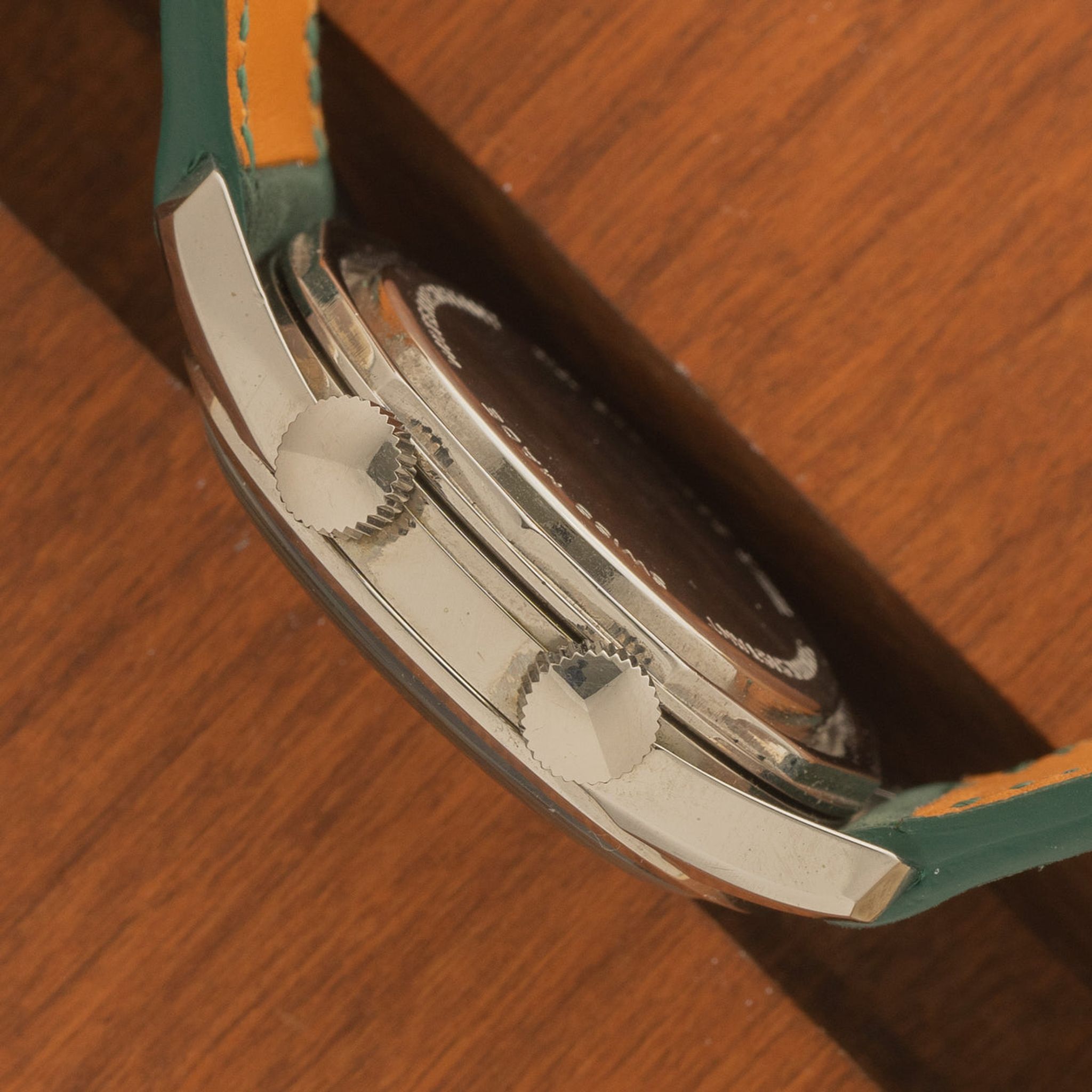 Case: Very little use and looks unpolished. Unsigned crowns are matching and appear correct. Bracelet: Two piece handmade leather strap in green.