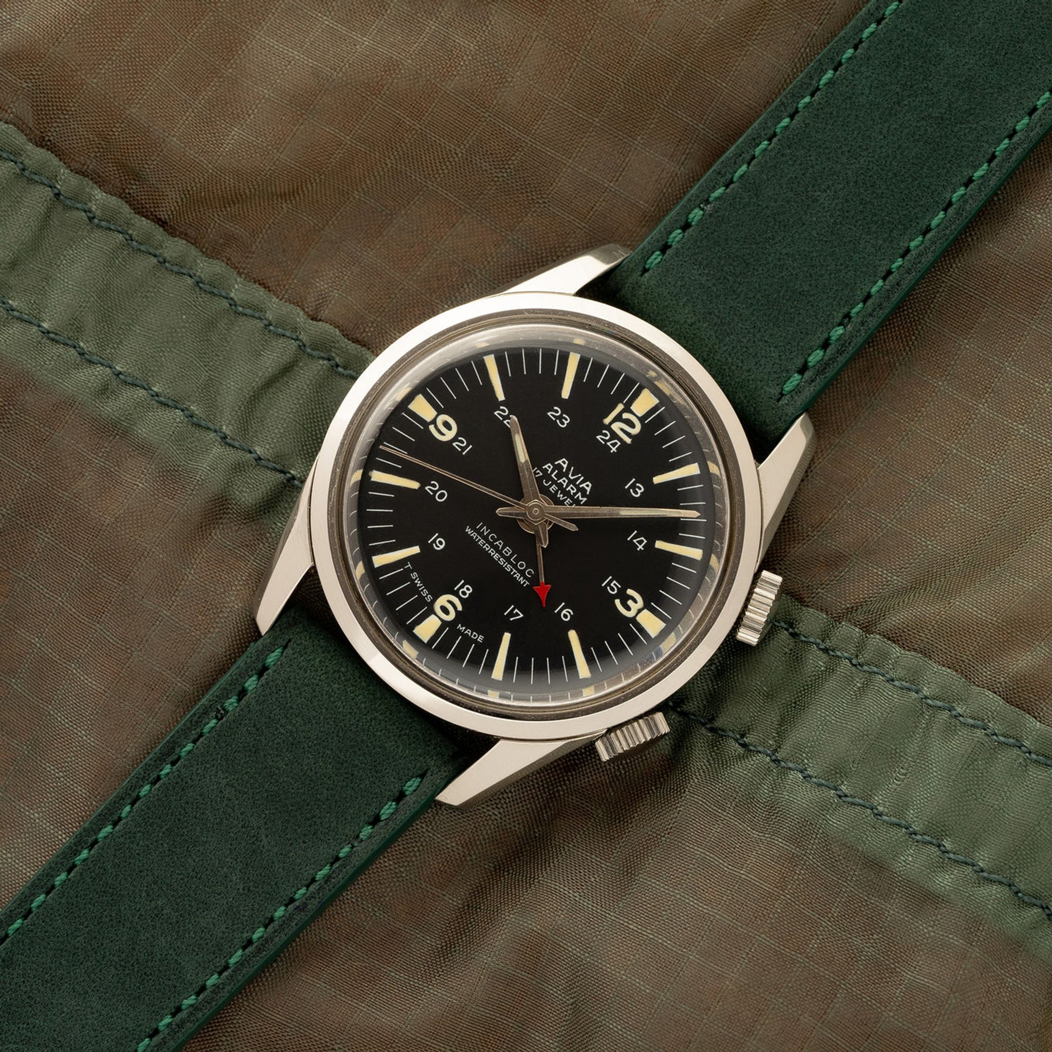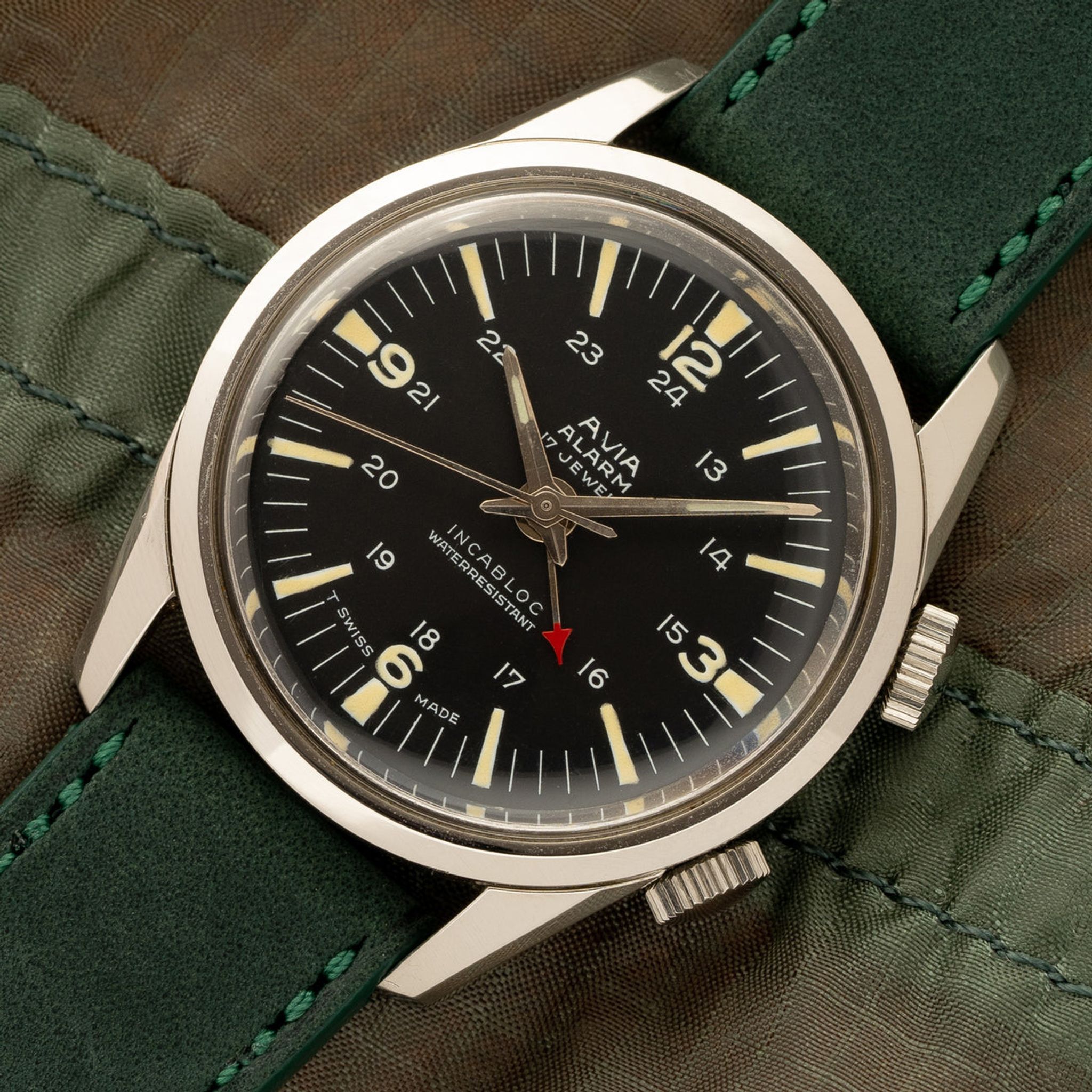 We love finding interesting alarm watches as the complication is not only a fun conversation starter but also practical. For the collector who appreciates the off the beaten path and unique finds, this Avia piece is something we're unlikely to see again, let alone in the wild on someone's wrist. The curved lugs and dual crowns make the 33mm case feel more substantial on wrist. This piece remains in wonderful "like new old stock" and unpolished condition, boasting beautiful patina on the dial/hands and is ready to enjoy for many years to come!