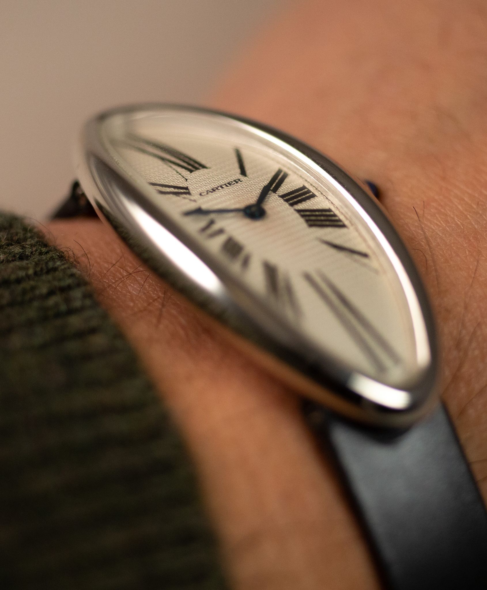 This is an incredible Cartier Baignoire Allongee! This example is a reference 2514 and is the rarer mechanical version. It has a stunning white gold case with perfect proportions. It also has a Cartier strap and white gold Cartier buckle.