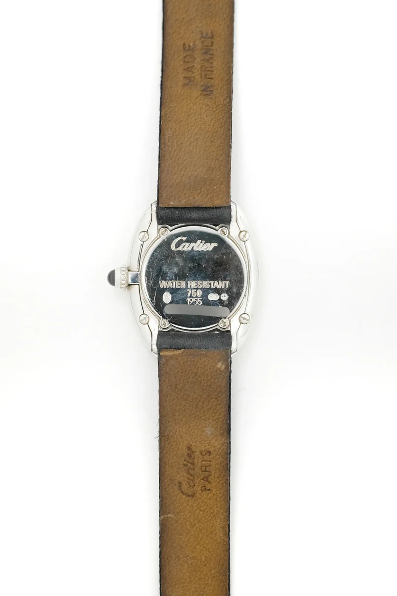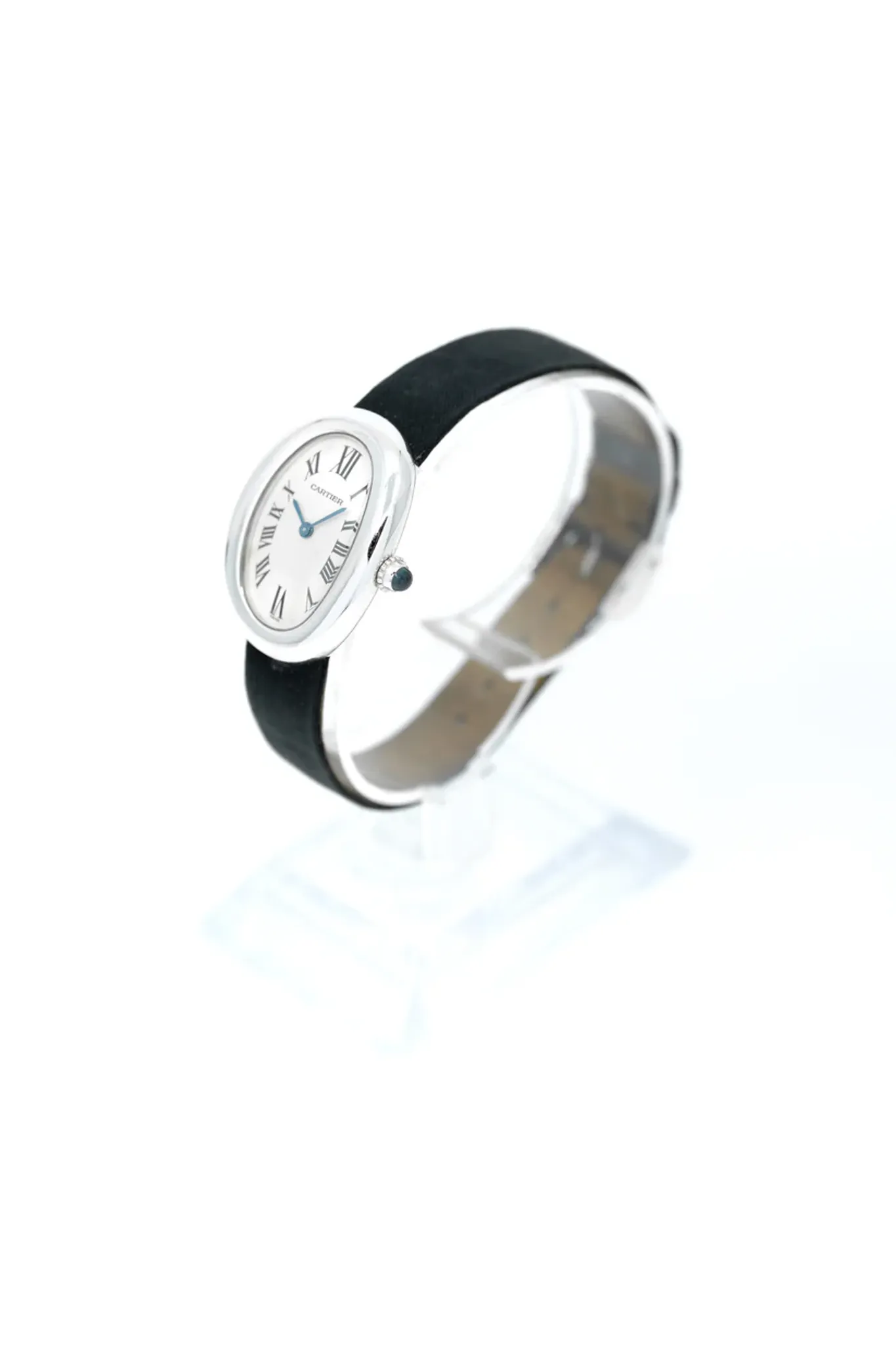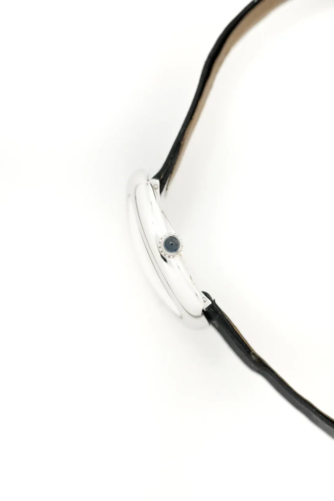 18-carat white gold case and pin buckle. Cartier satin-finish black leather strap.