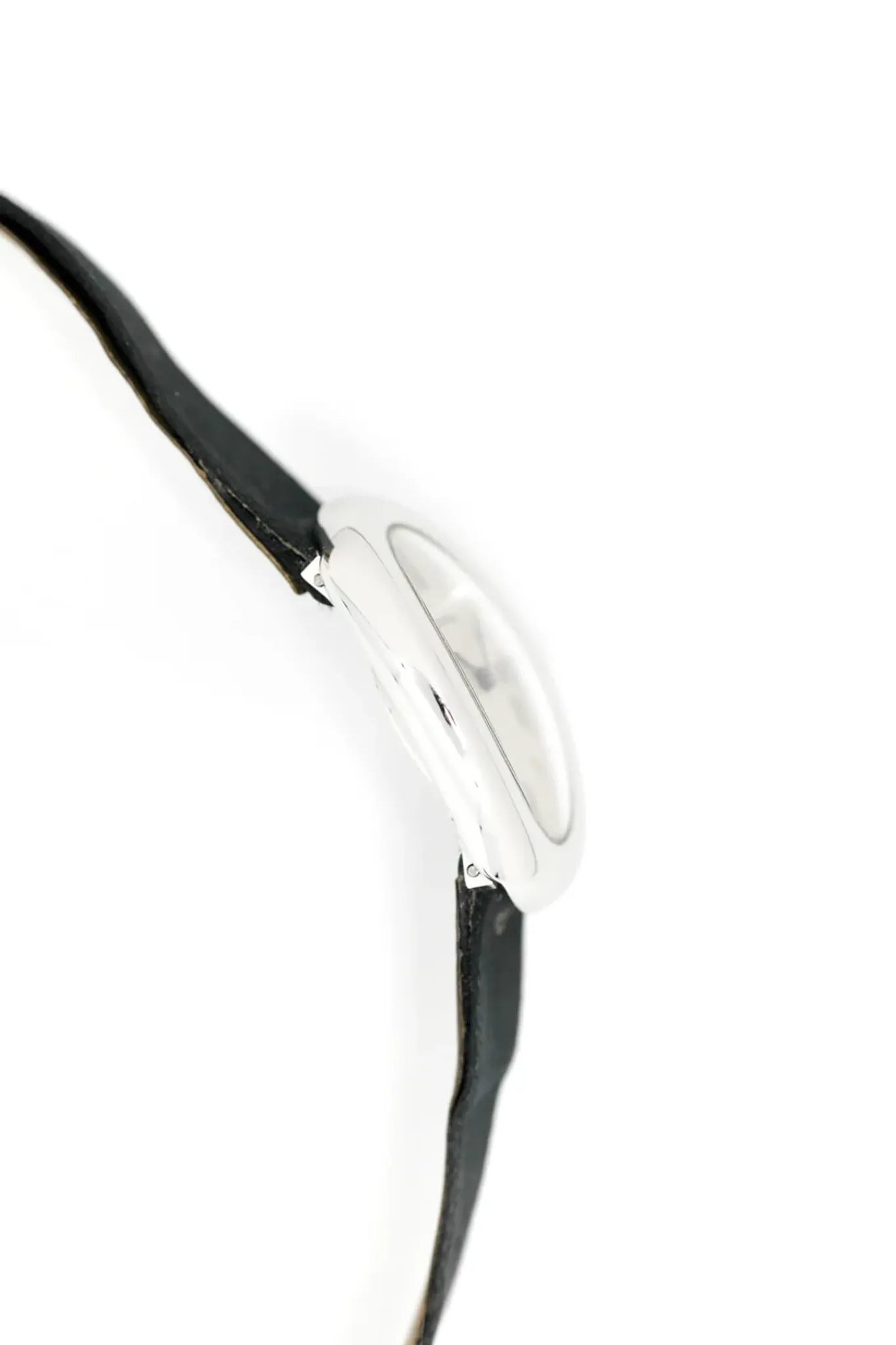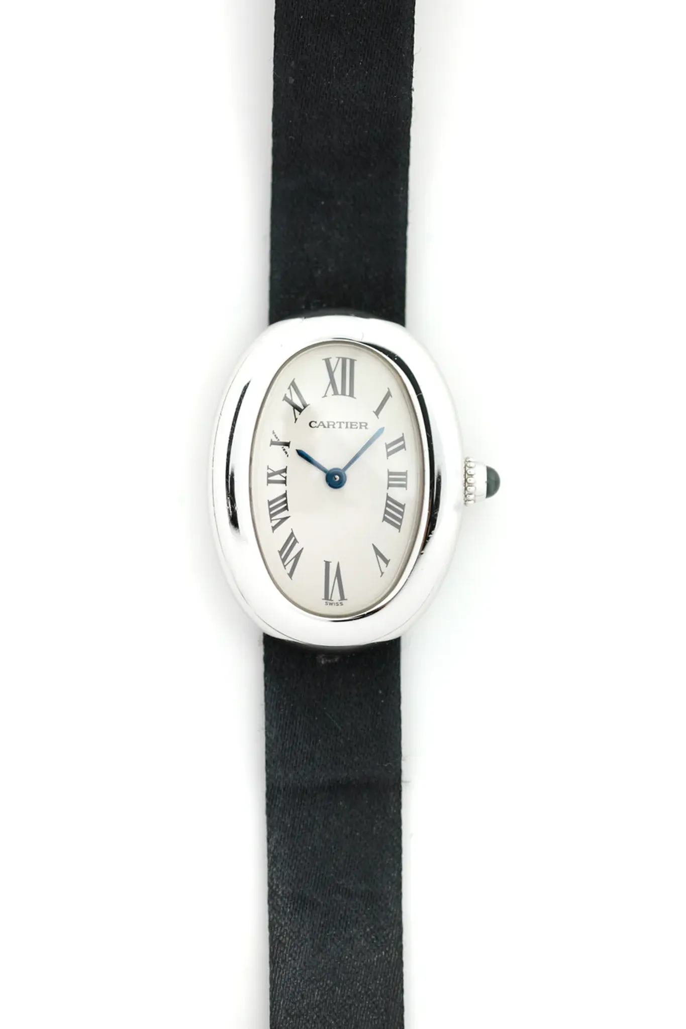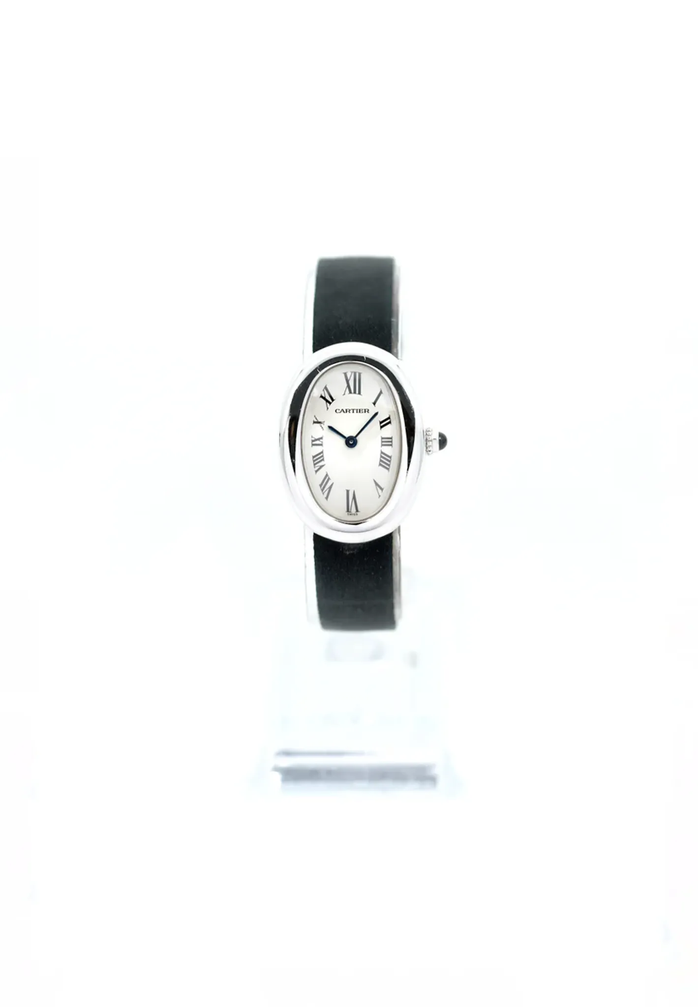 18-carat white gold case and pin buckle. Cartier satin-finish black leather strap.