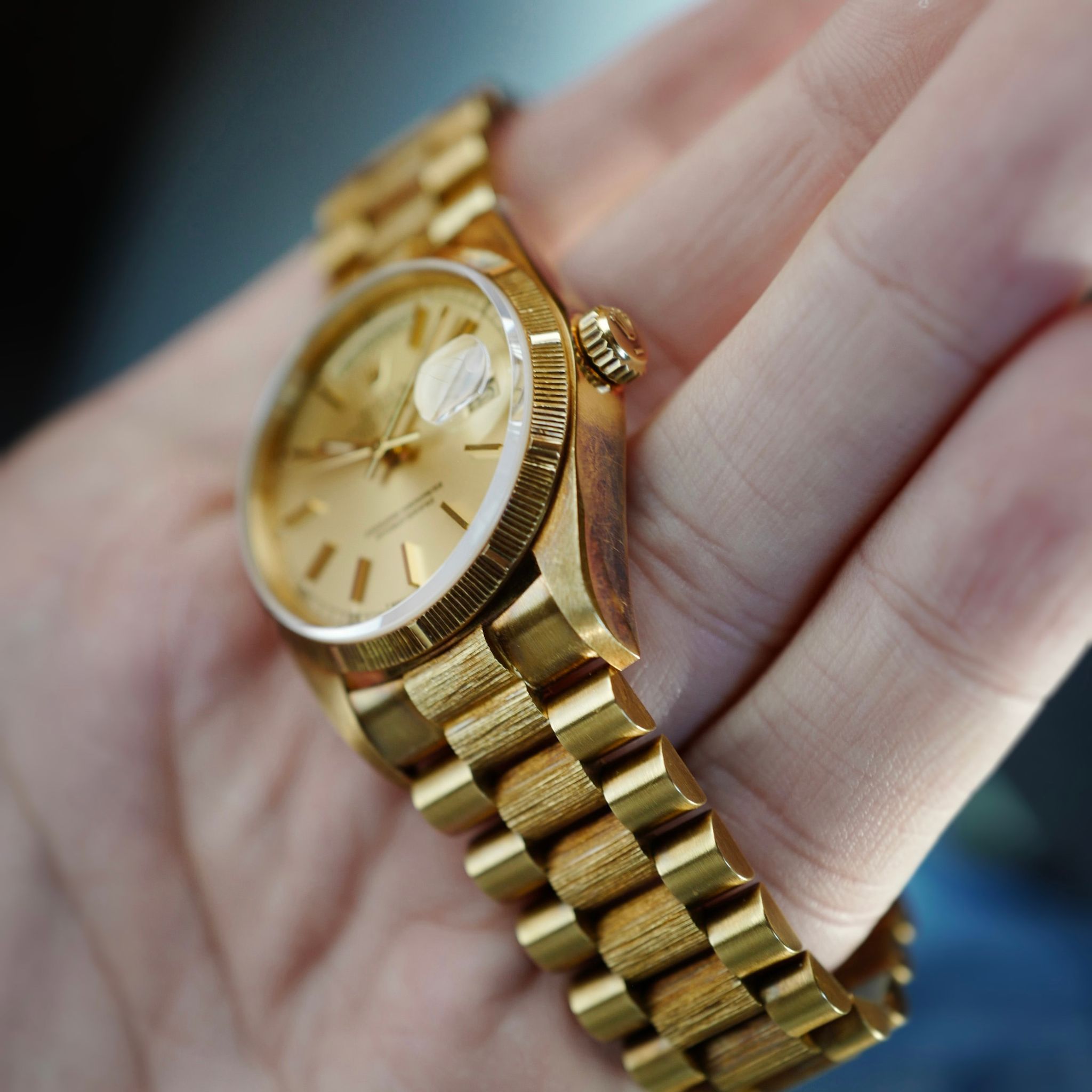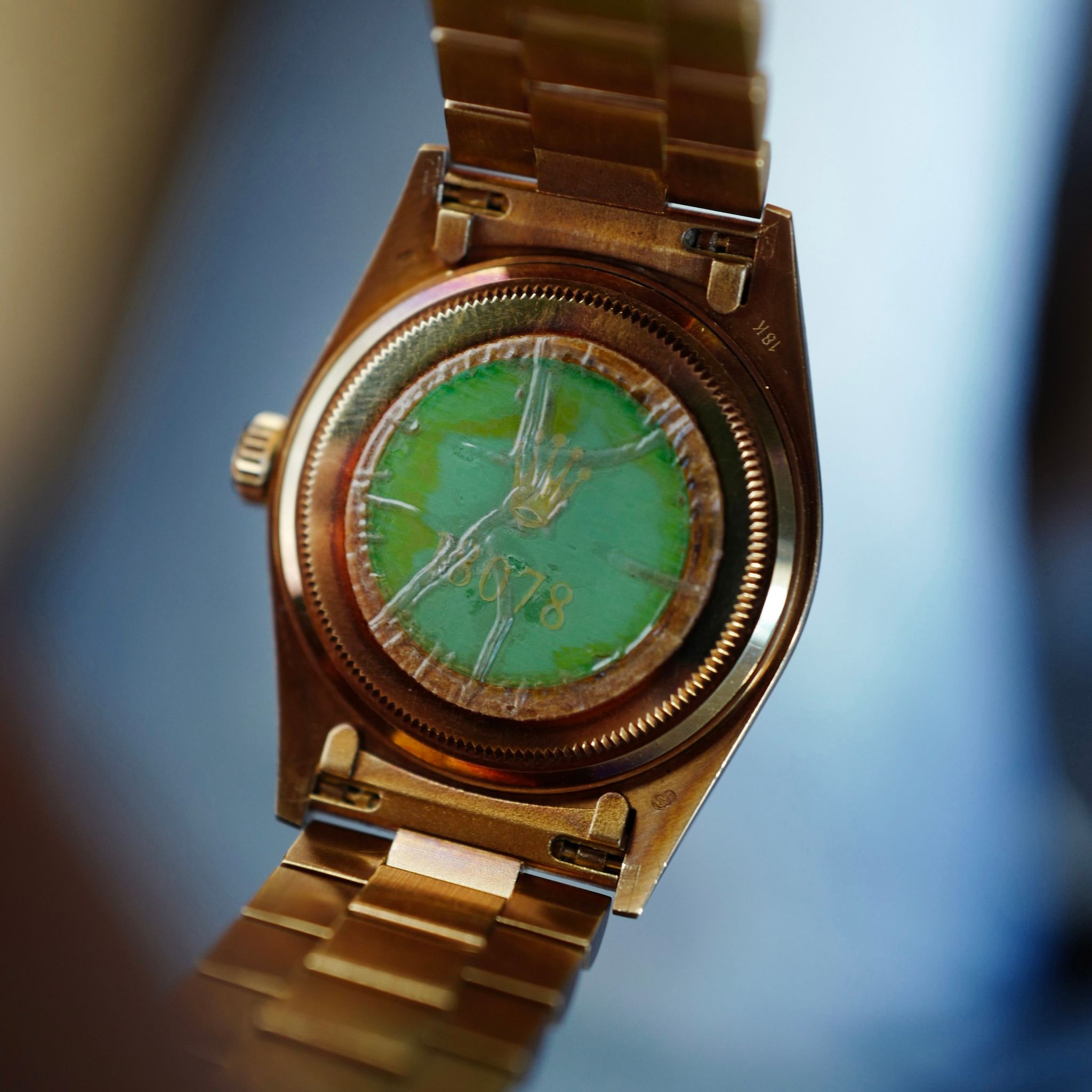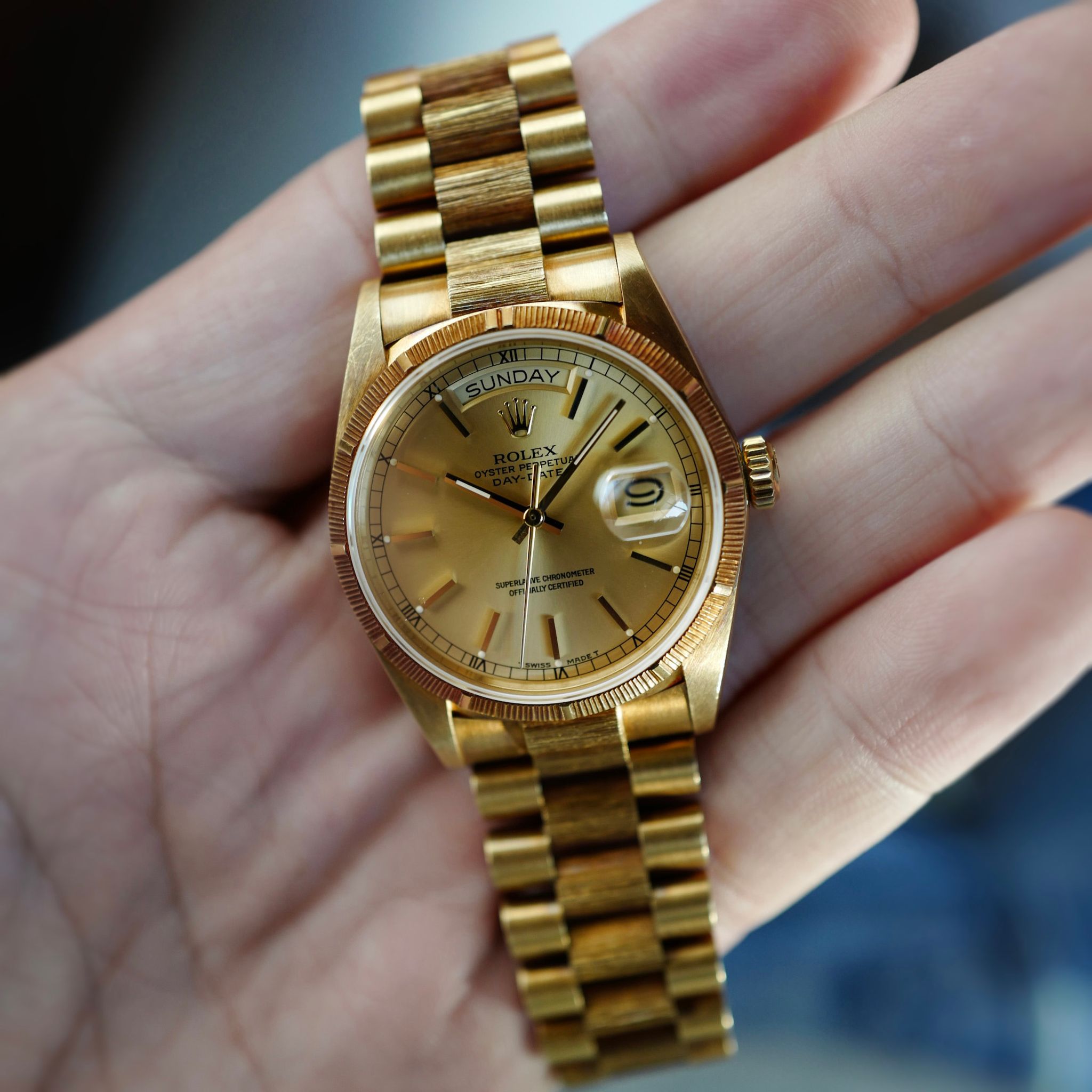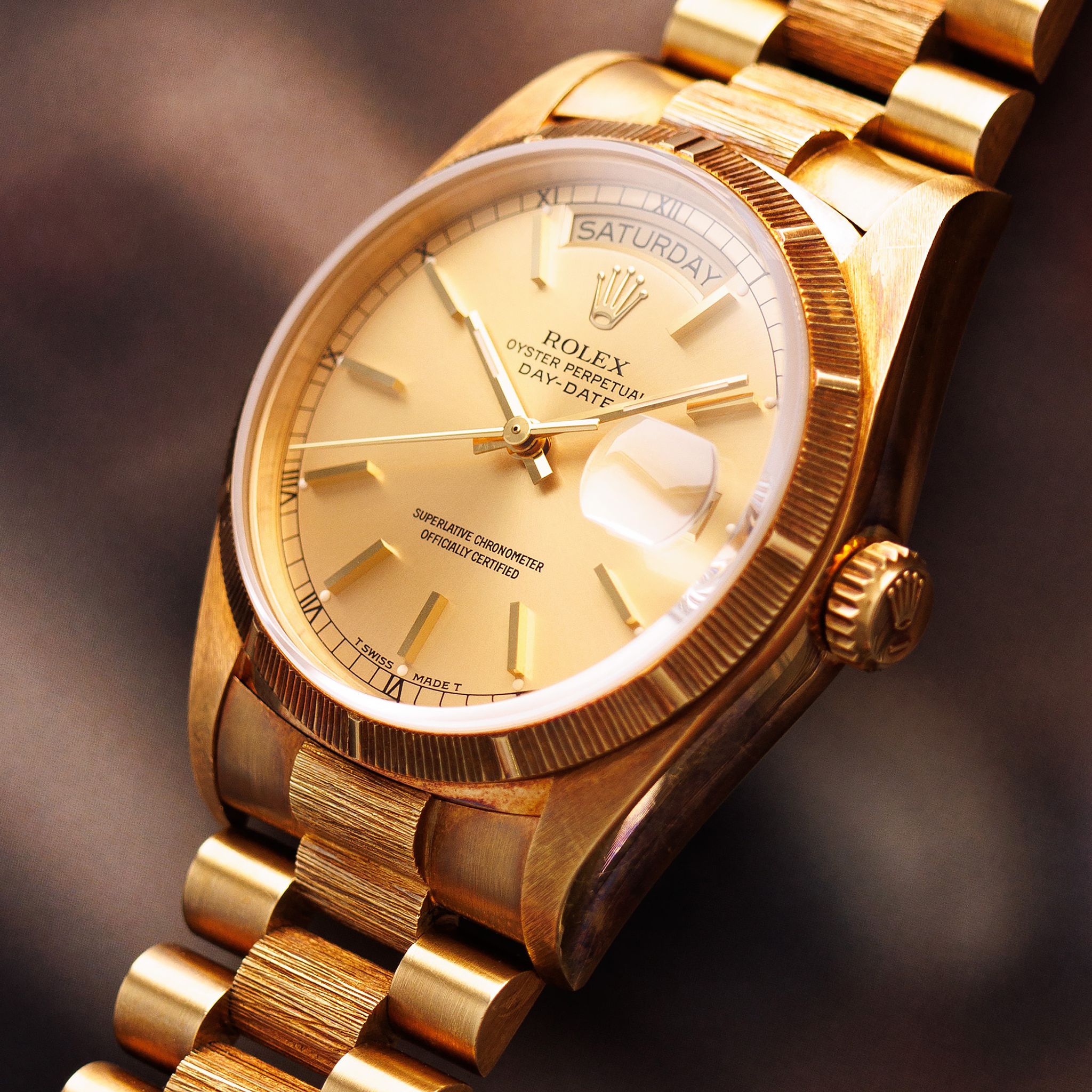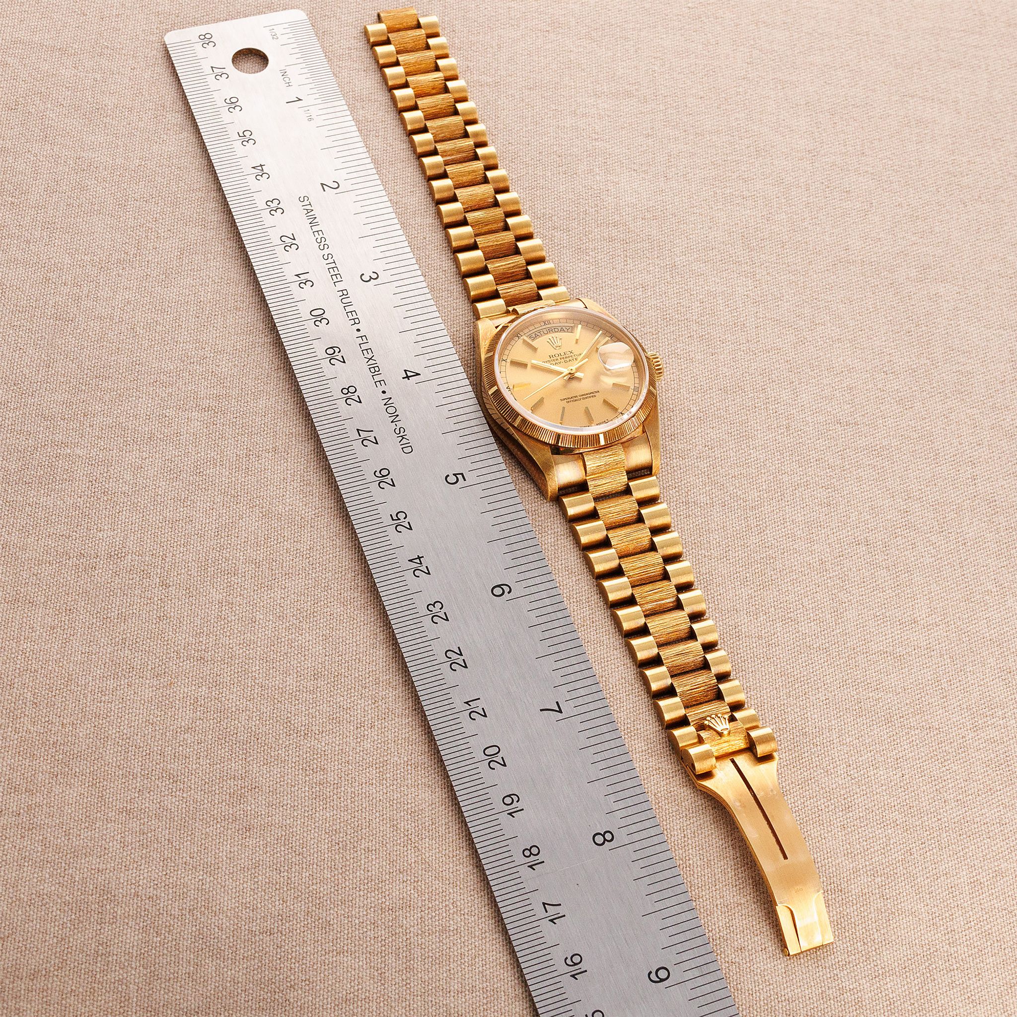 This outstanding, original condition Rolex Day-Date 18078 features a rich, warm tarnish on the gold, a tight bracelet and original caseback sticker. If you are in the market for a Bark Day-Date, it will be very hard to beat this condition.
