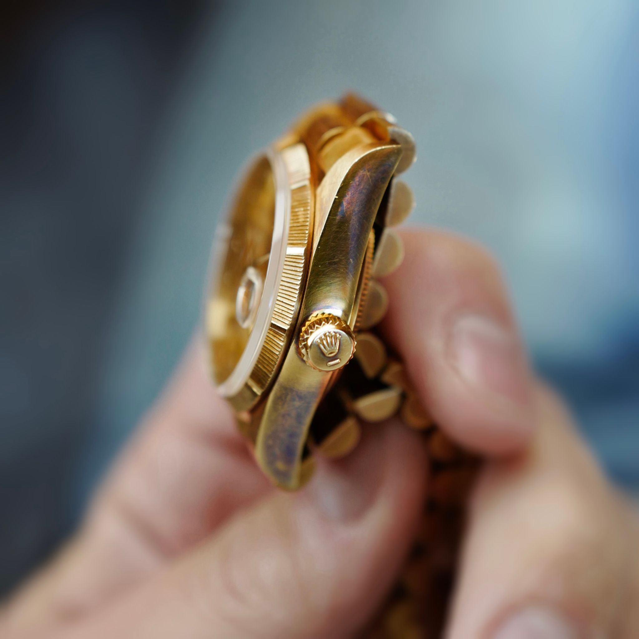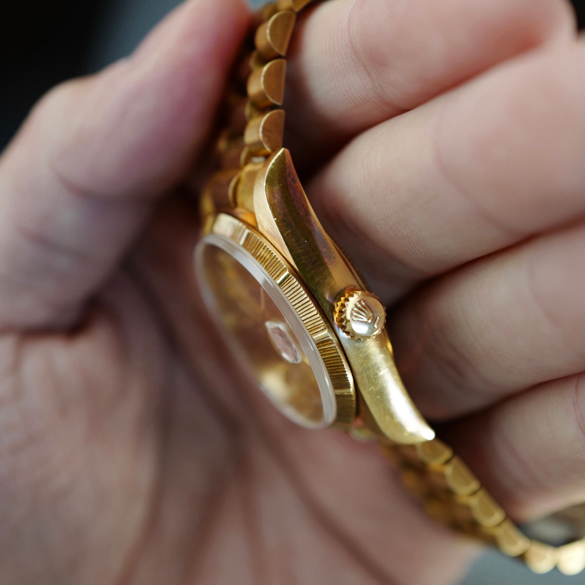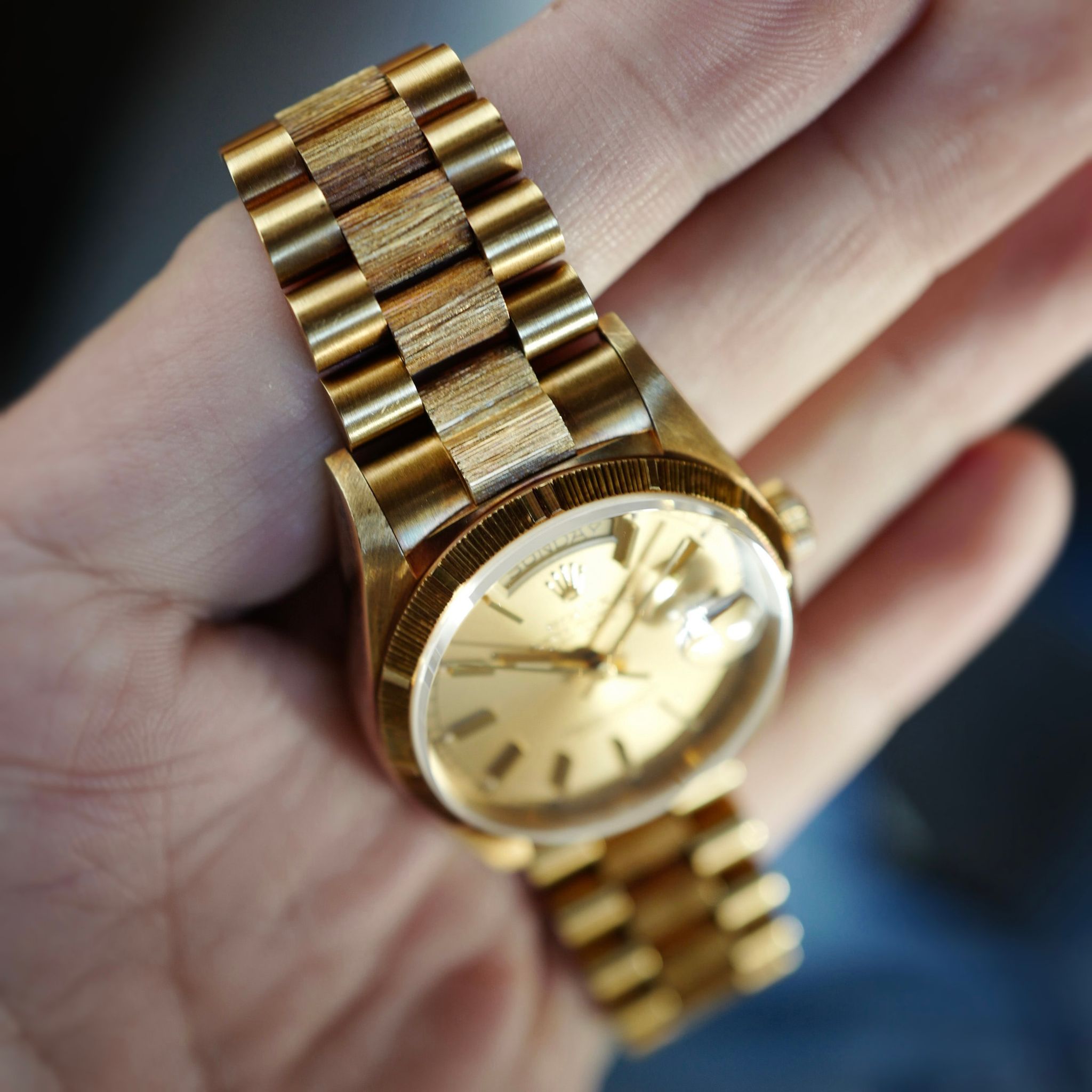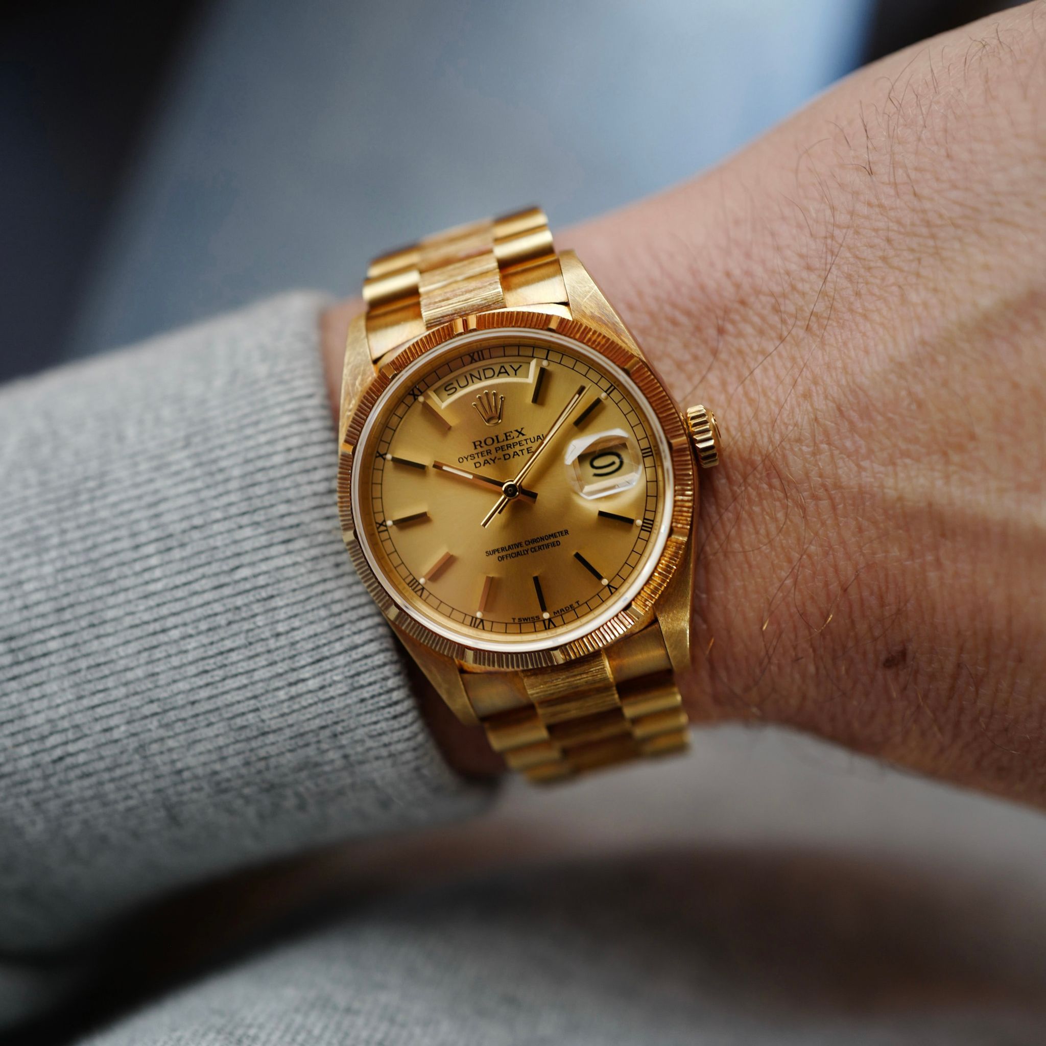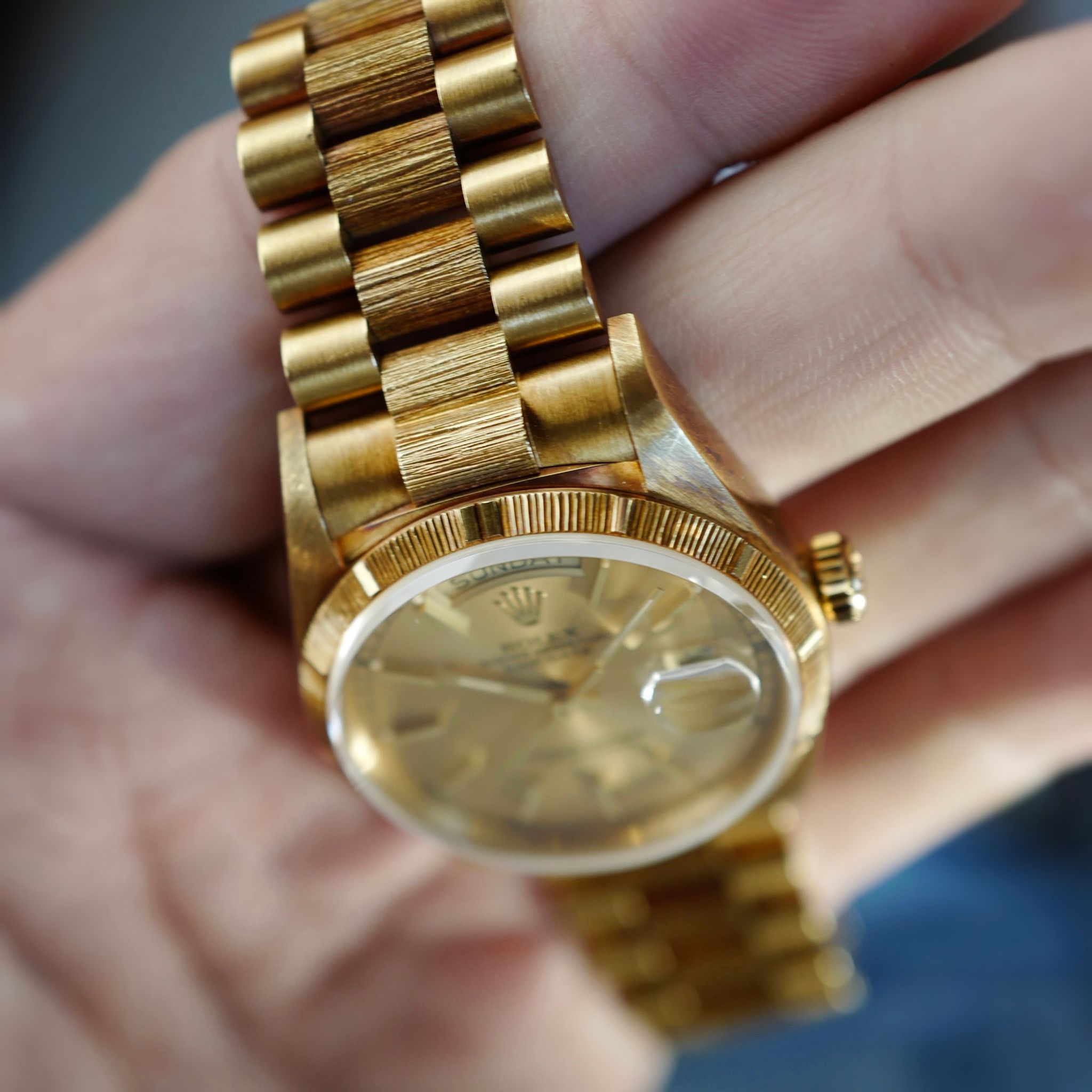 This outstanding, original condition Rolex Day-Date 18078 features a rich, warm tarnish on the gold, a tight bracelet and original caseback sticker. If you are in the market for a Bark Day-Date, it will be very hard to beat this condition.