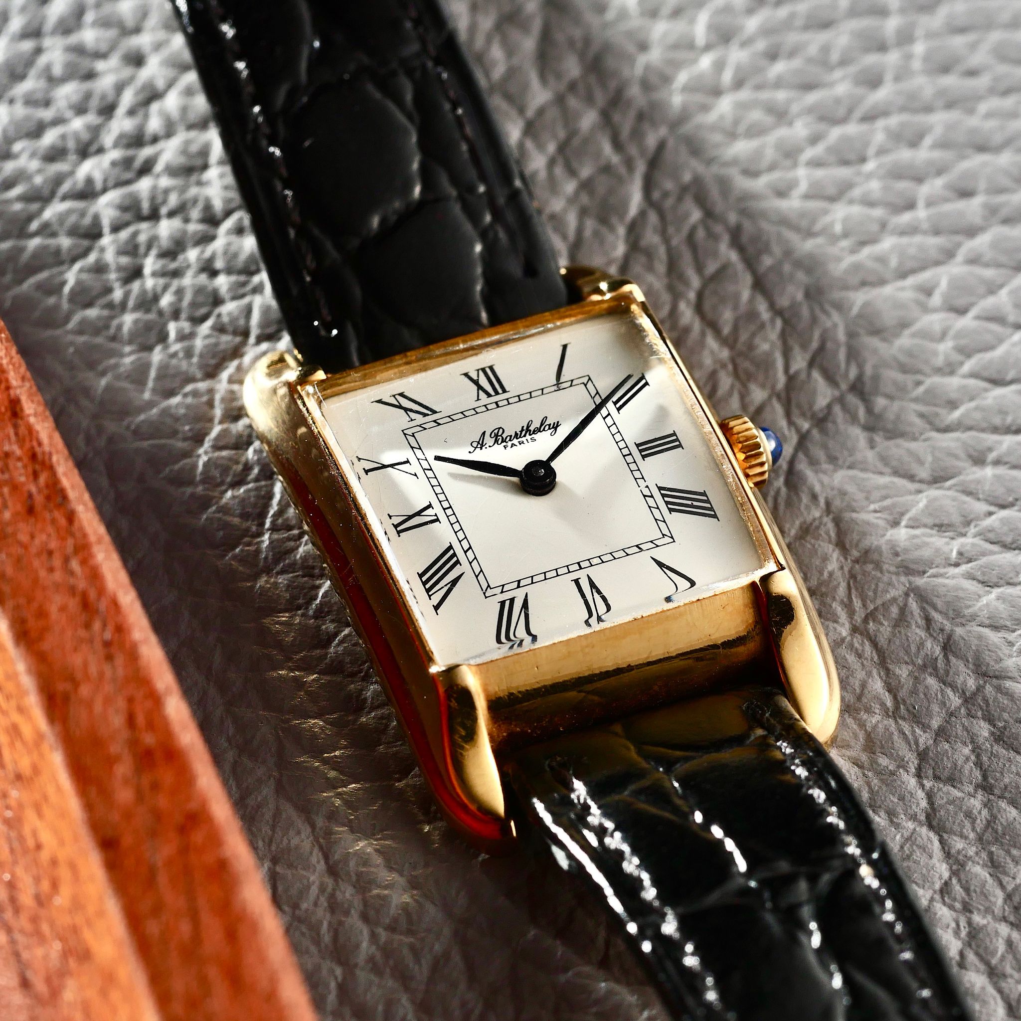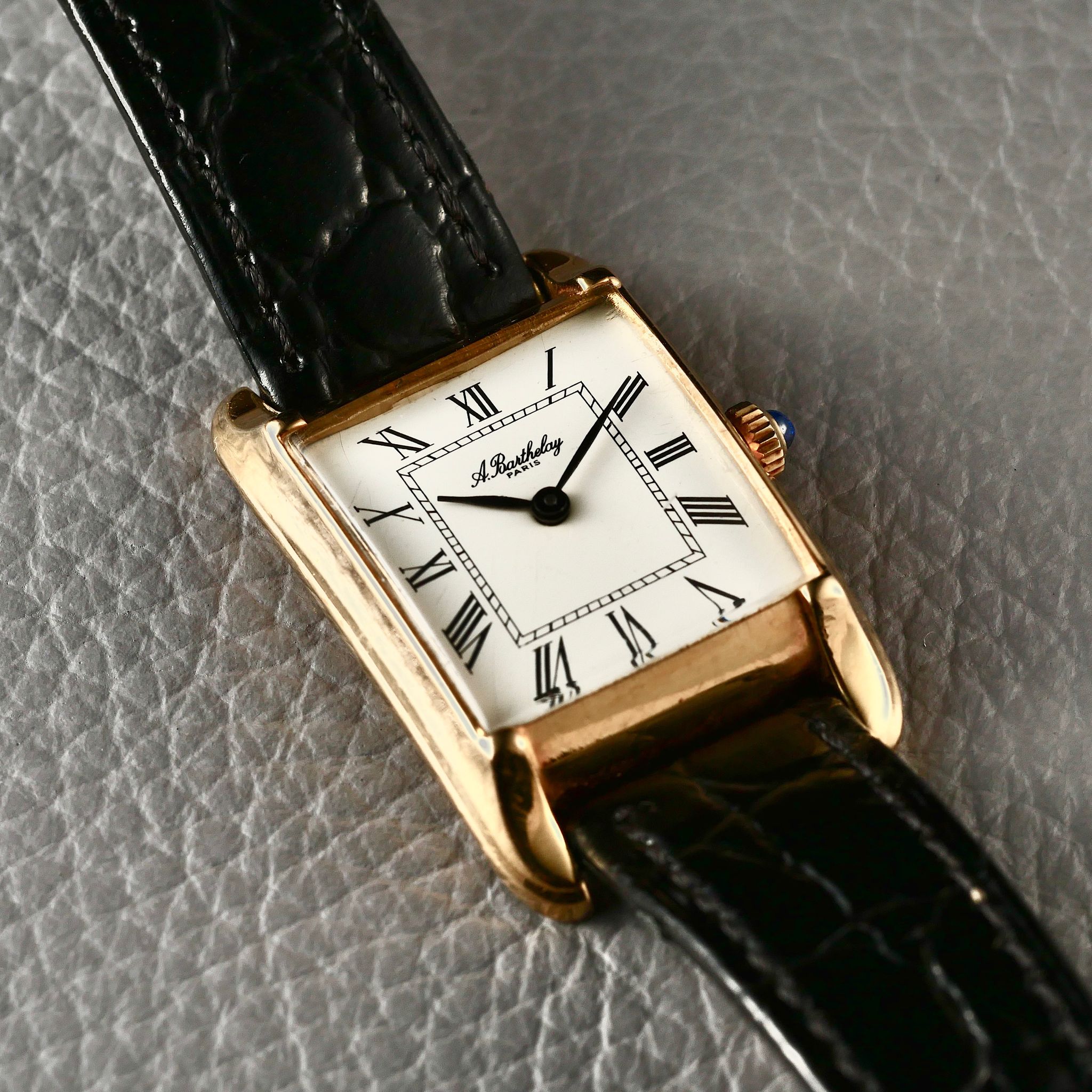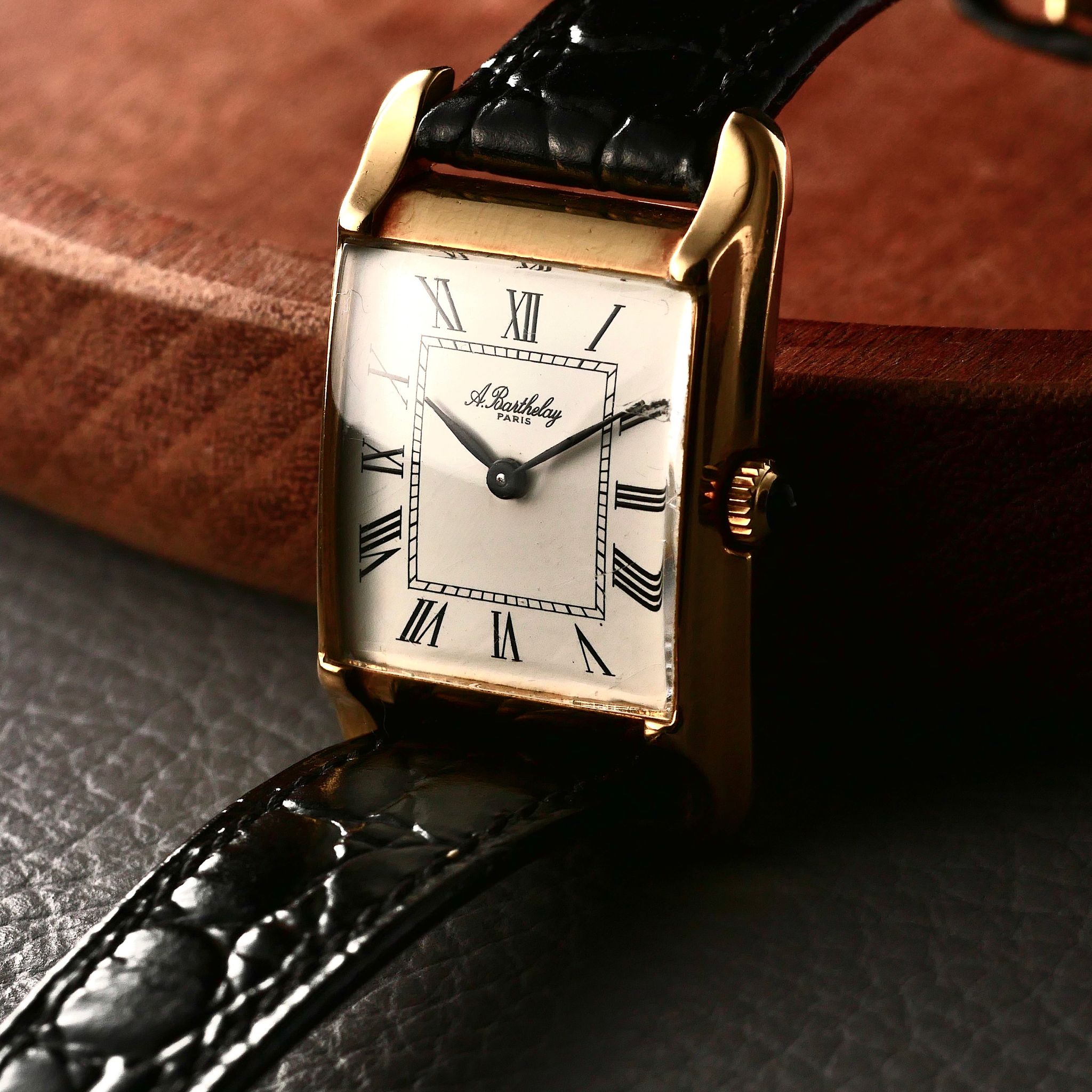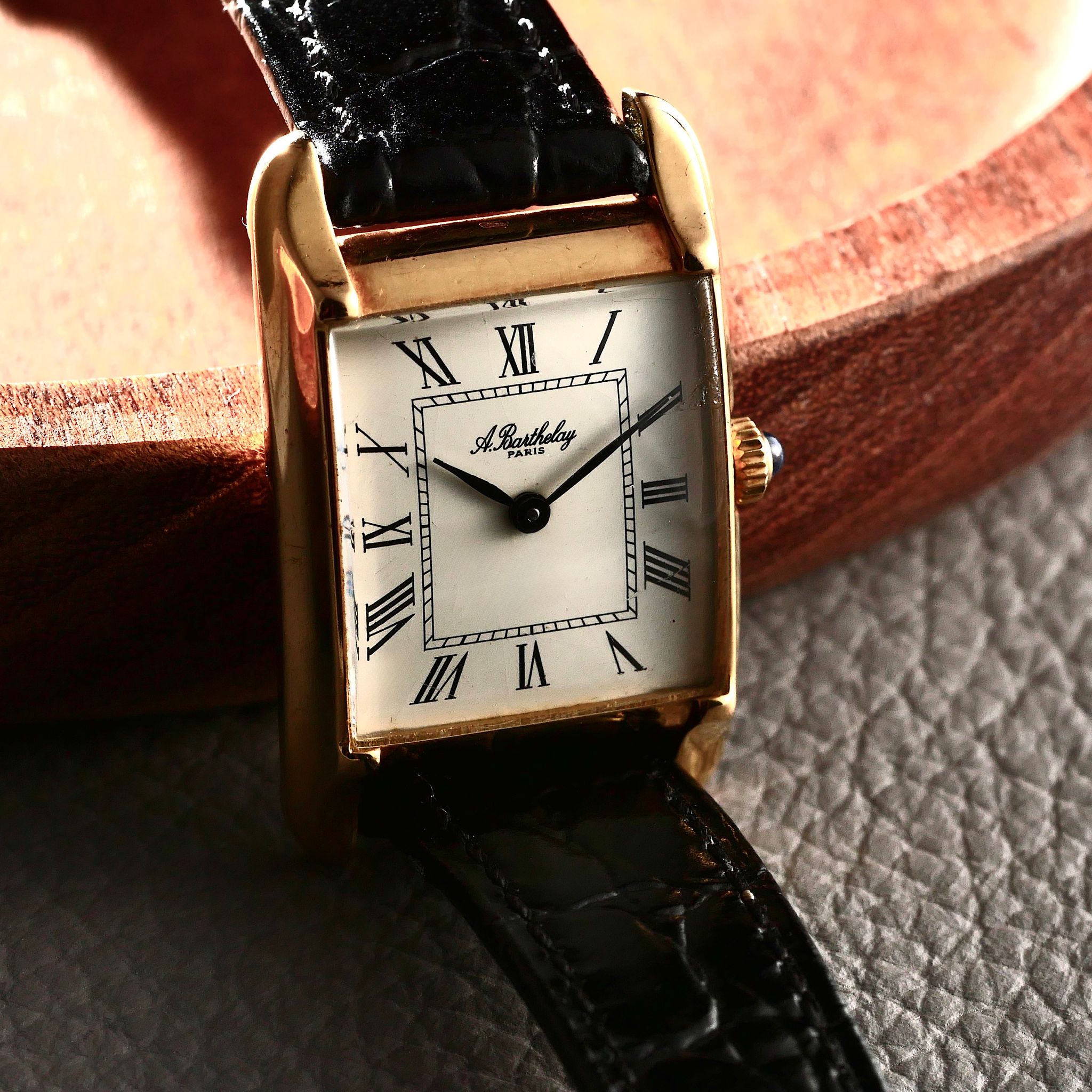 It was during this time of reinvention that one of Barthelay’s most exquisite creations took form. Crafted in 18k yellow gold, the tank-style case featured unique “bec de canard” (duck beak) lugs that gave it a sophisticated silhouette. Sword hands, sharp and precise, glided across the dial and stamped on the back were the hallmarks of France, a quiet assurance that this watch was born of a legacy steeped in artistry and heritage.