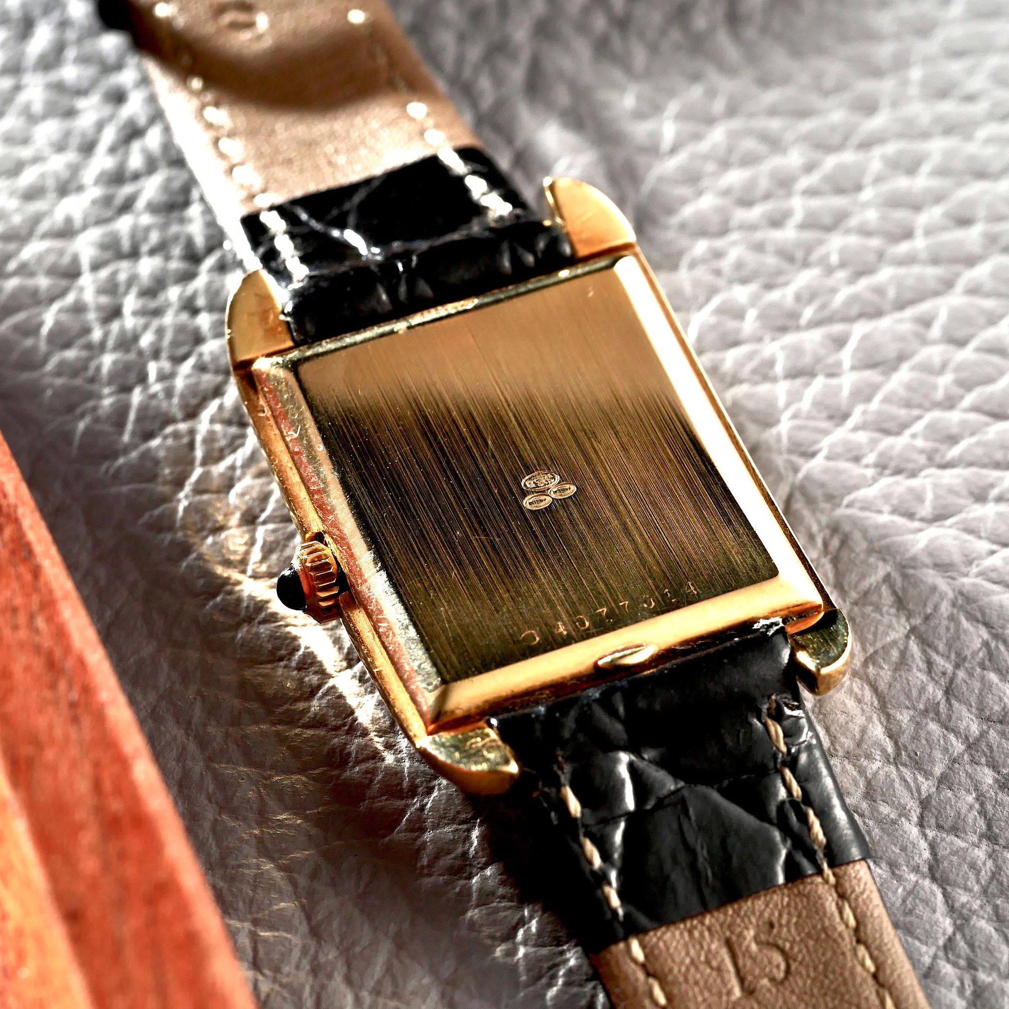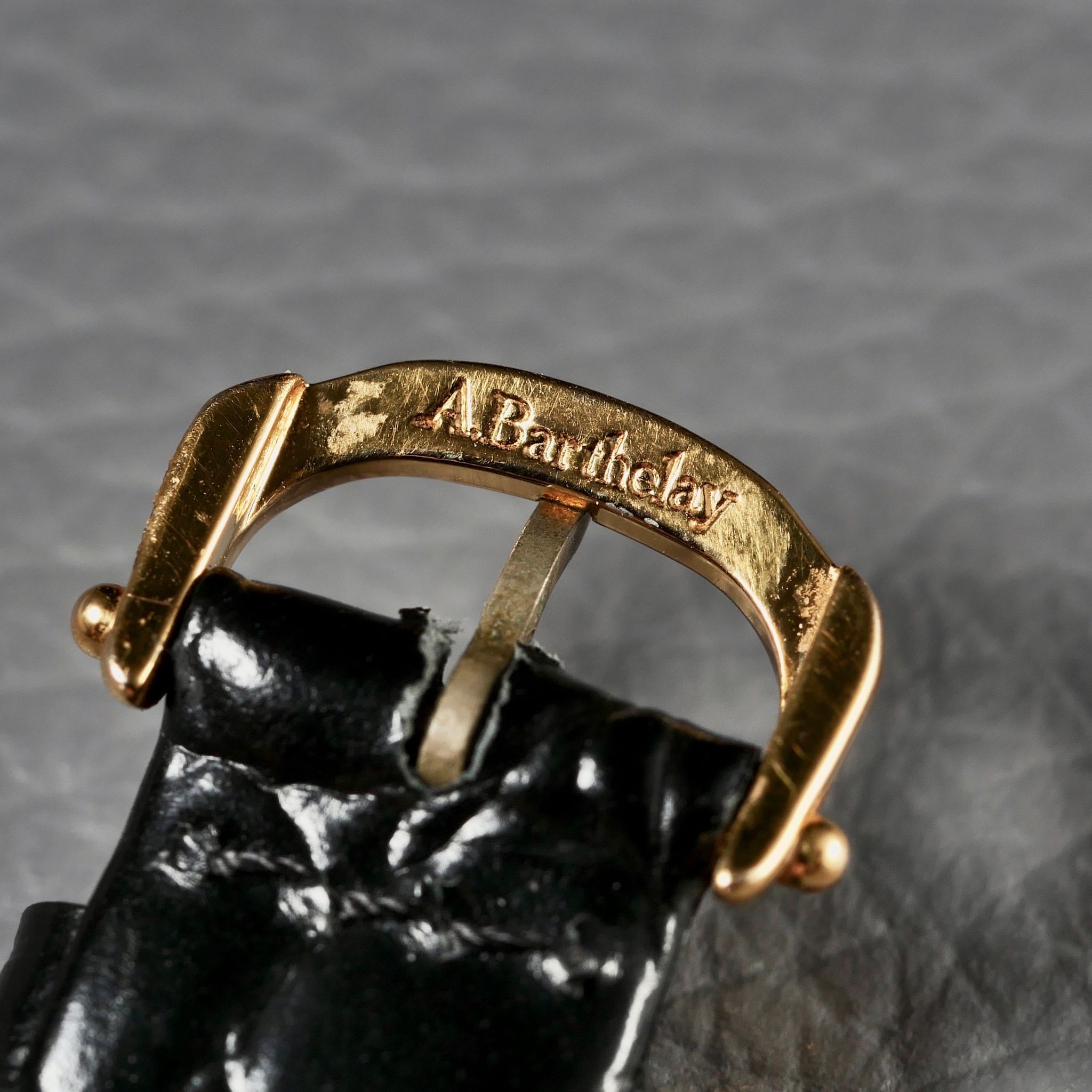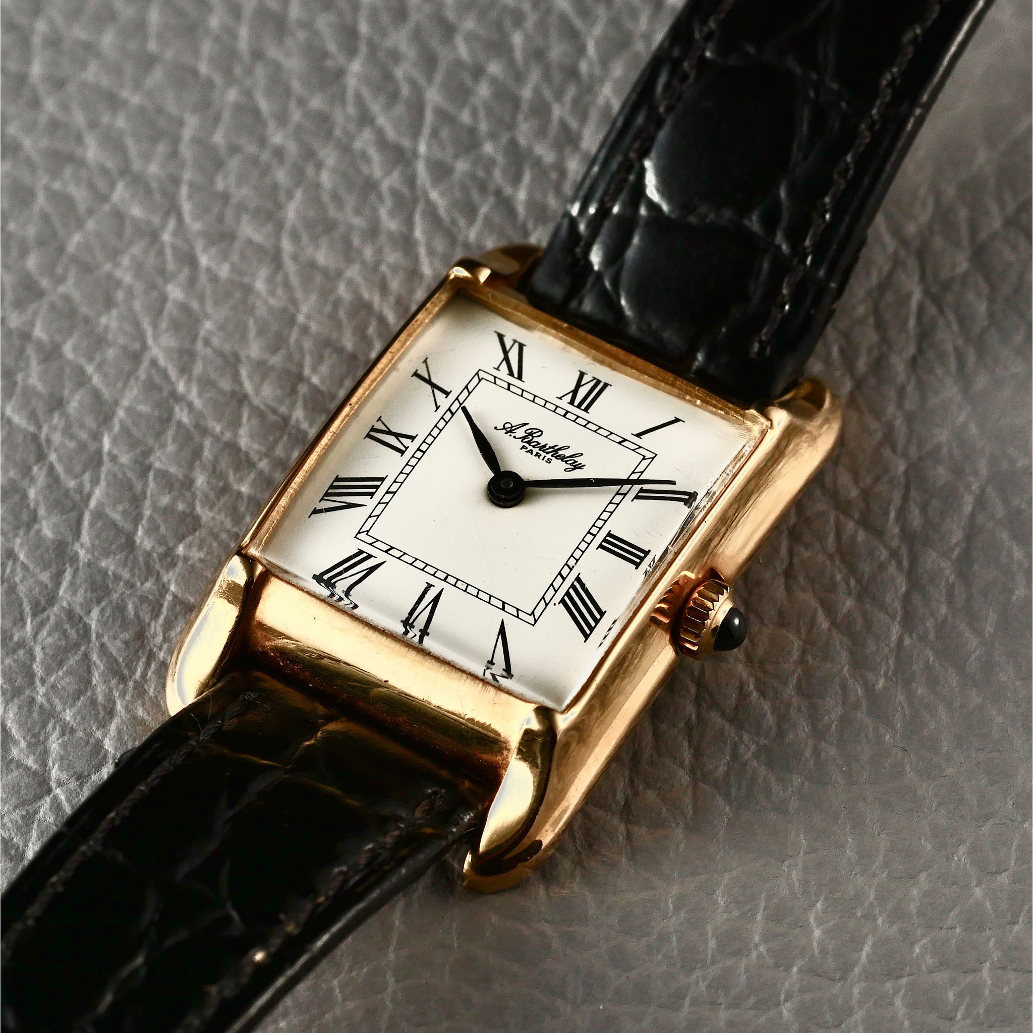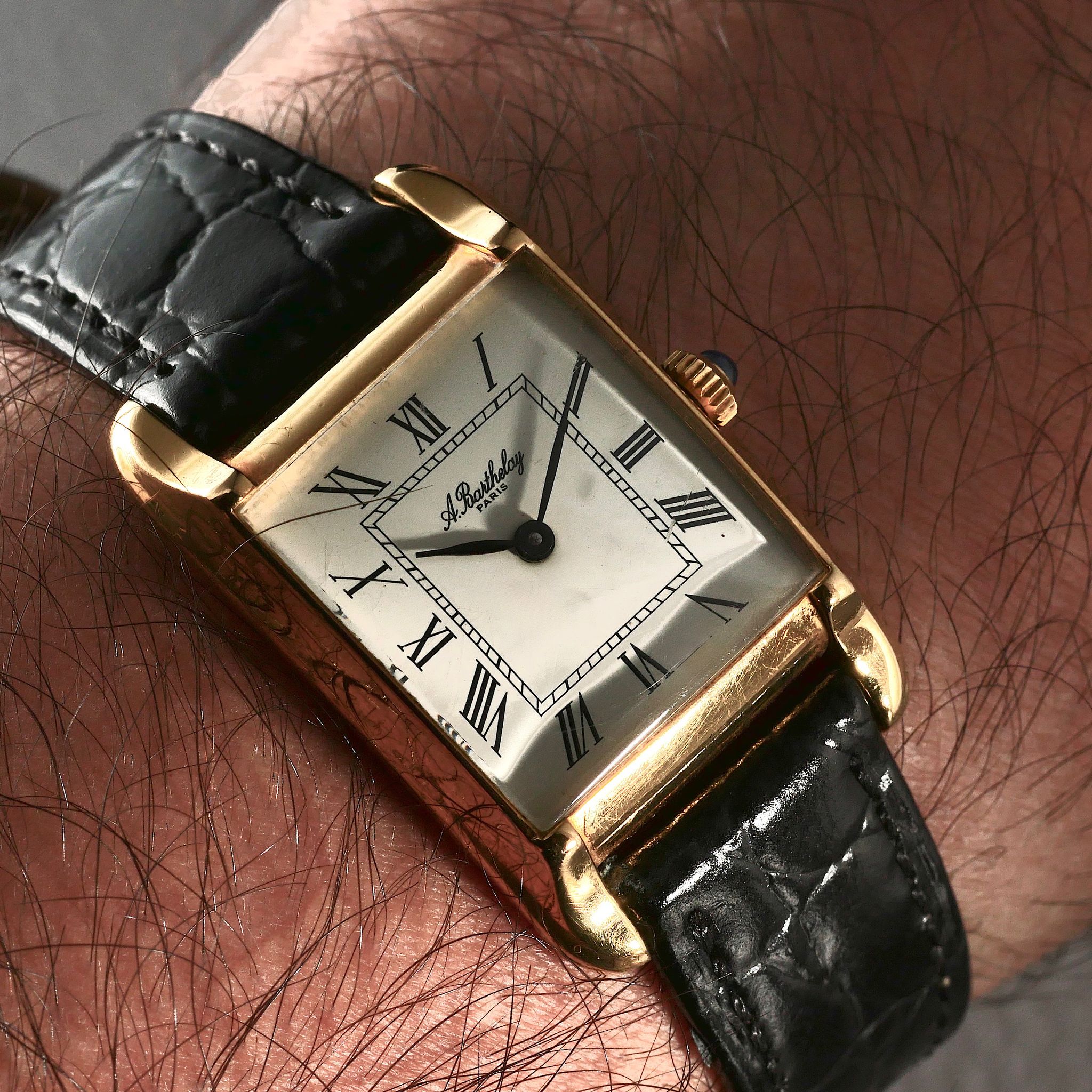 It was during this time of reinvention that one of Barthelay’s most exquisite creations took form. Crafted in 18k yellow gold, the tank-style case featured unique “bec de canard” (duck beak) lugs that gave it a sophisticated silhouette. Sword hands, sharp and precise, glided across the dial and stamped on the back were the hallmarks of France, a quiet assurance that this watch was born of a legacy steeped in artistry and heritage.