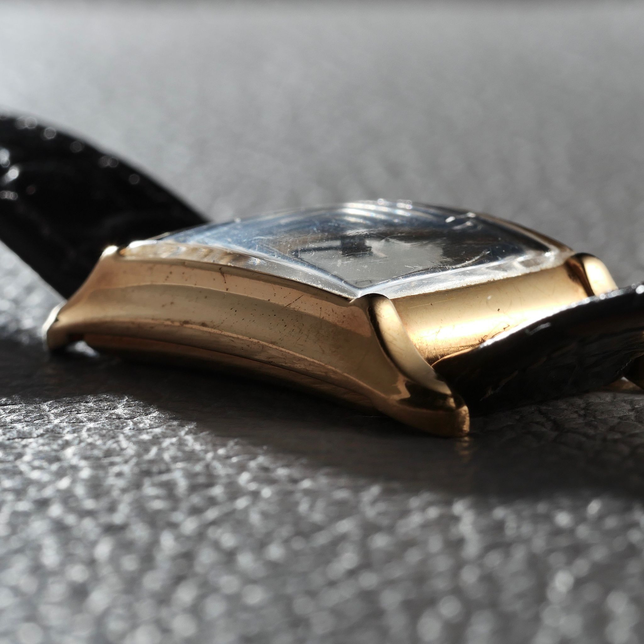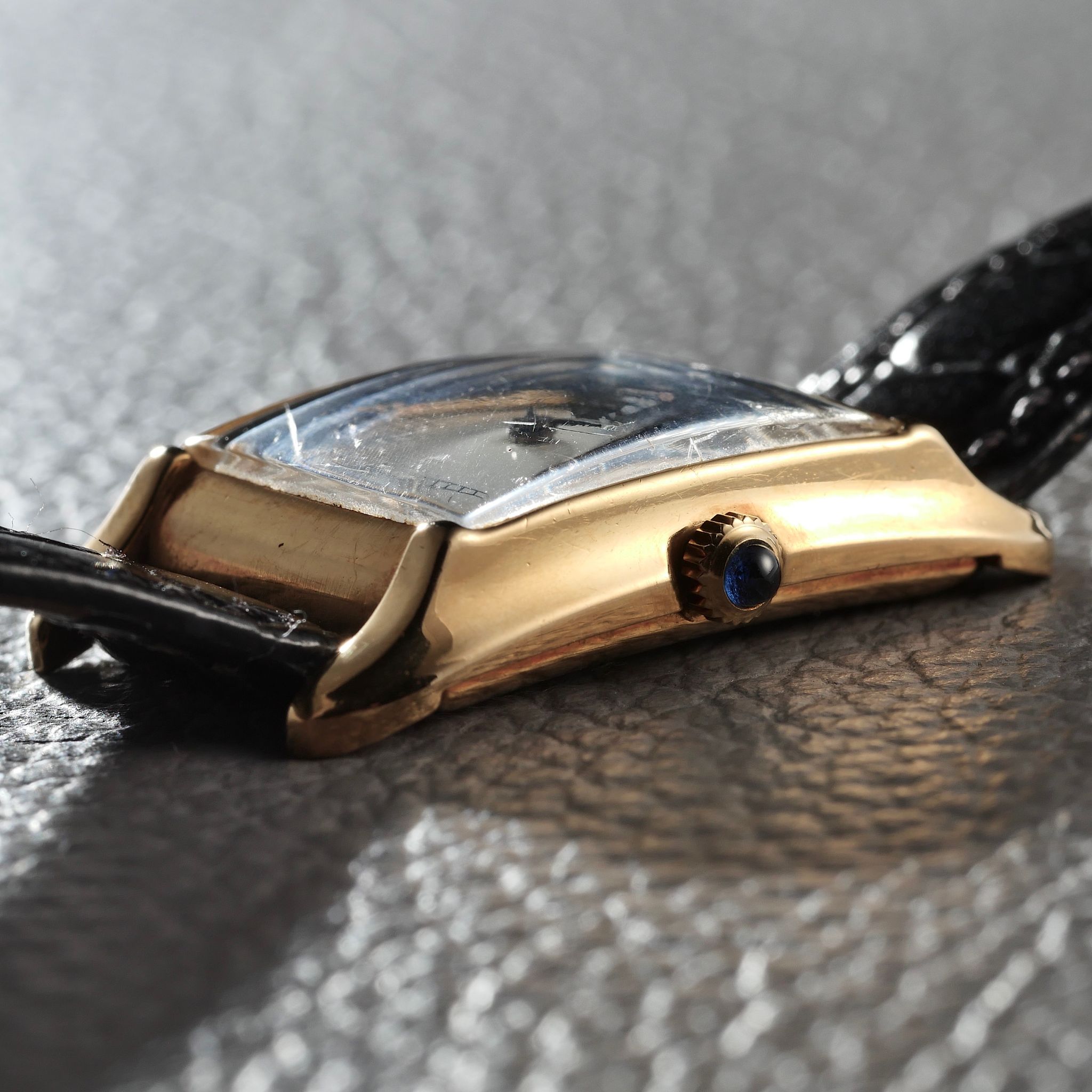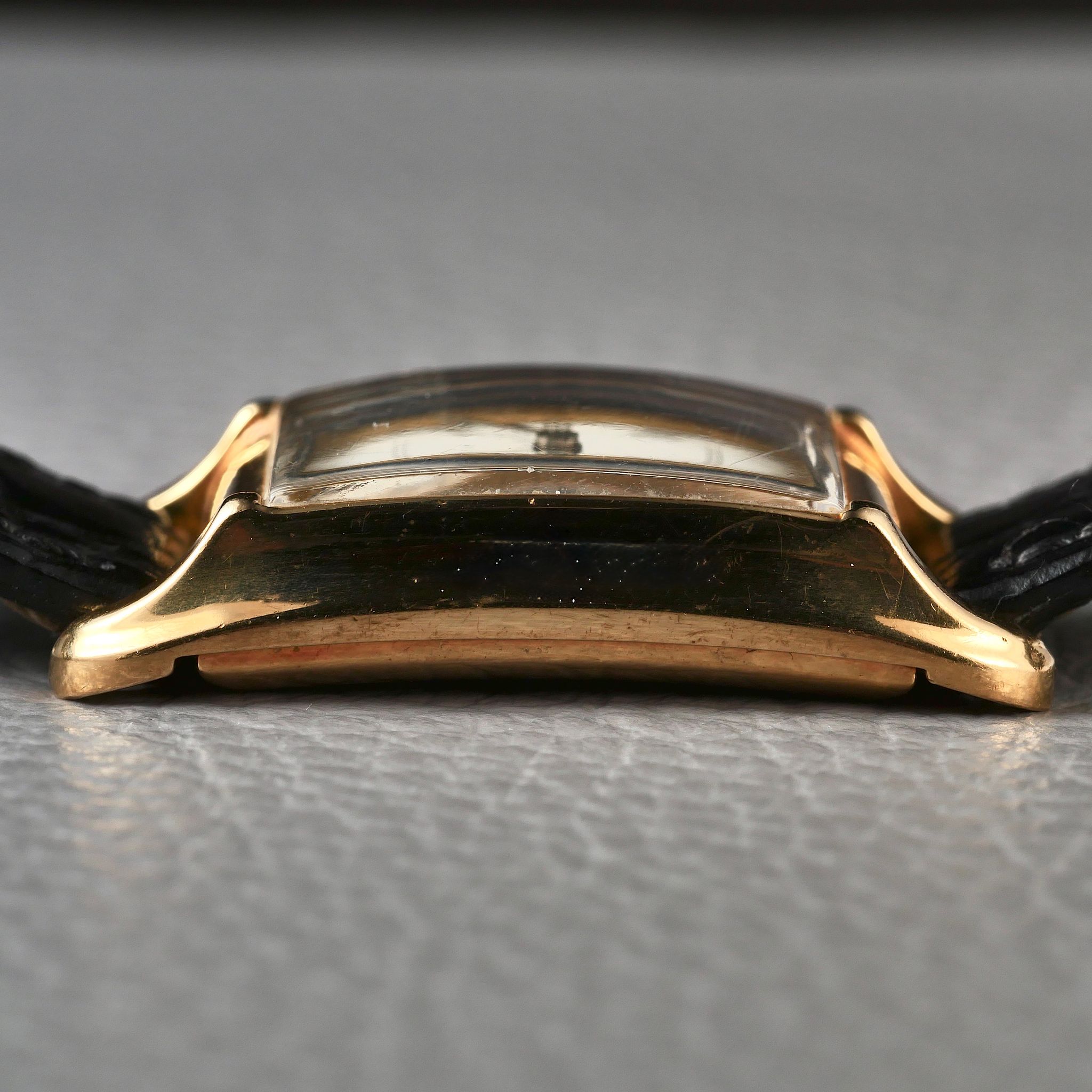 SPECIFICATIONS: 18k Gold tank-style case with “Duck Beak” lugs , Original unrestored dial, non OEM leather strap, 18k Gold OEM buckle.