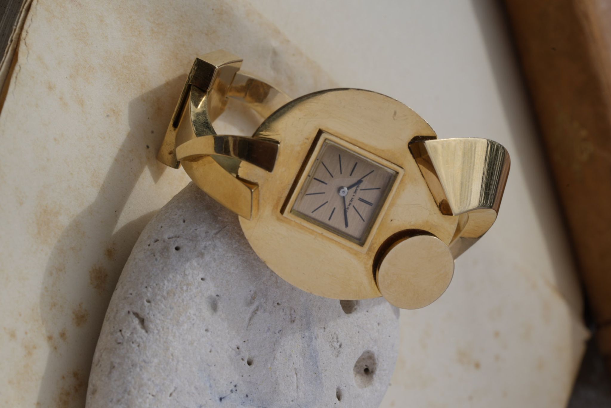 Baume & Mercier from the late 1950s, featuring a heavy French case with a strong modern art character. Weight 86g and fits a 17cm wrist.