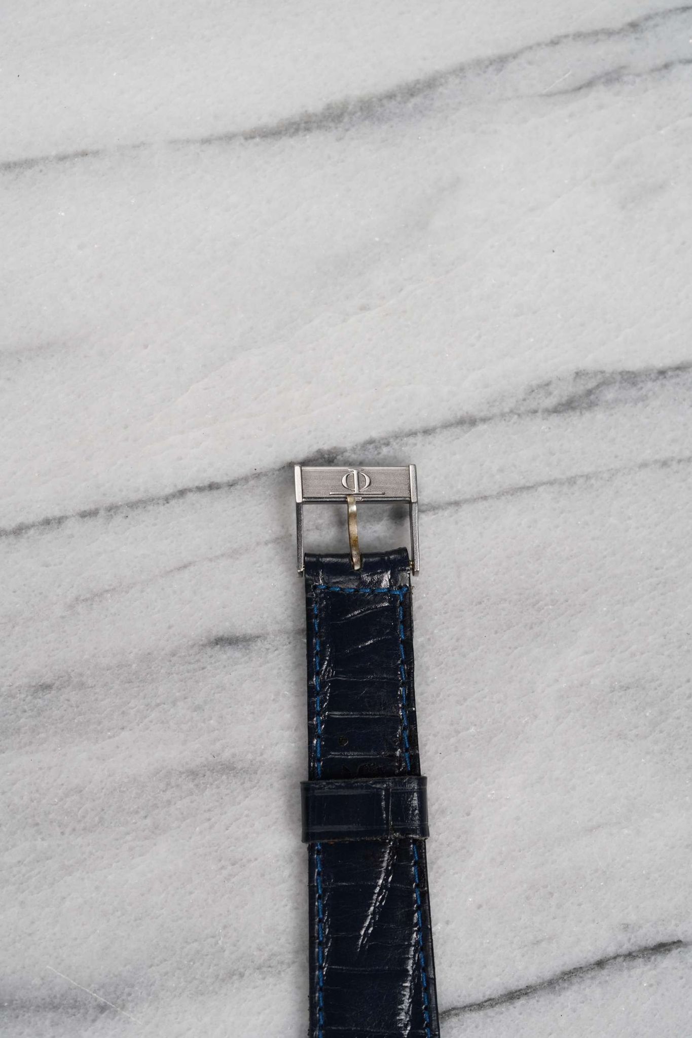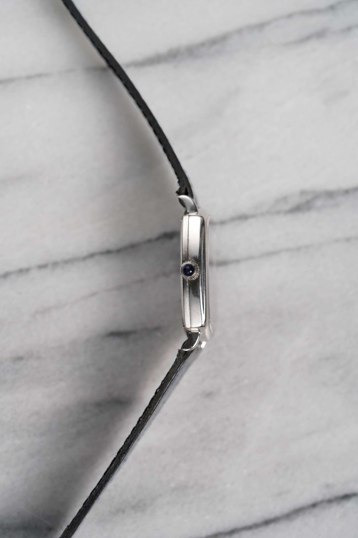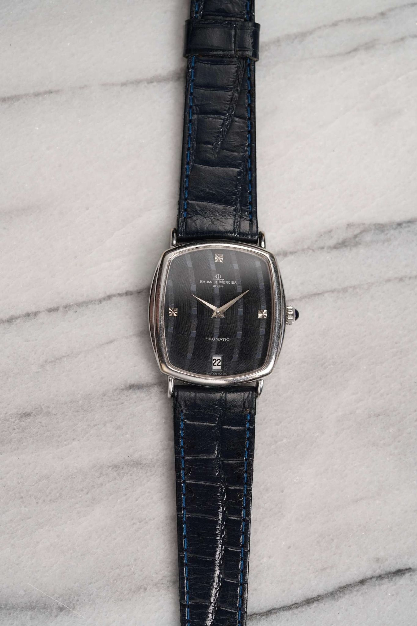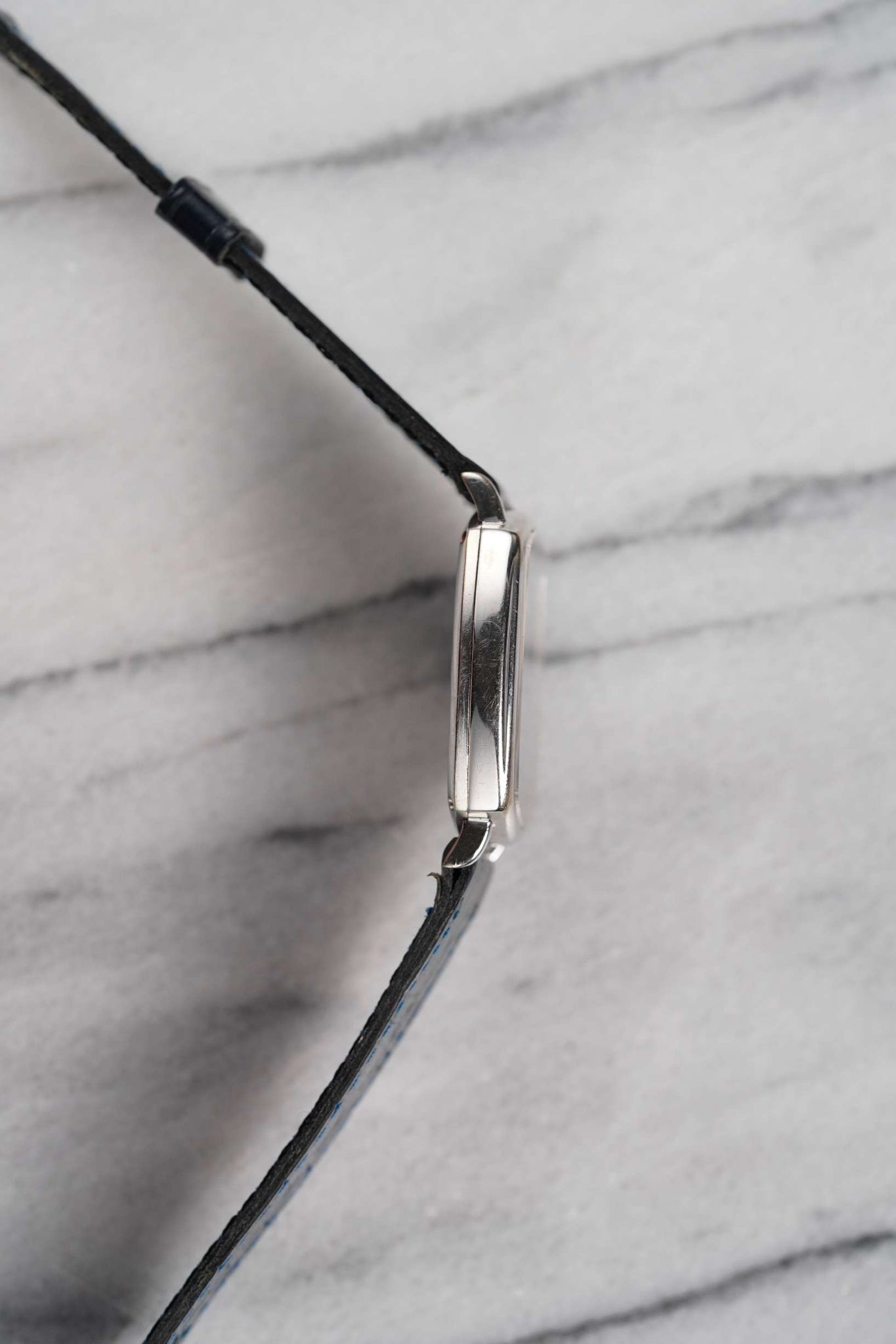 Here's a vintage Baume & Mercier Baumatic tank automatic in 18K white gold with a blackish blue guiloche textured dial from the 1980s. It keeps great time and is fully functional. Measurements include a 25x34mm case and 18mm lug width. Reference 37204. It's on its original black leather strap with matching signed white gold buckle. Time and quickest date function at 6 a clock. Silver dauphine hands. Blue cabochon crown. These tanks are quite uncommon especially in this condition. The dial and the crystal are free from any scratches or marks. The piece has no scratches. A great tank alternative to a more traditional Cartier. All parts are original including the dial, crown, movement, and caseback. Both the dial and case are in great cosmetic, untouched condition.