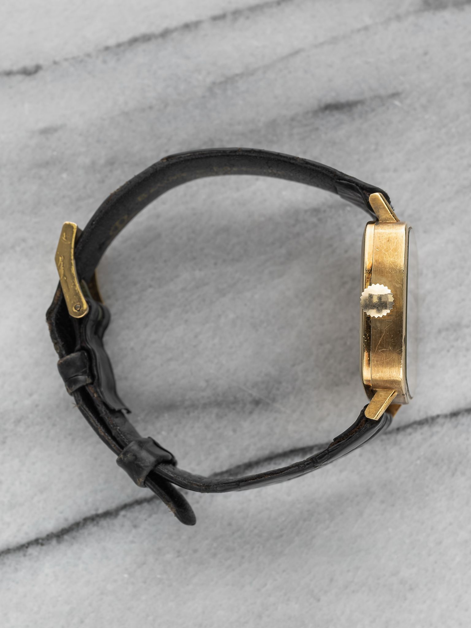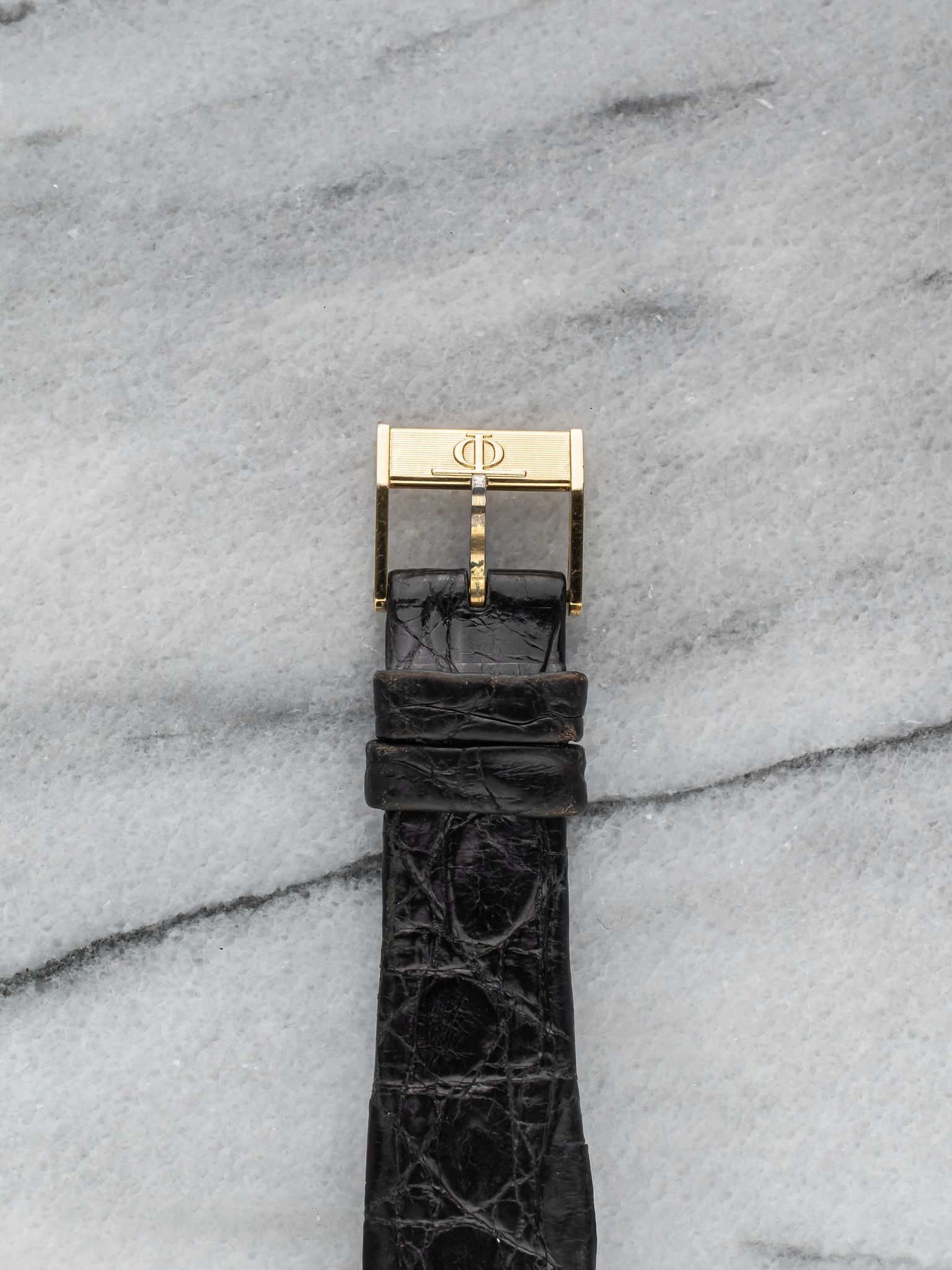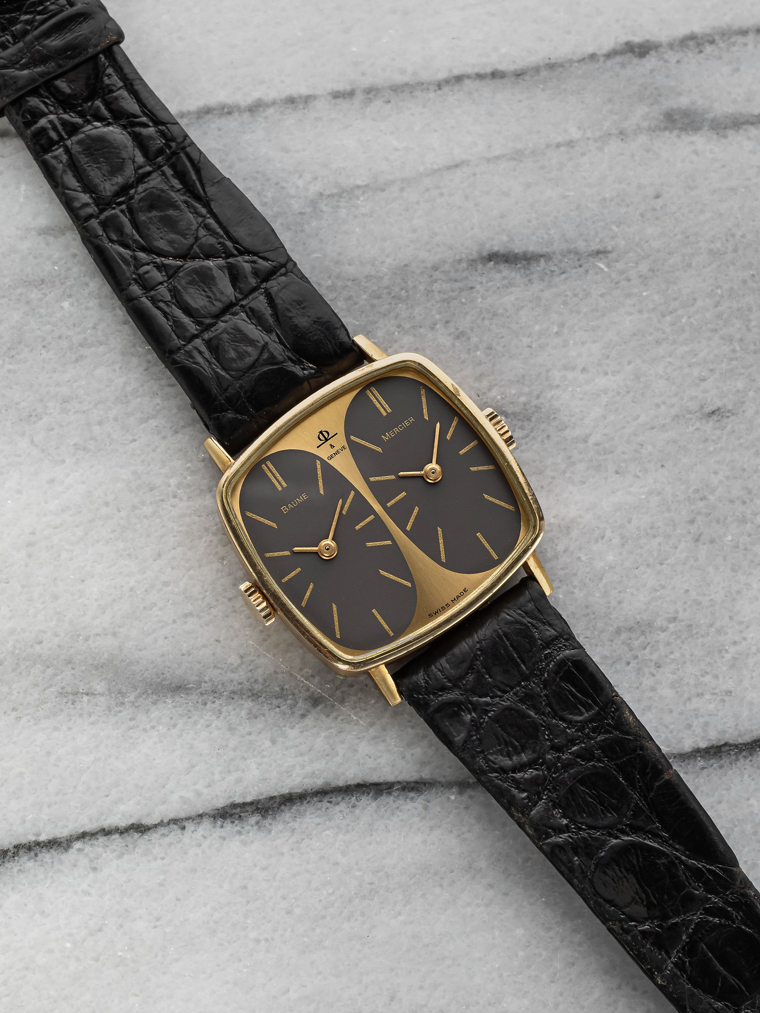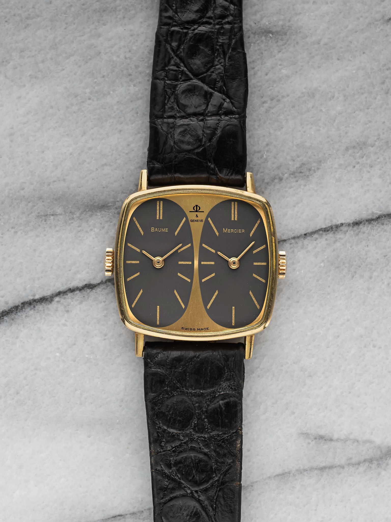 Here’s a vintage Baume & Mercier dual time in 18k yellow gold manual wind with a grey dial from the 1980s. Measurements include around a 34mm case and 18mm lug width. On an aftermarket black lizard leather strap and buckle. Crown at 3 and 9 o’clock. Champagne sub dials with black roman numerals. In honest condition. Original case, dial, bracelet, and movement. Fully functional and keeping time.