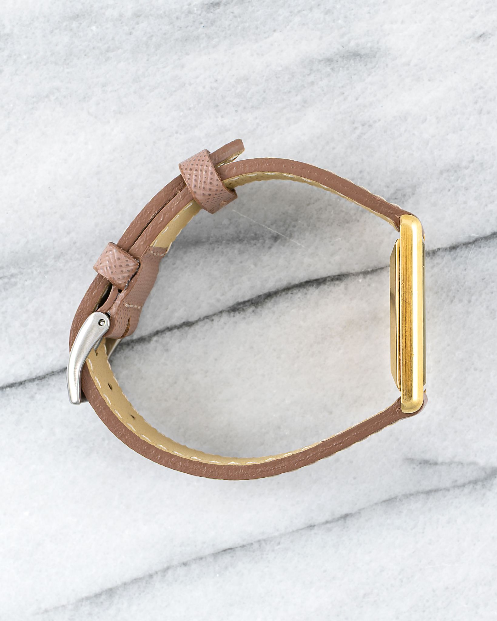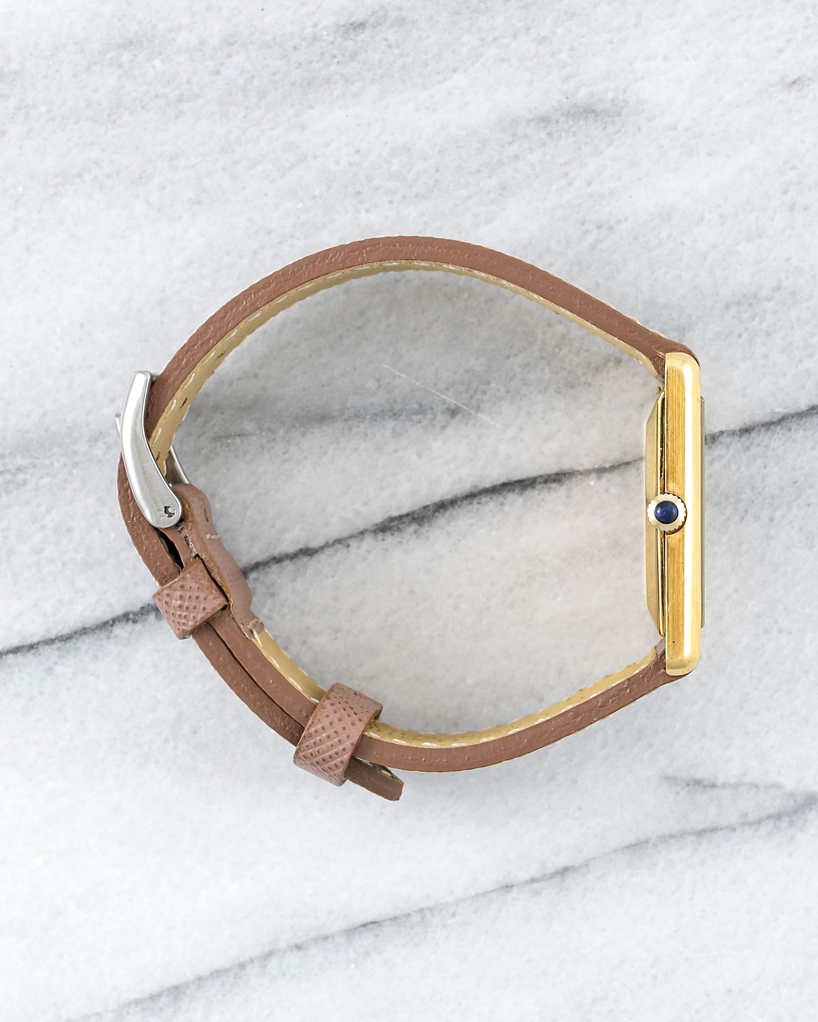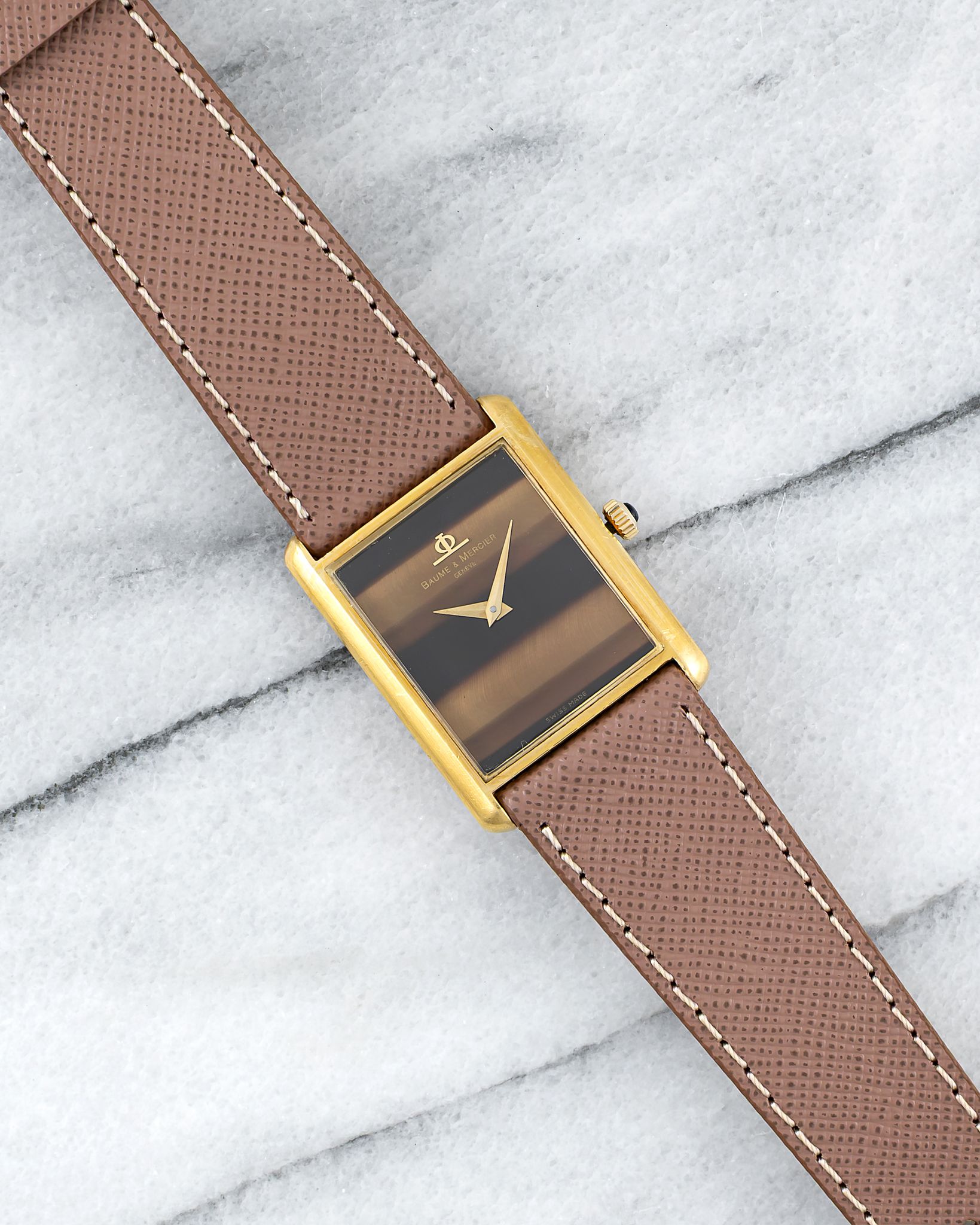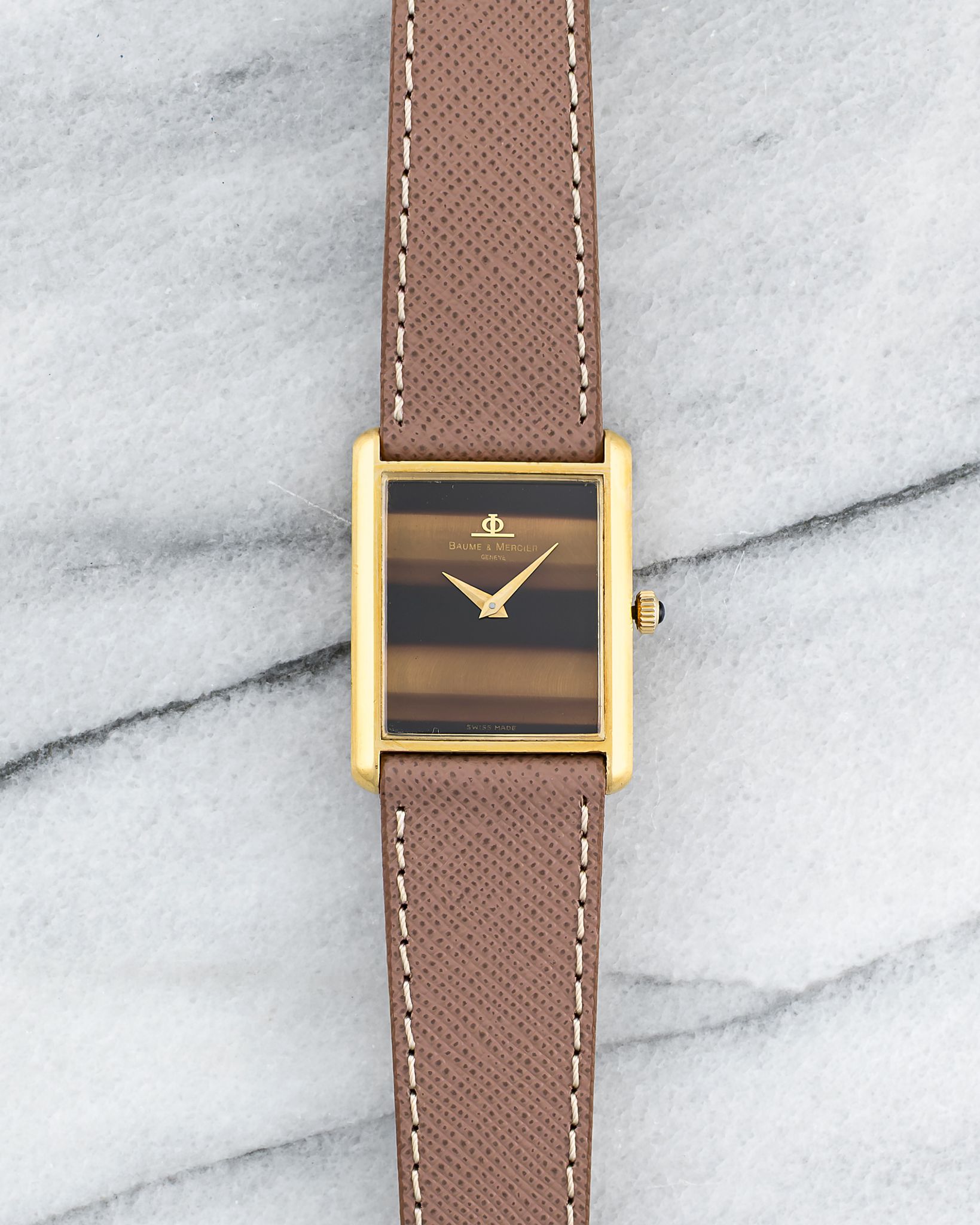 Here's a vintage Baume & Mercier tank manual wind in 18K yellow gold with a brown tiger eye stone dial from the 1970s. It keeps great time and is fully functional. Measurements include a 25mm case and 20mm lug width. It's on an aftermarket grey pebble textured leather strap. Time only. dauphine hands. Blue cabochon crown. These tanks are quite uncommon especially in this condition. The dial and the crystal are free from any scratches or marks. The piece has no scratches. A great tank alternative to a more traditional Cartier. All parts are original including the dial, crown, movement, and caseback. Both the dial and case are in great cosmetic, untouched condition.
